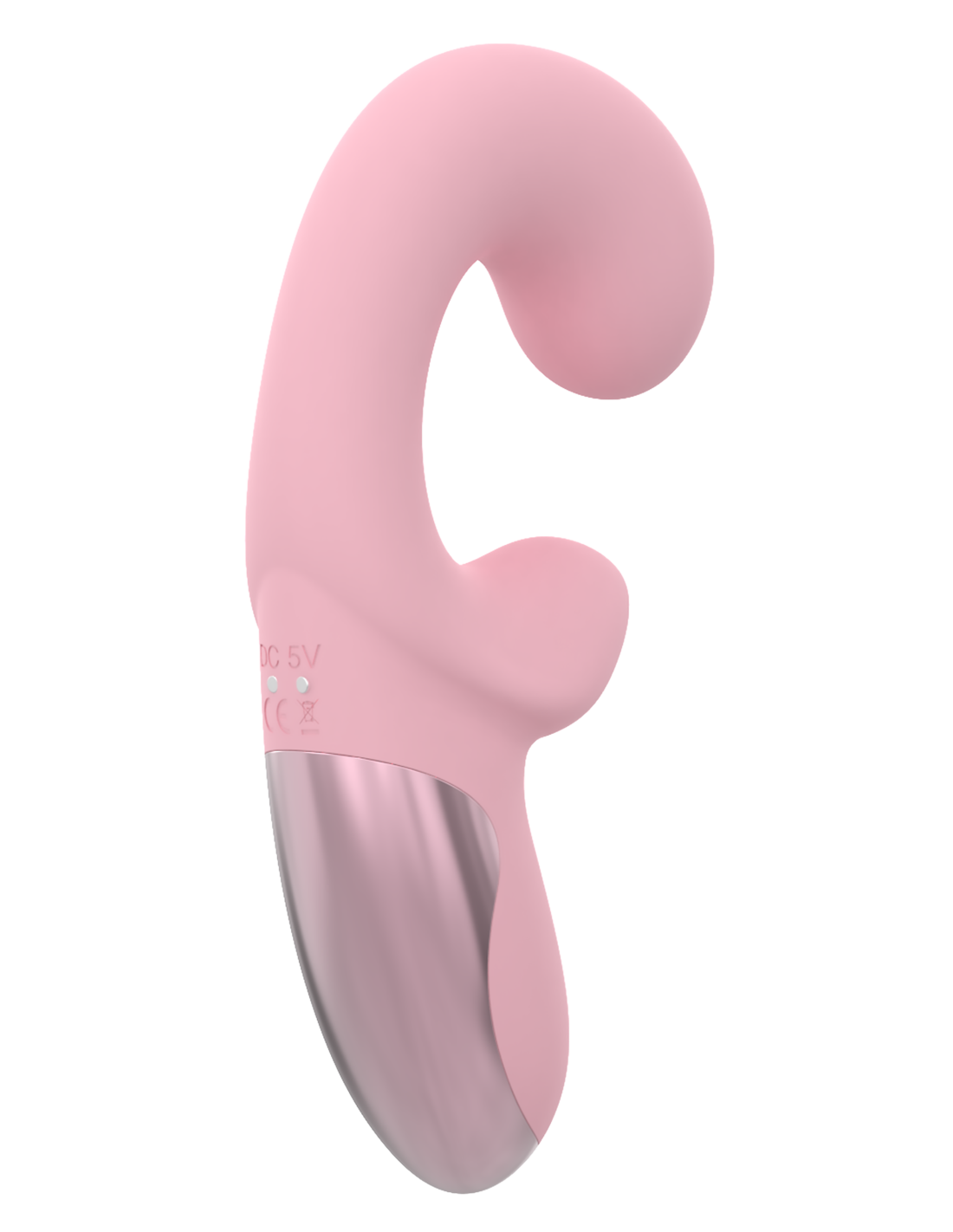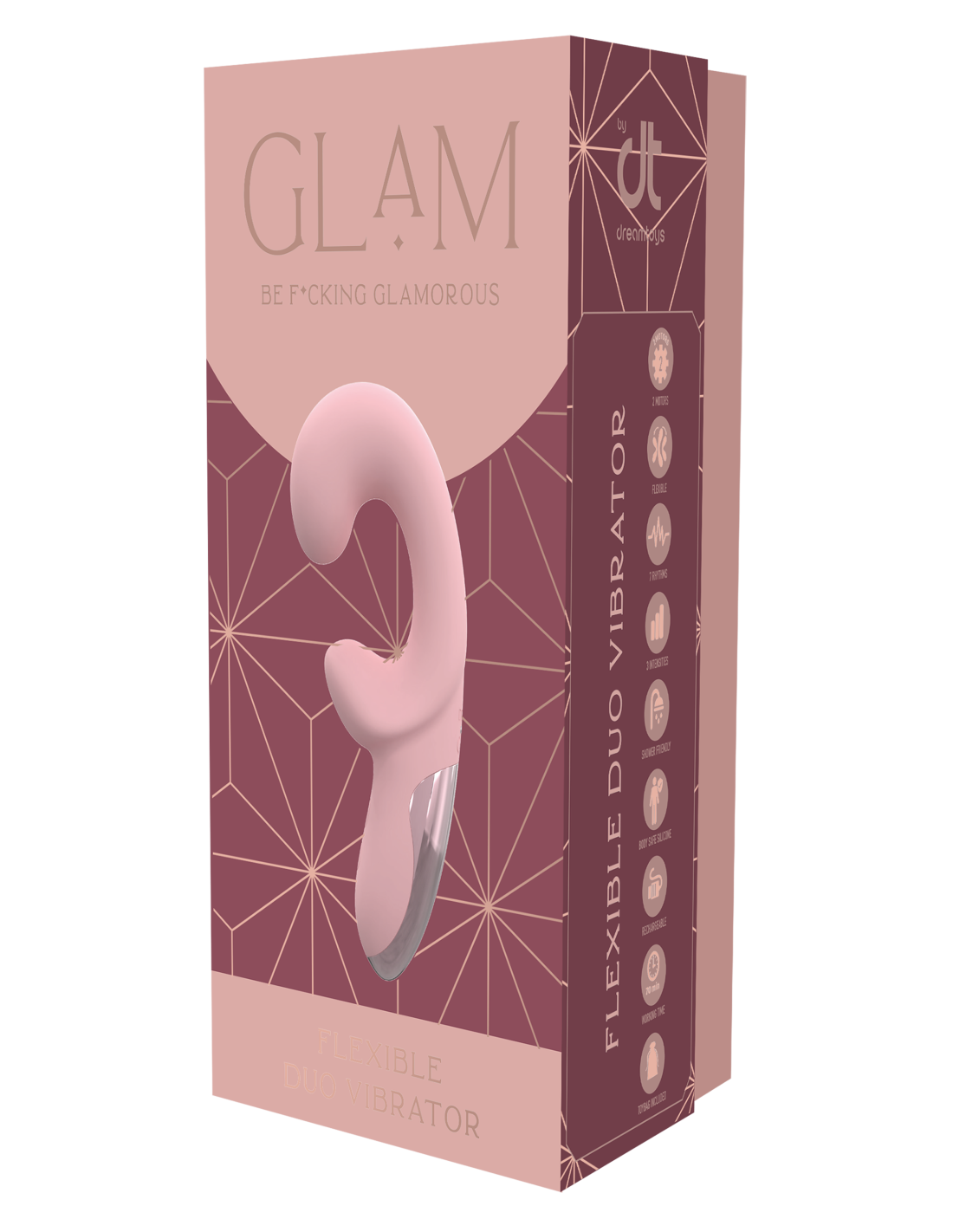 Vibrador dúo con shaft flexible. este vibrador de dúo flexible Glam tiene 3 velocidades de vibración y 7 ritmos en el cuerpo principal y 3 velocidades de vibración y 7 ritmos en el estimulador de clítoris. Para facilitar su uso, hay botones separados para controlar las funciones del cuerpo principal y las del estimulador de clítoris. El Glam vibe es apto para la ducha, está hecho de materiales seguros para el cuerpo y es recargable con el cable USB magnético incluido.