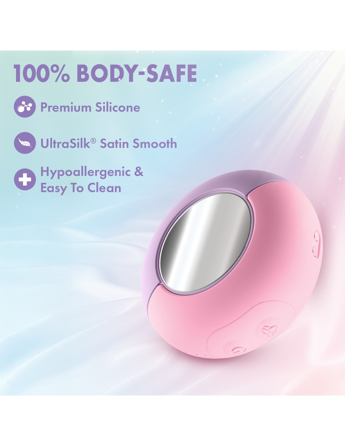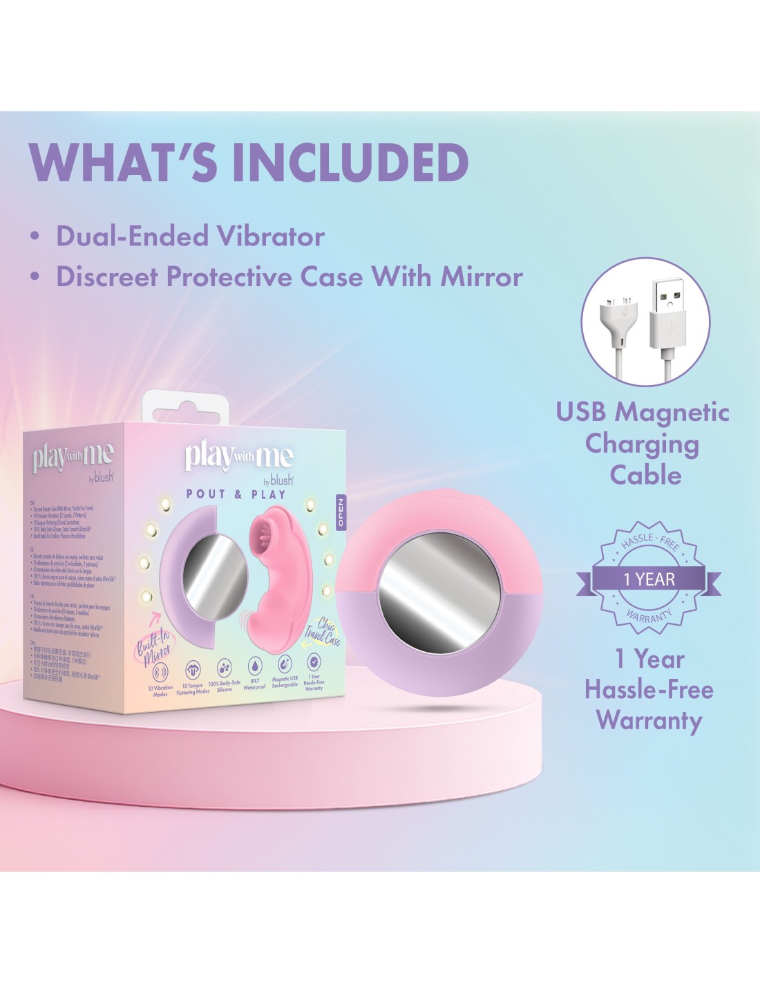 Revel en placer y estilo con Play With Me Pout & Play. Disfrazado como un elegante estuche de belleza completo con un espejo incorporado, este elegante y coqueto vibrador de doble punta está diseñado para momentos de pura indulgencia dondequiera que estés. Un extremo cuenta con una punta de precisión que es perfect para la estimulación del punto G, mientras que el otro ofrece sensaciones de aleteo inspiradas en la lengua para el juego del clítoris, cada una con 10 configuraciones personalizables para adaptarse a cada desire. Elaborado con silicona premium segura para el cuerpo y acabado con nuestro toque UltraSilk® característico, Pout & Play se desliza sin esfuerzo contra la piel para una experiencia suave y sensual. Su diseño resistente al agua IPX7 permite posibilidades lúdicas más allá del dormitorio, y la función recargable por USB garantiza que siempre esté listo cuando usted lo esté. Discreto, portátil e irresistiblemente elegante, Pout & Play es esencial para un placer que se adapta perfectamente a tu estilo de vida.