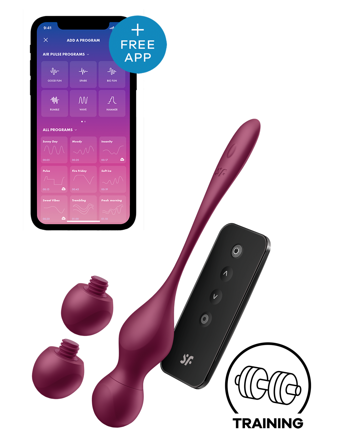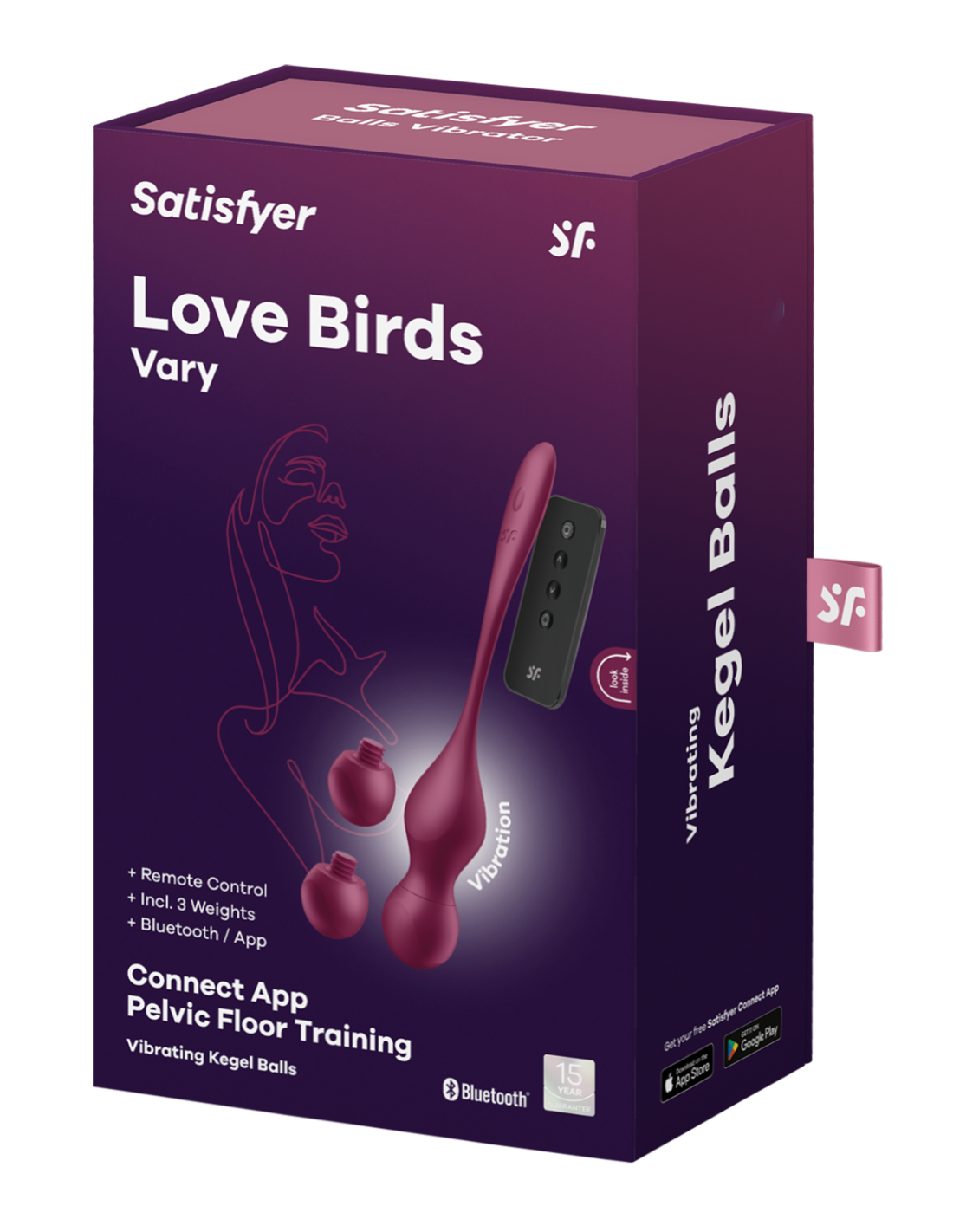 El Satisfyer Love Birds Vary te mima con fuertes vibraciones durante tu entrenamiento del suelo pélvico y viene con 2 pesos adicionales. Perfect para un entrenamiento largo y placentero! El Satisfyer Love Birds Vary está hecho con curvas suaves y silicona agradable para la piel. Gracias a su atractivo tamaño y diseño ergonómico, son fáciles de insertar y quitar gracias a la correa de retorno con botón de un solo toque en el extremo. Elige entre 3 pesos diferentes que puedes cambiar fácilmente según tu nivel de entrenamiento. Las Love Balls están disponibles en 29, 35 y 43 gramos: elige el peso más ligero para empezar y poco a poco va subiendo hasta llegar al más pesado. ¡Tu punto G también disfrutará del masaje estimulante y se beneficiará de los sensuales ejercicios del suelo pélvico! Con el mando a distancia incluido puedes controlar fácilmente las bolas de amor vibradoras: un total de 12 programas te esperan para mostrarte lo que pueden hacer. La aplicación gratuita Satisfier Connect te ofrece infinitas opciones. ¡Usa los controles de la aplicación y combina tu entrenamiento del suelo pélvico con un placer impresionante!