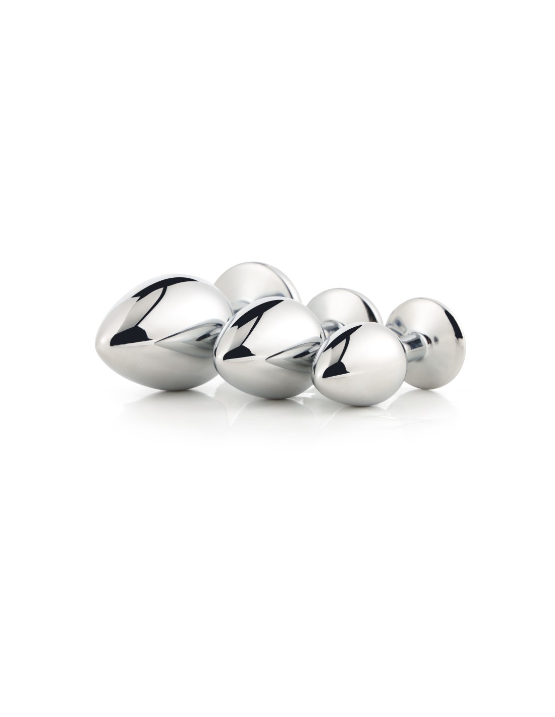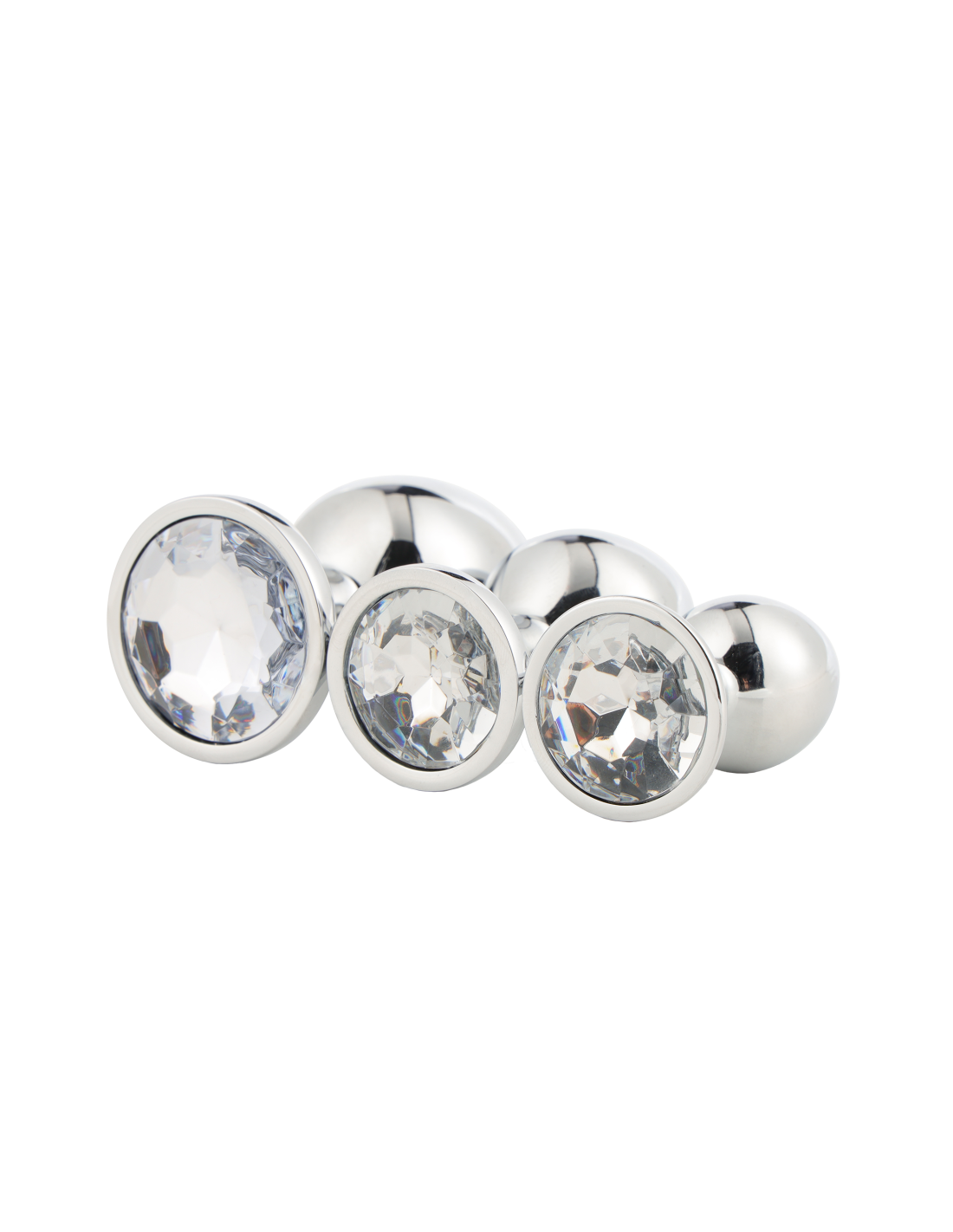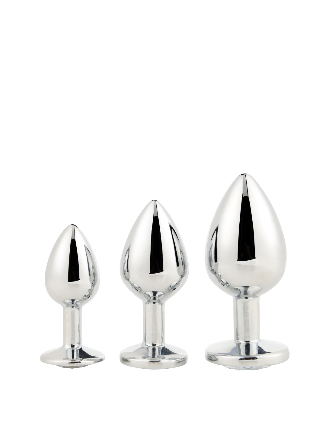 La colección Gleaming Love presenta este set de plugs anales brillantes en 3 tamaños, cada uno con una piedra preciosa. Hechos de aluminio suave y liviano y sin costuras, estos juguetes de placer son fáciles de deslizar y la base acampanada garantiza una sensación de seguridad mientras mantiene la joya cómodamente colocada entre las nalgas.