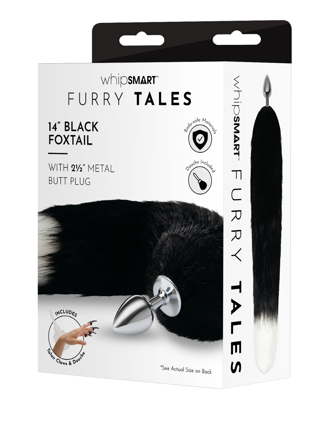 Da vida a tus fantasías más salvajes con el whipsmart cola de zorro negra de 14" con tapón anal metálico de 2,5". Hecho de metal elegante, este pequeño tapón es perfect para principiantes y también incluye una ducha fácil de usar para mayor comodidad higiénica. El enchufe se puede calentar o enfriar para jugar con la temperatura. Disfruta de un juego sensorial adicional con las garras de garra incluidas.