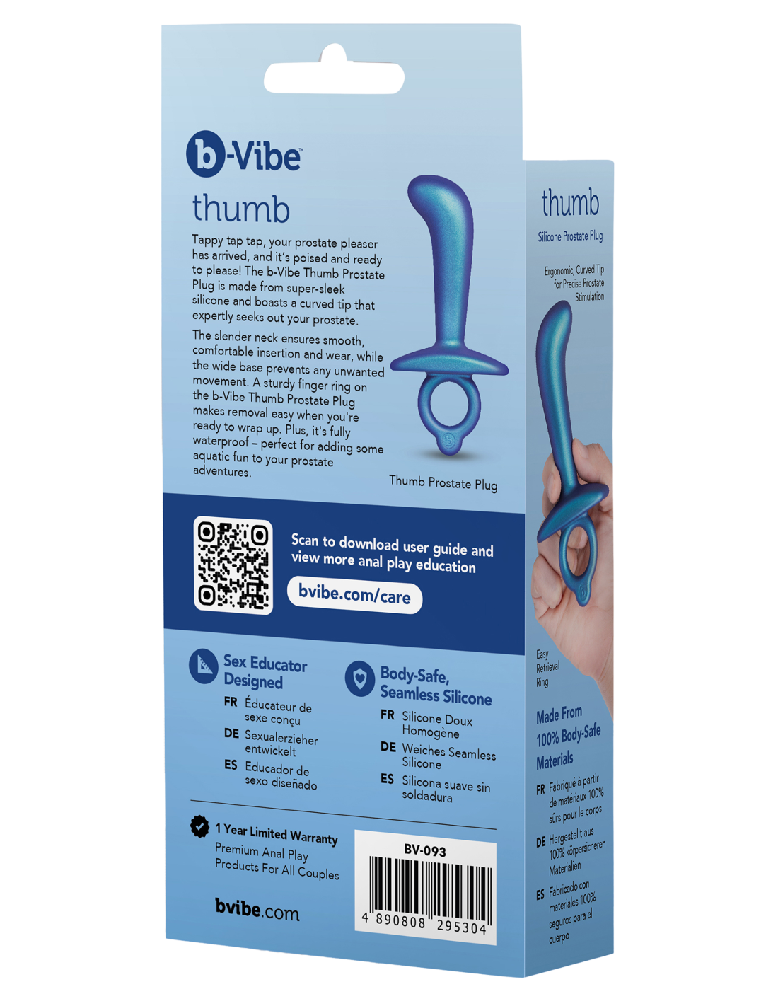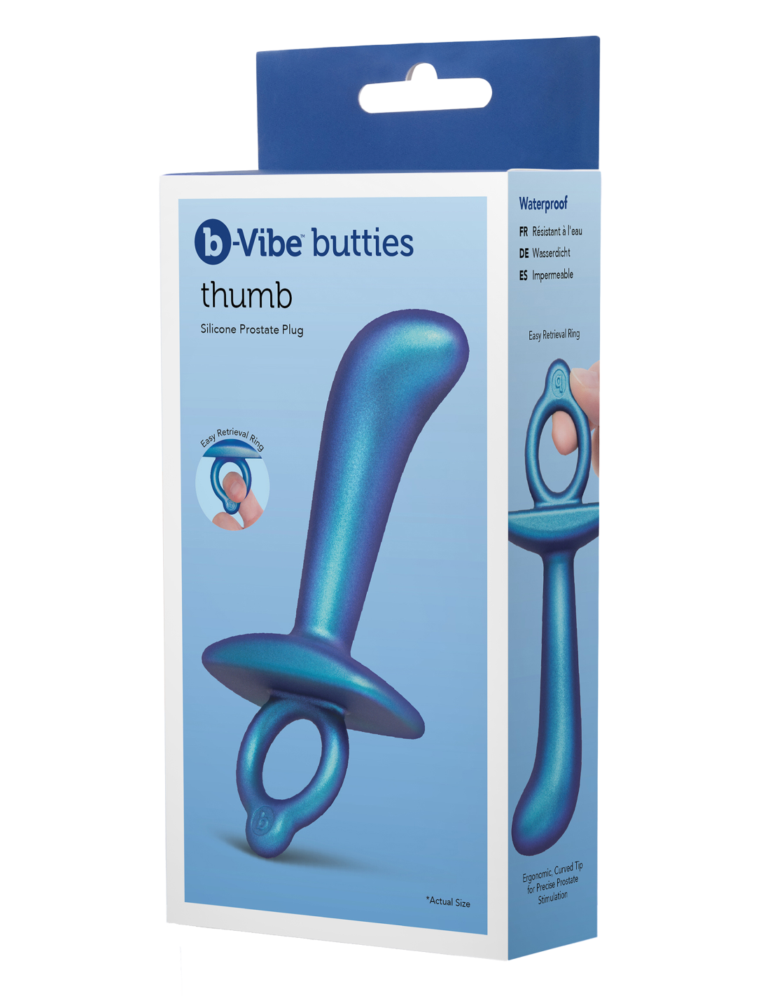 Tappy tap tap, tu complaciente próstata ha llegado, ¡y está listo y listo para complacer! El tapón para la próstata b-Vibe Butties Thumb está hecho de silicona súper elegante y cuenta con una punta curva que busca la próstata de manera experta. El cuello delgado garantiza una inserción y un uso suaves y cómodos, mientras que la base ancha evita cualquier movimiento no deseado. Un anillo de dedo resistente en el tapón para la próstata del pulgar de b-Vibe Butties facilita la extracción cuando está listo para envolverse. Además, como todos los tapones anales Butties, el tapón prostático para el pulgar es totalmente resistente al agua, lo que lo hace perfect para agregar un poco de diversión aquatic a sus aventuras de próstata.
