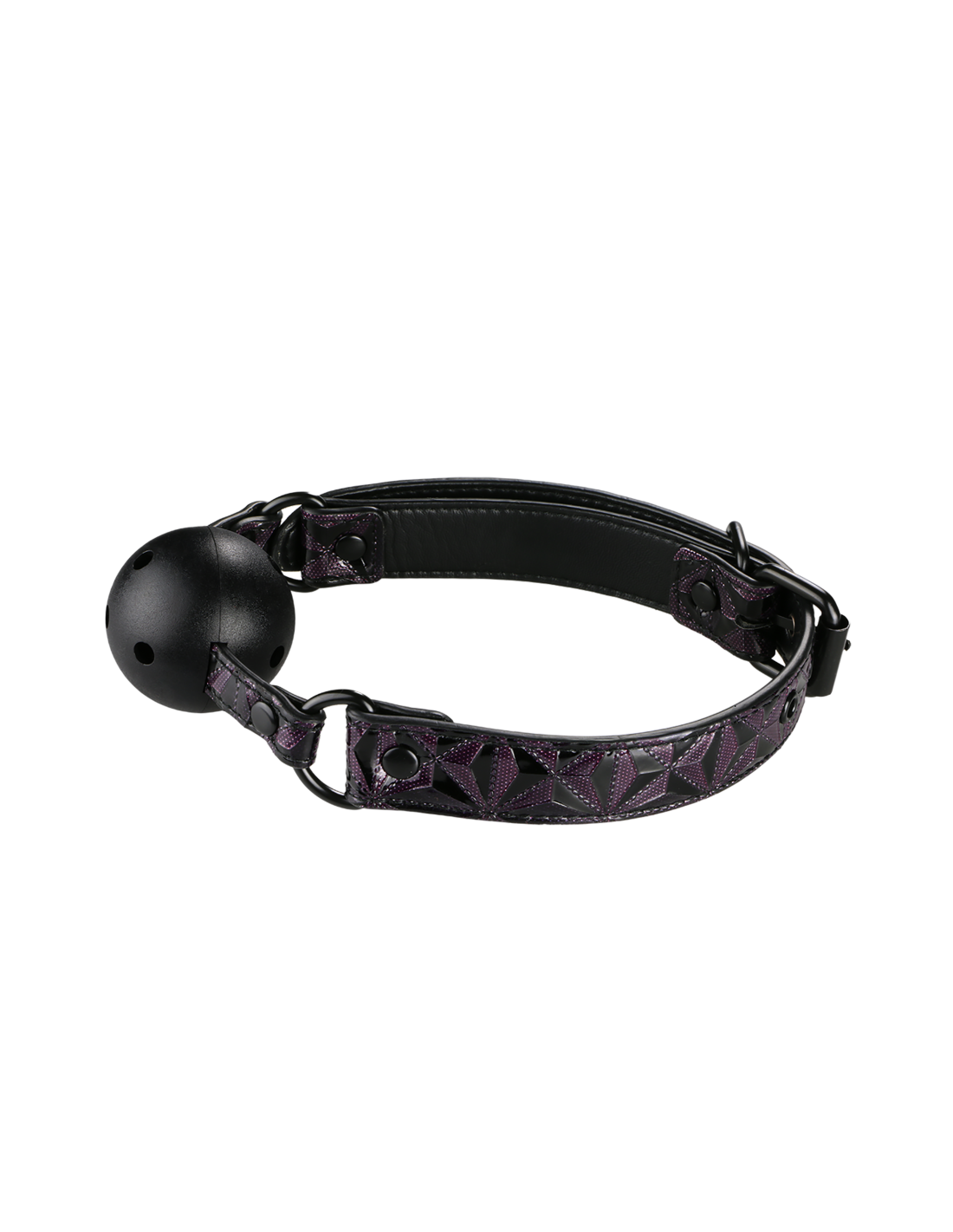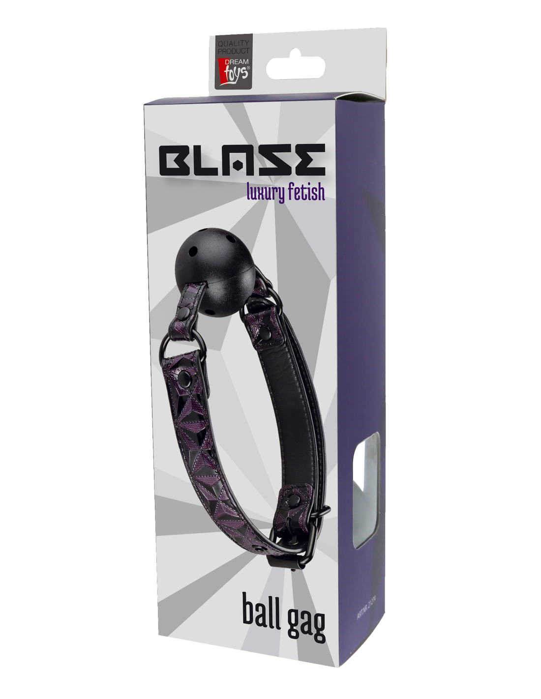 Mordaza de bola transpirable para juegos bondage de Blaze. La bola de plástico lisa (4,7 cm) es insípida e inodora y lo suficientemente grande como para amordazarlos sin resultar incómoda. La mordaza de bola sigue siendo cómoda de llevar gracias a los orificios para respirar. La correa está hecha de un material con apariencia de cuero con un diseño elegante y brillante en relieve en negro y morado, y es totalmente ajustable con el cierre de hebilla de metal.