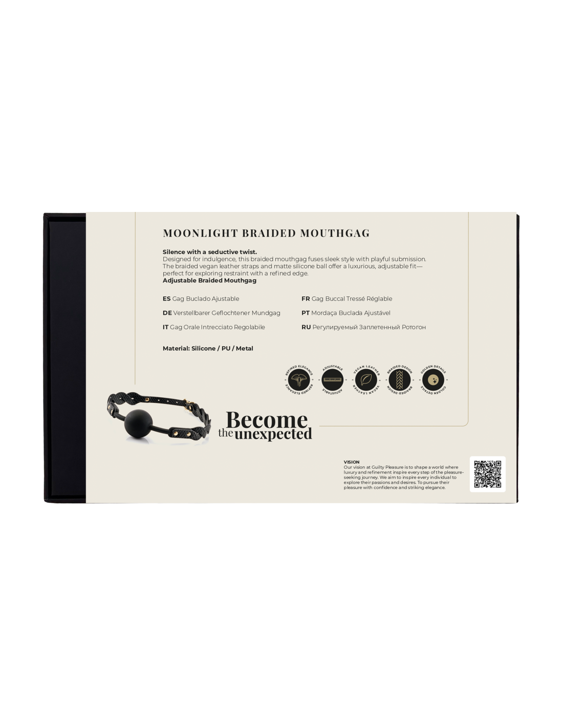 La mordaza trenzada Moonlight ofrece una versión sofisticada de la sujeción clásica, combinando una estética llamativa con comodidad y control. Diseñado para clientes que aprecian el poder del silencio y la belleza de la moderación, este mordaza bucal presenta una bola de silicona negra mate combinada con correas de cuero vegano trenzado, lo que brinda un atractivo táctil e intensidad visual.