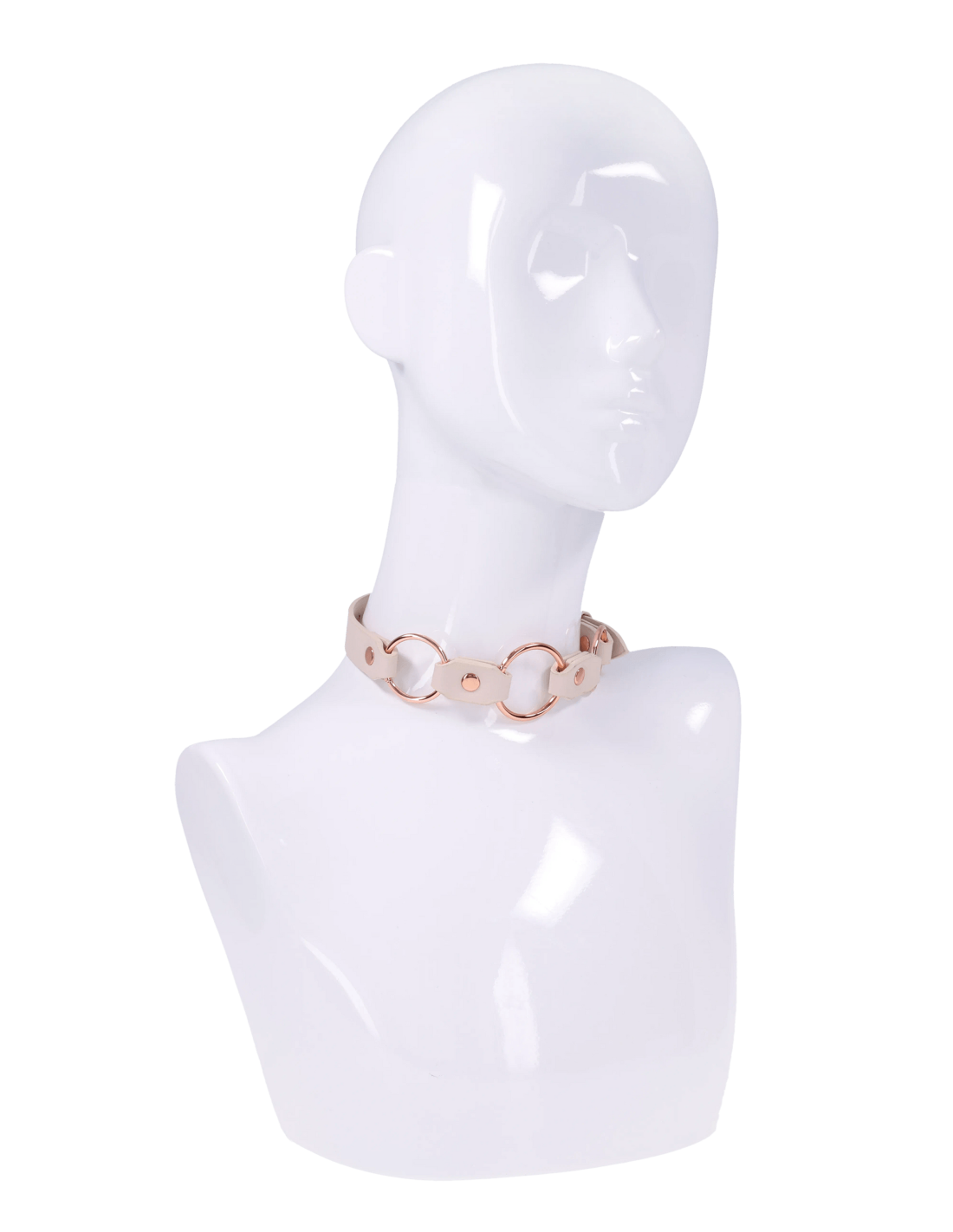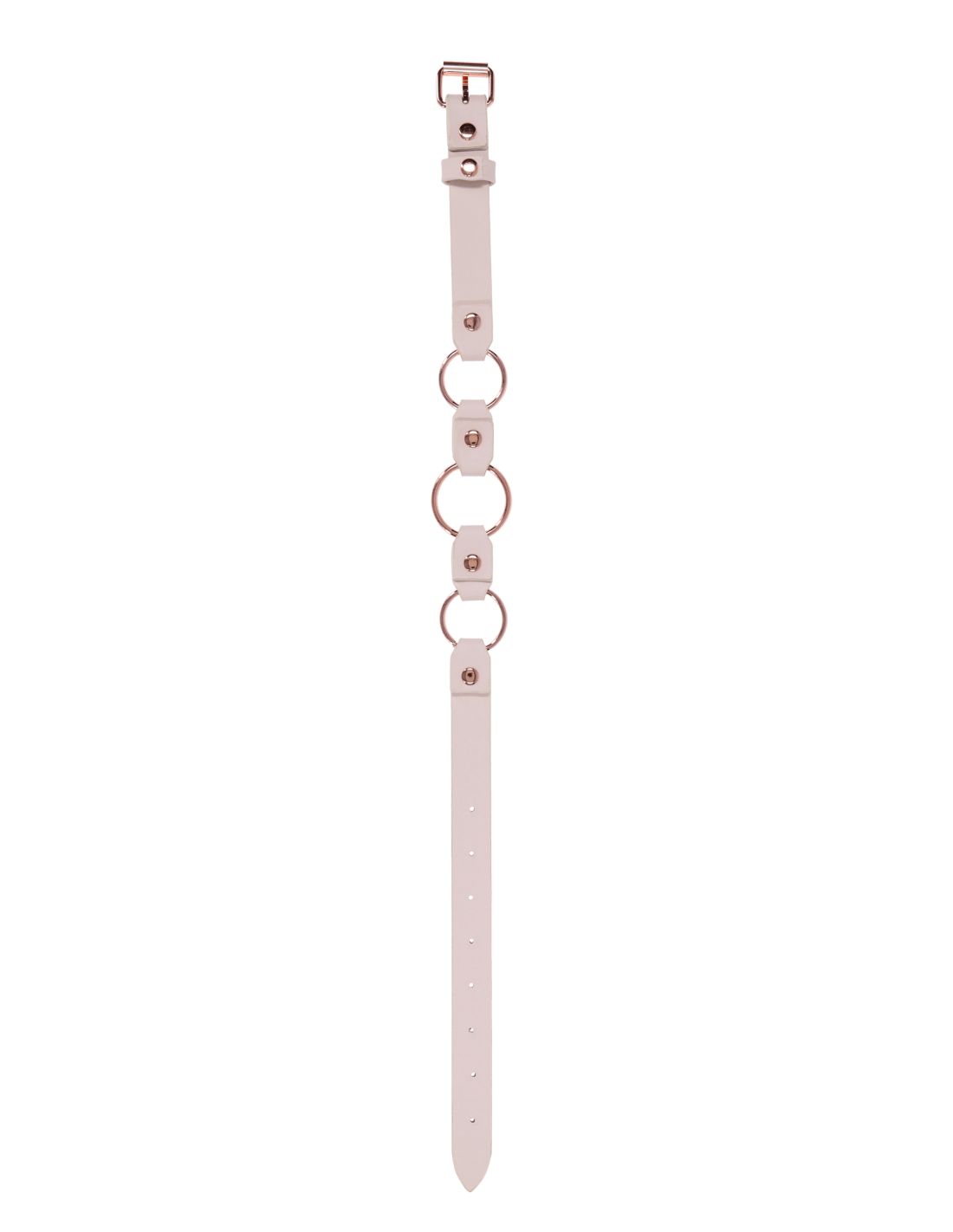 Mantente engalanado solo con la mejor ropa BDSM de lujo con el collar de día de anillo Peaches'N CreaMe. Elegante y seductor, este atrevido accesorio llama la atención y despierta la curiosidad, insinuando tu torcedura a los que saben. Confeccionada en piel sintética suave y cómoda, cuenta con tres anillos de oro rose que brillan con cada movimiento. Combínalo con tu correa favorita, un juego de abrazaderas o úsalo solo para demostrar que estás listo para tomarlo.