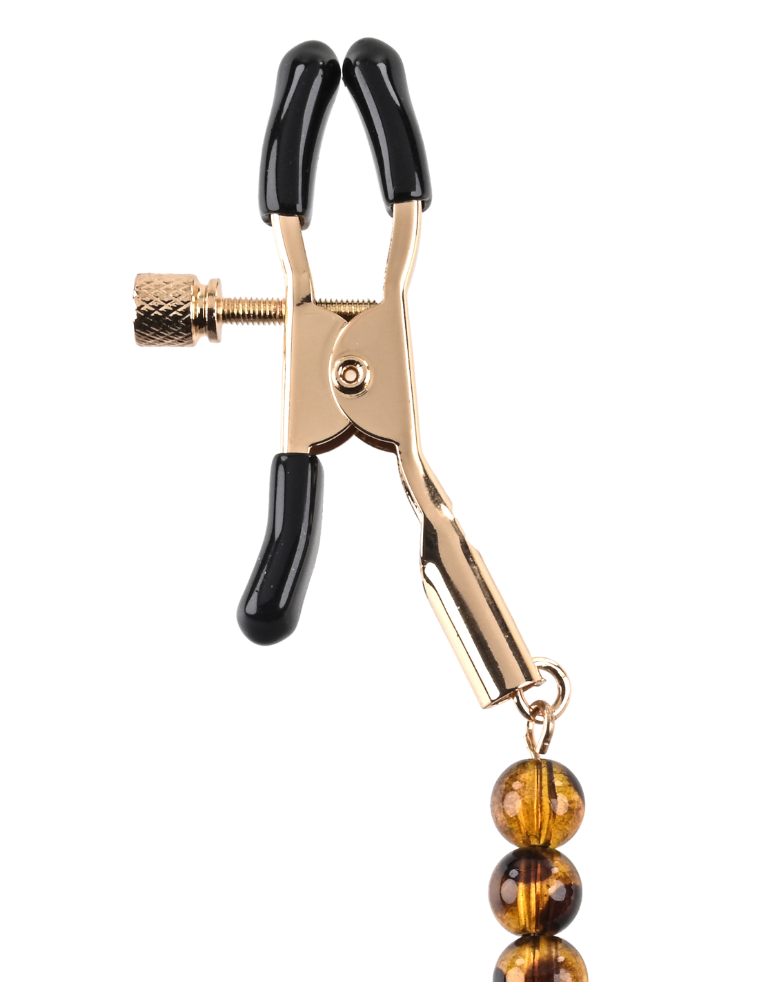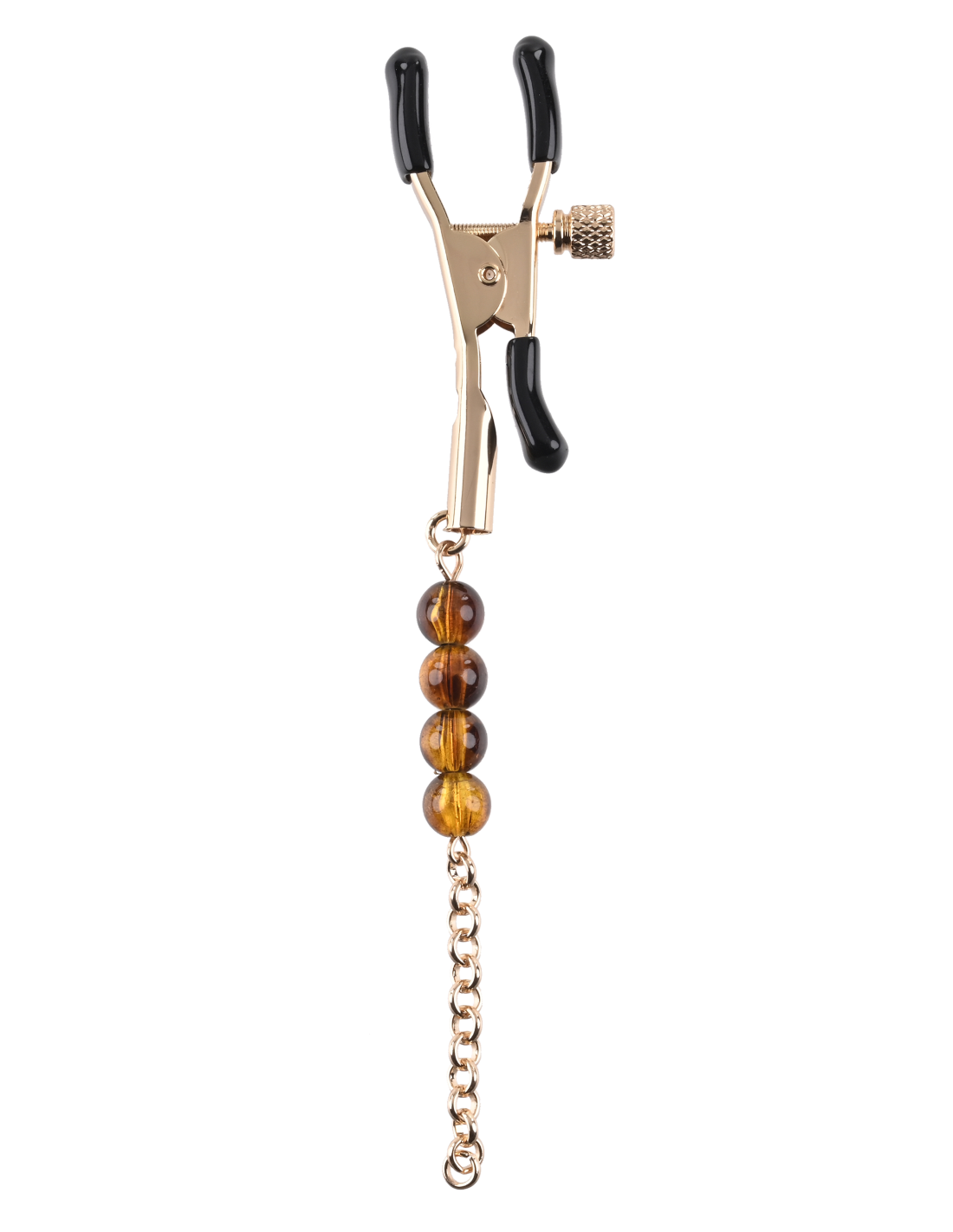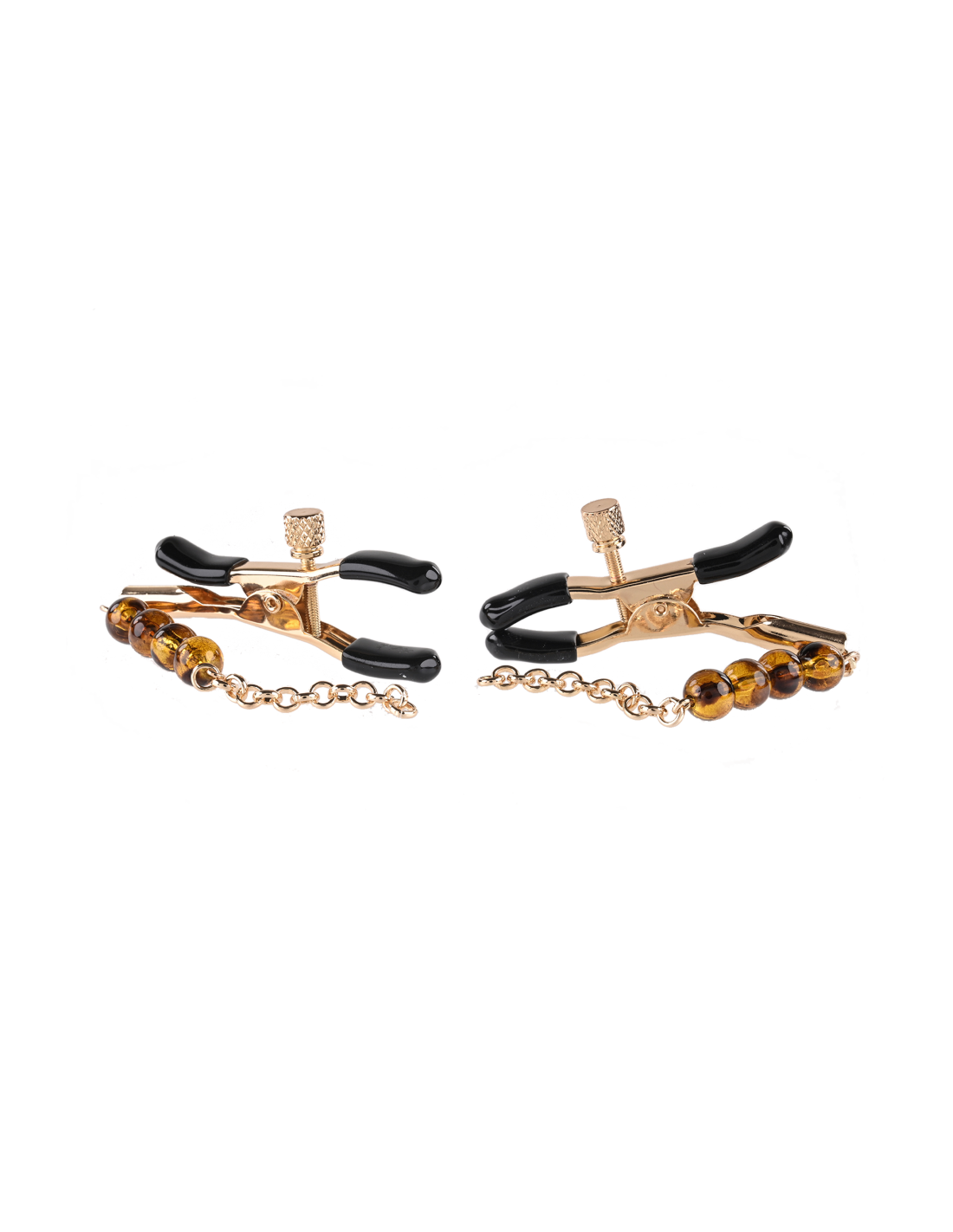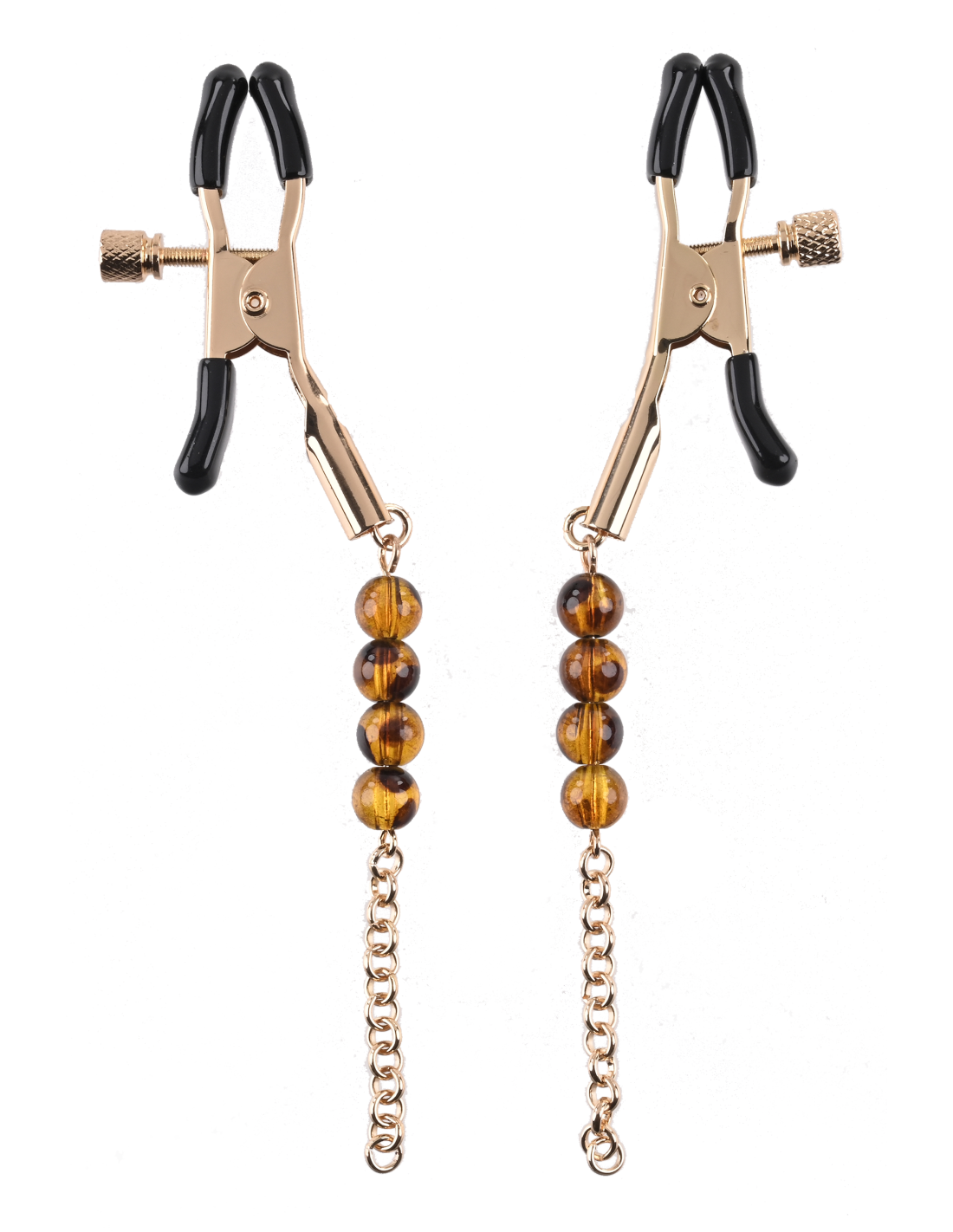 Adorna tu pecho con exquisitas pinzas para pezones con cuentas de color ámbar inspiradas en carey y añade el tormento provocador del juego con los pezones a tu próxima cita deslumbrante. Fabricadas con ajustes de tensión, elige la intensidad que tú o tu pareja deseen.