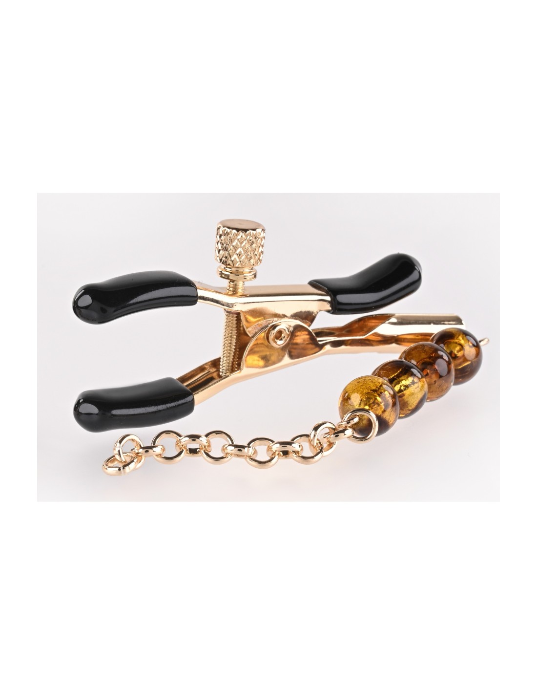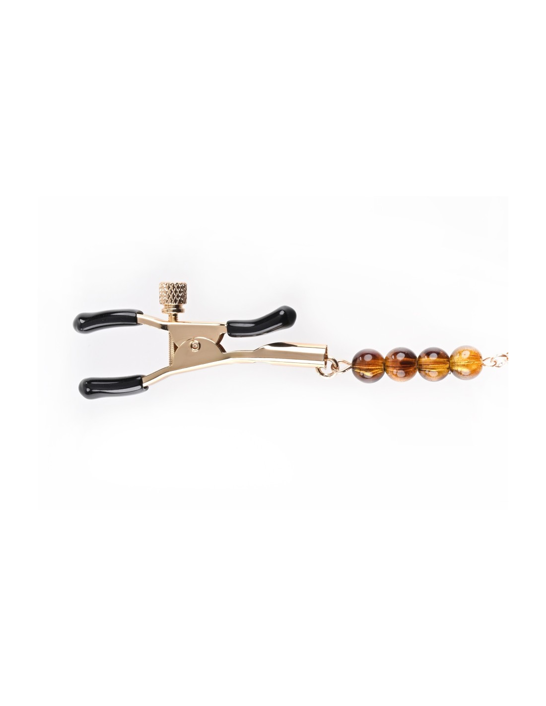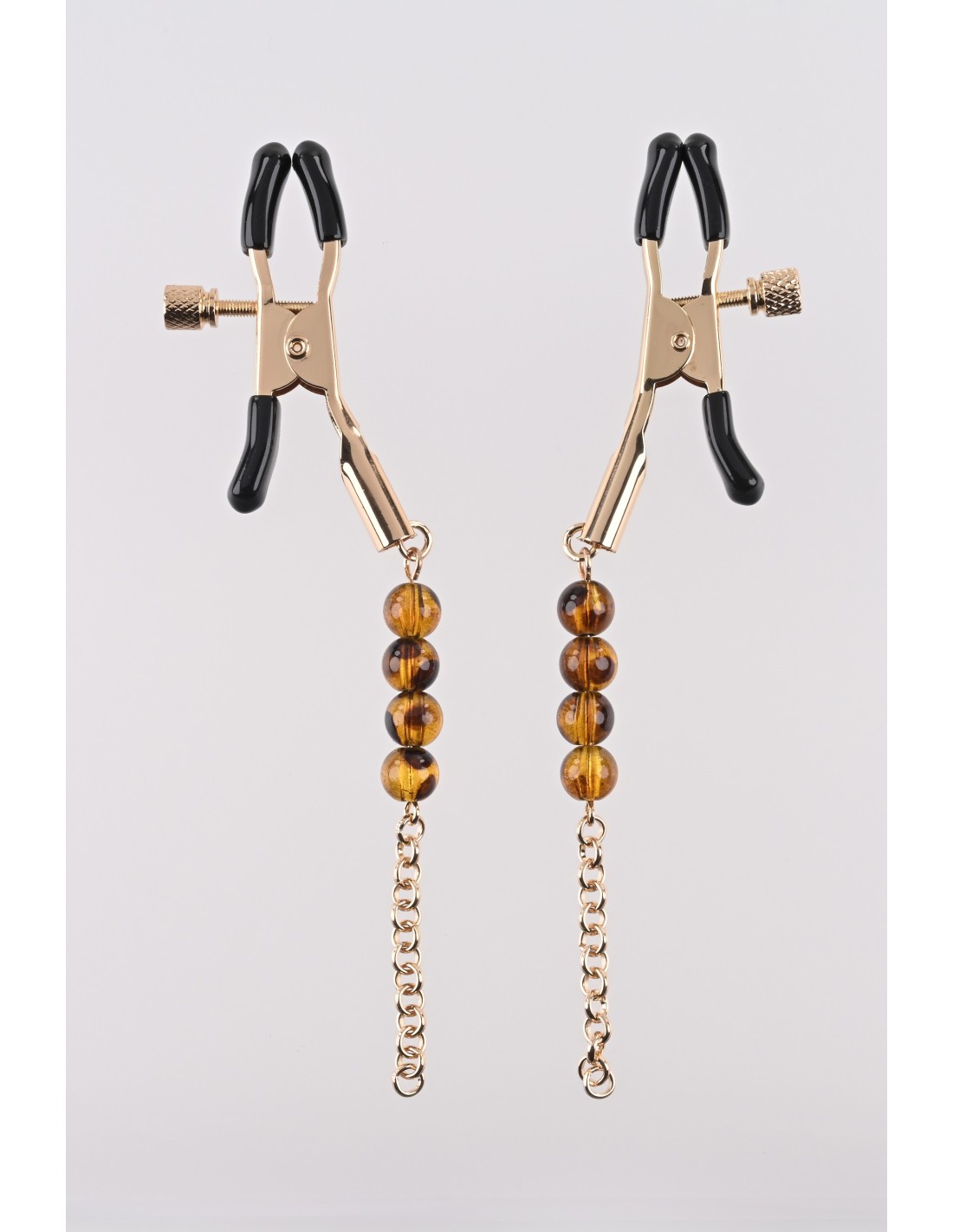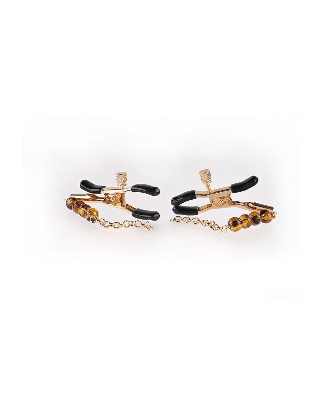 Adorna tu pecho con exquisitas pinzas para pezones con cuentas de color ámbar inspiradas en carey y añade el tormento provocador del juego con los pezones a tu próxima cita deslumbrante. Fabricadas con ajustes de tensión, elige la intensidad que tú o tu pareja deseen.