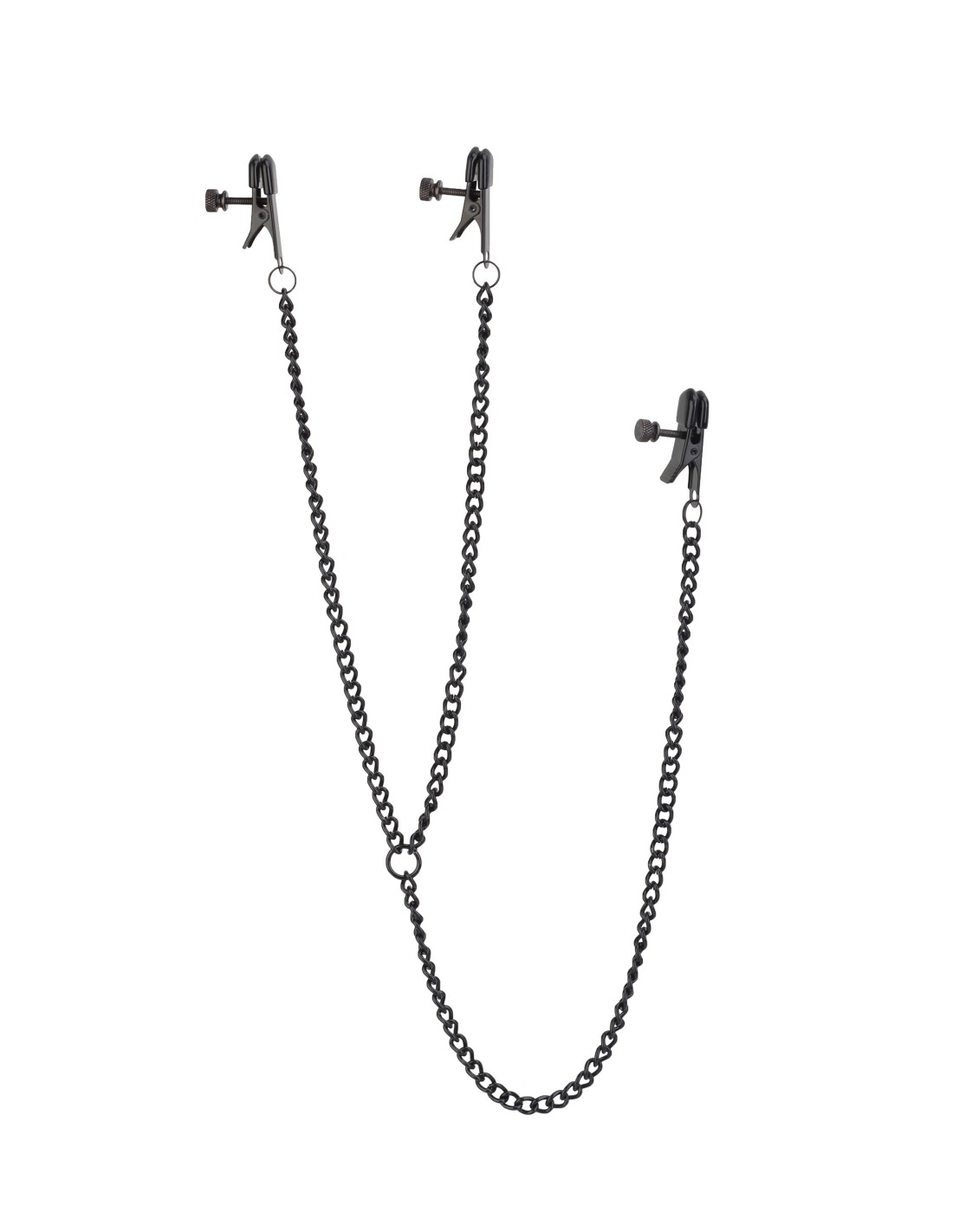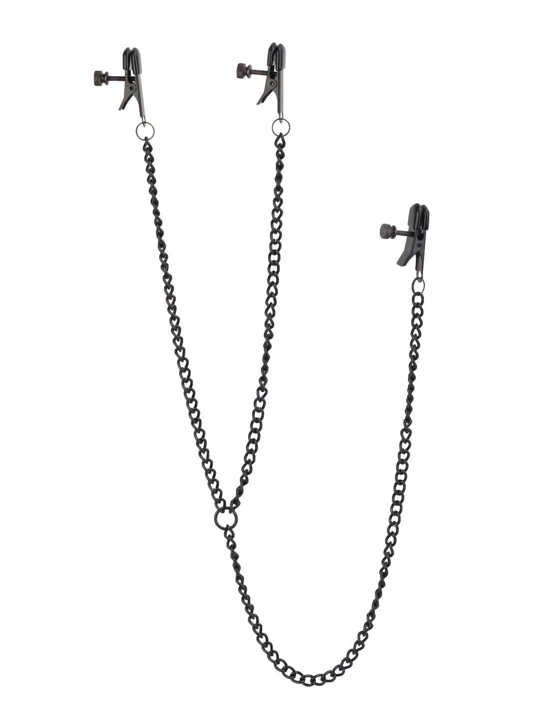 Un juego de pinzas para pezones de metal negro, cada una con una cadena de metal de 20 cm de largo, y una pinza para el clítoris adjunta a una cadena de metal de 32 cm de largo. Las pinzas cuentan con fundas de PVC para proteger la piel. La presión se puede ajustar con los tornillos, para un máximo control de compresión.