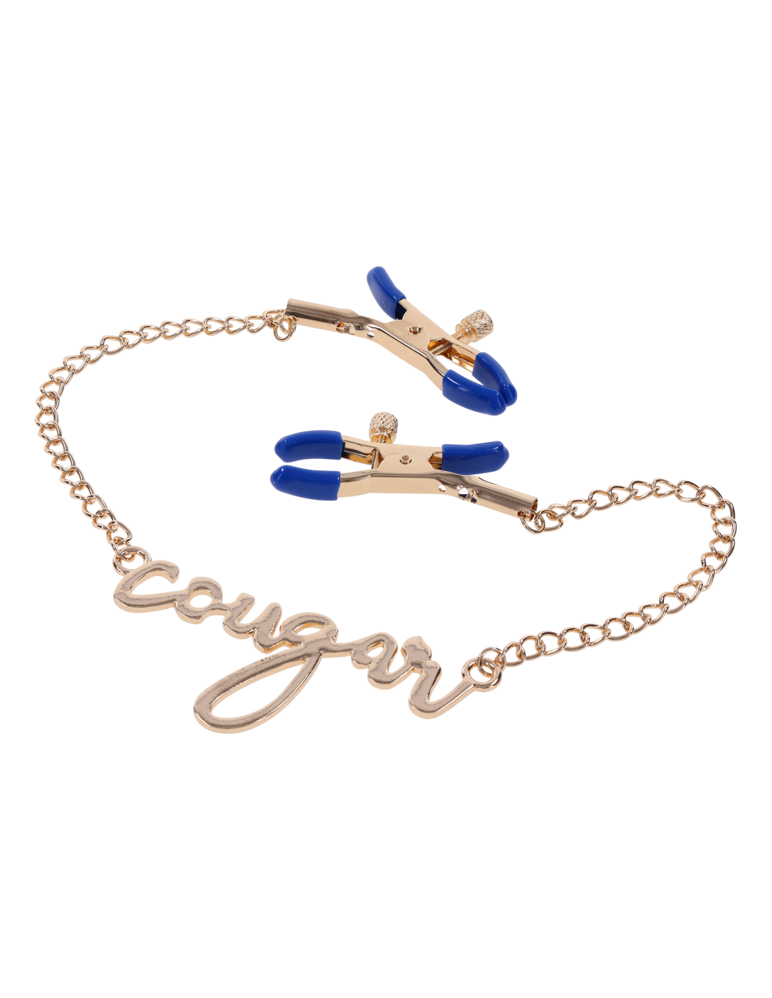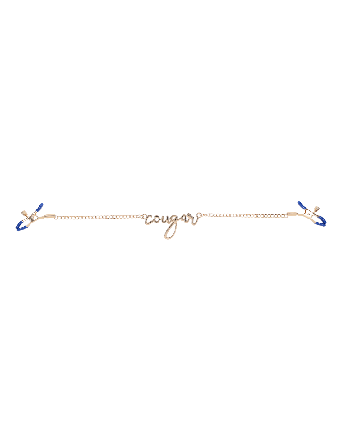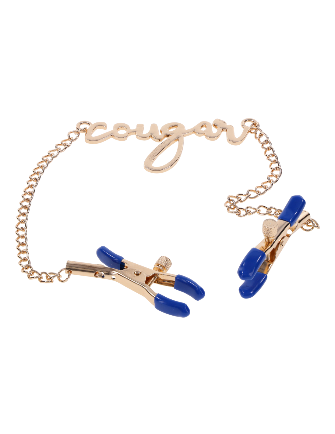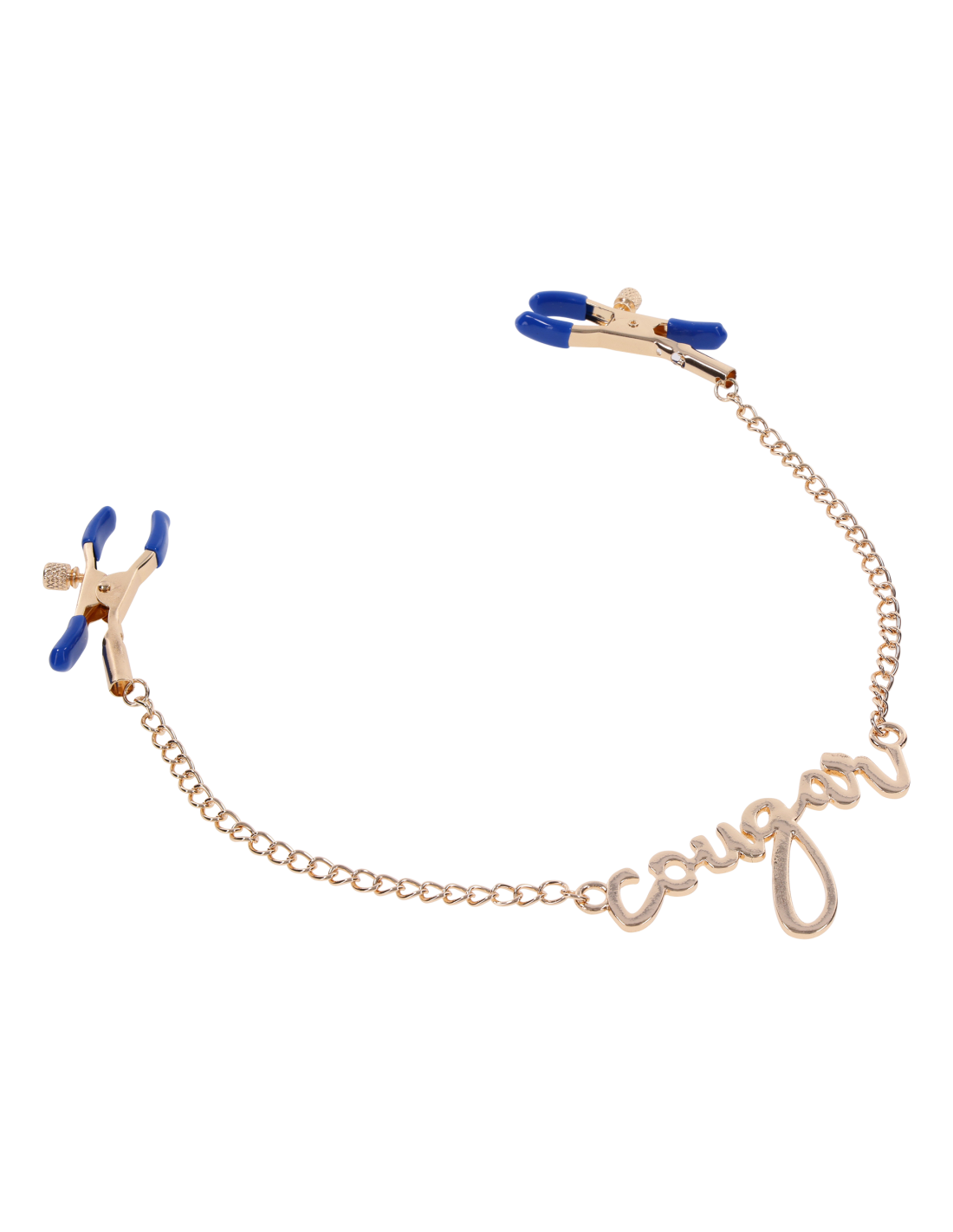 Atrévete a desnudarlo todo y añade un toque de emoción a tu juego con las pinzas para pezones Cougar. Estas elegantes pinzas cuentan con una lujosa cadena de oro con la palabra "Cougar" escrita en cursiva entre ellas, que encarna tanto el estilo como la alegría. Con tensión ajustable, estas abrazaderas son perfect para explorar nuevas sensaciones. El sensual tono azul añade un toque feroz, asegurando que cada momento sea tan elegante como estimulante.
