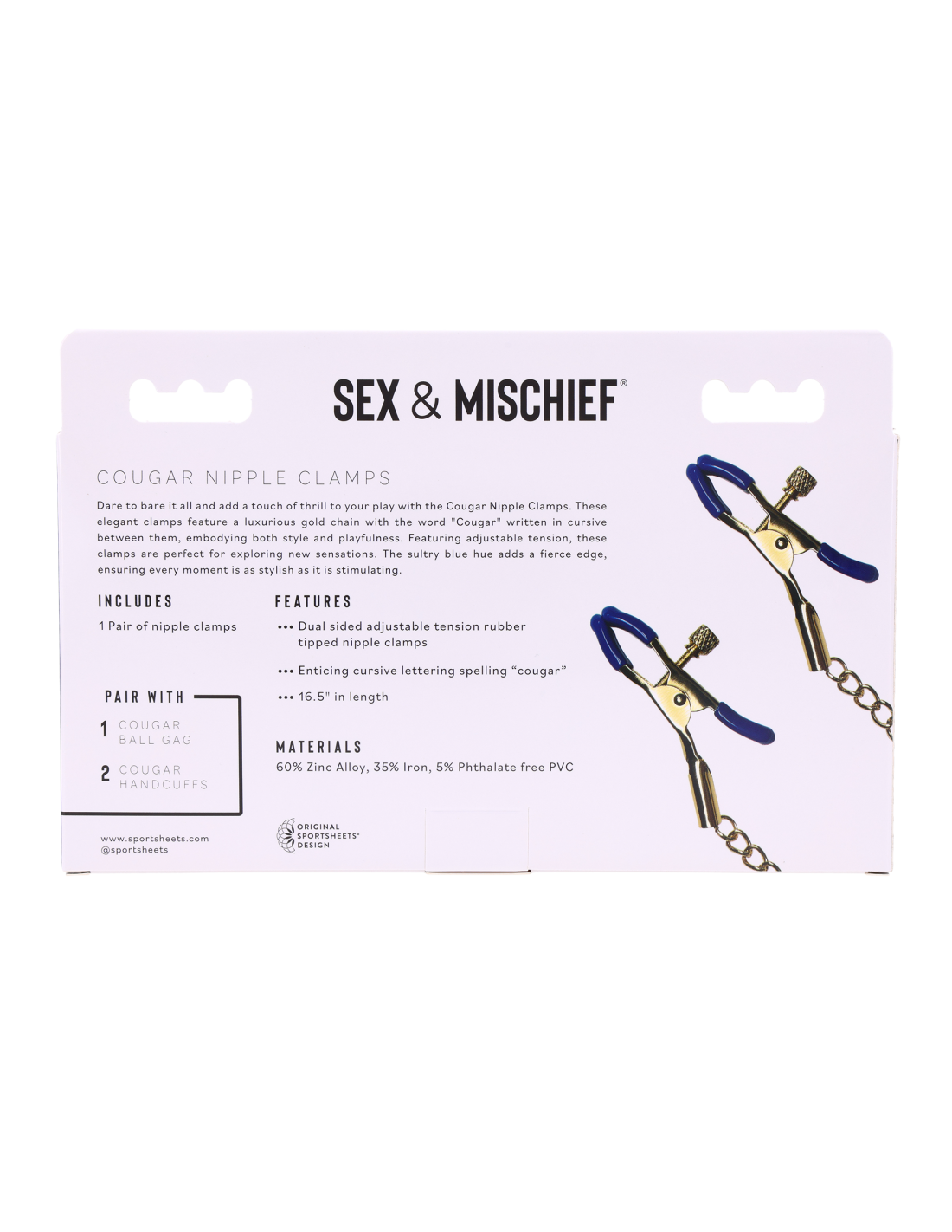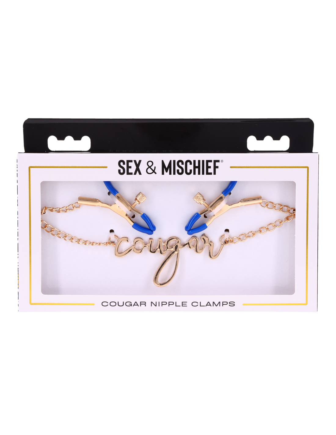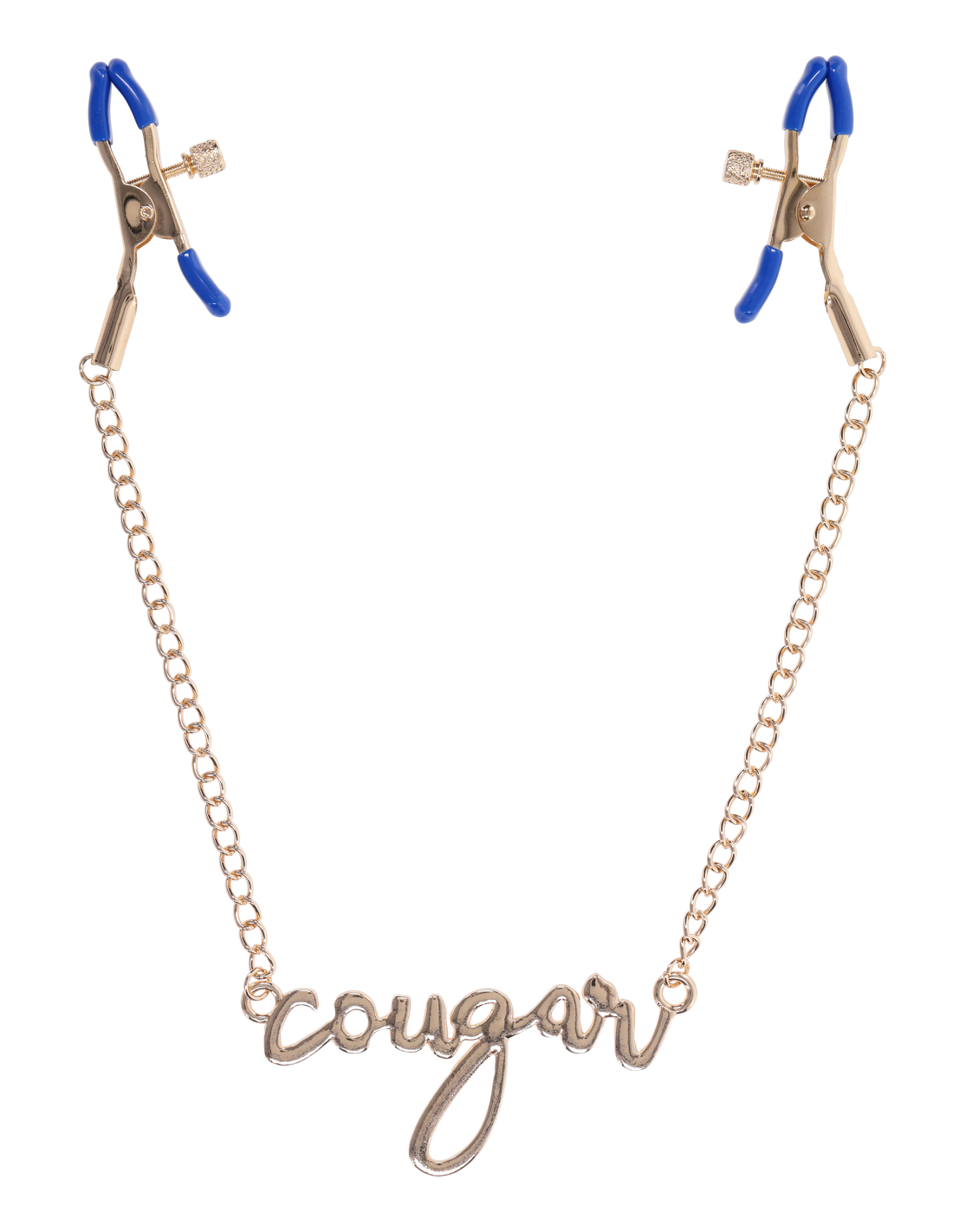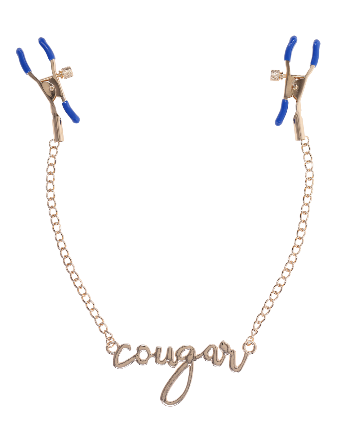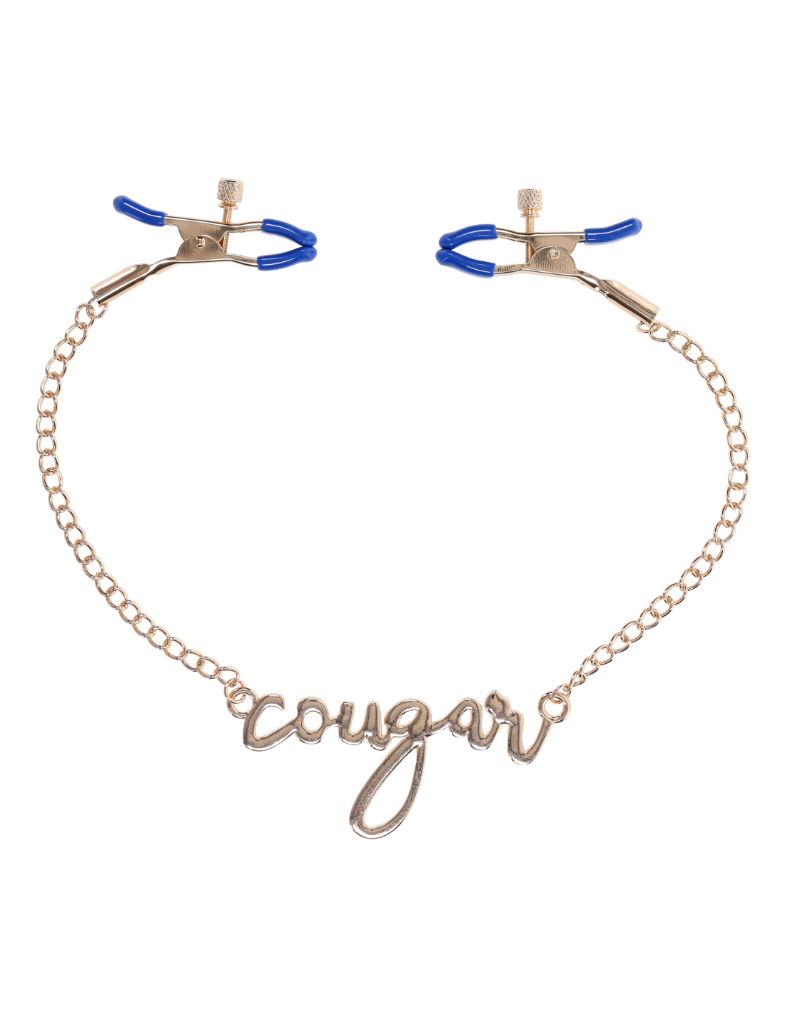 Atrévete a desnudarlo todo y añade un toque de emoción a tu juego con las pinzas para pezones Cougar. Estas elegantes pinzas cuentan con una lujosa cadena de oro con la palabra "Cougar" escrita en cursiva entre ellas, que encarna tanto el estilo como la alegría. Con tensión ajustable, estas abrazaderas son perfect para explorar nuevas sensaciones. El sensual tono azul añade un toque feroz, asegurando que cada momento sea tan elegante como estimulante.