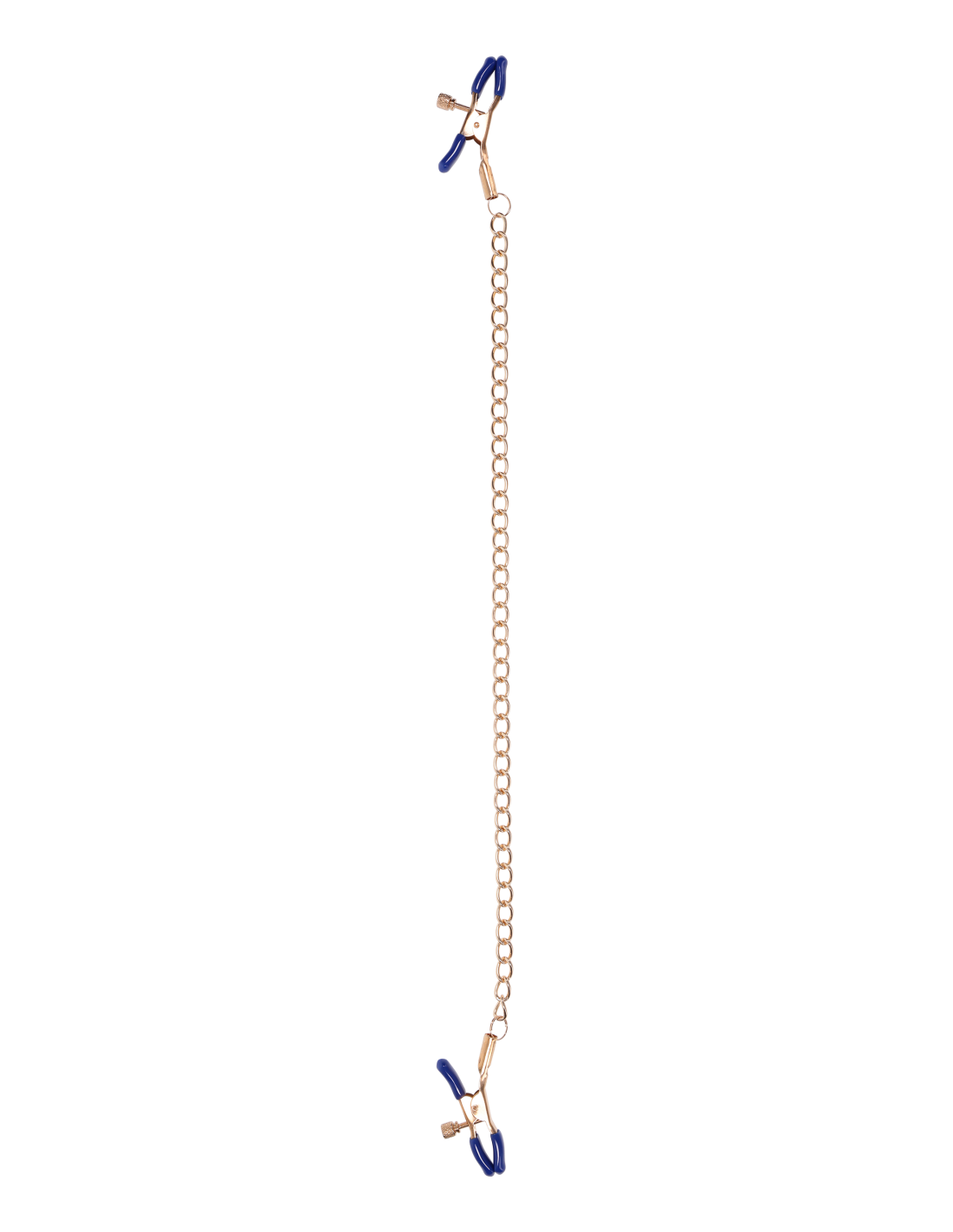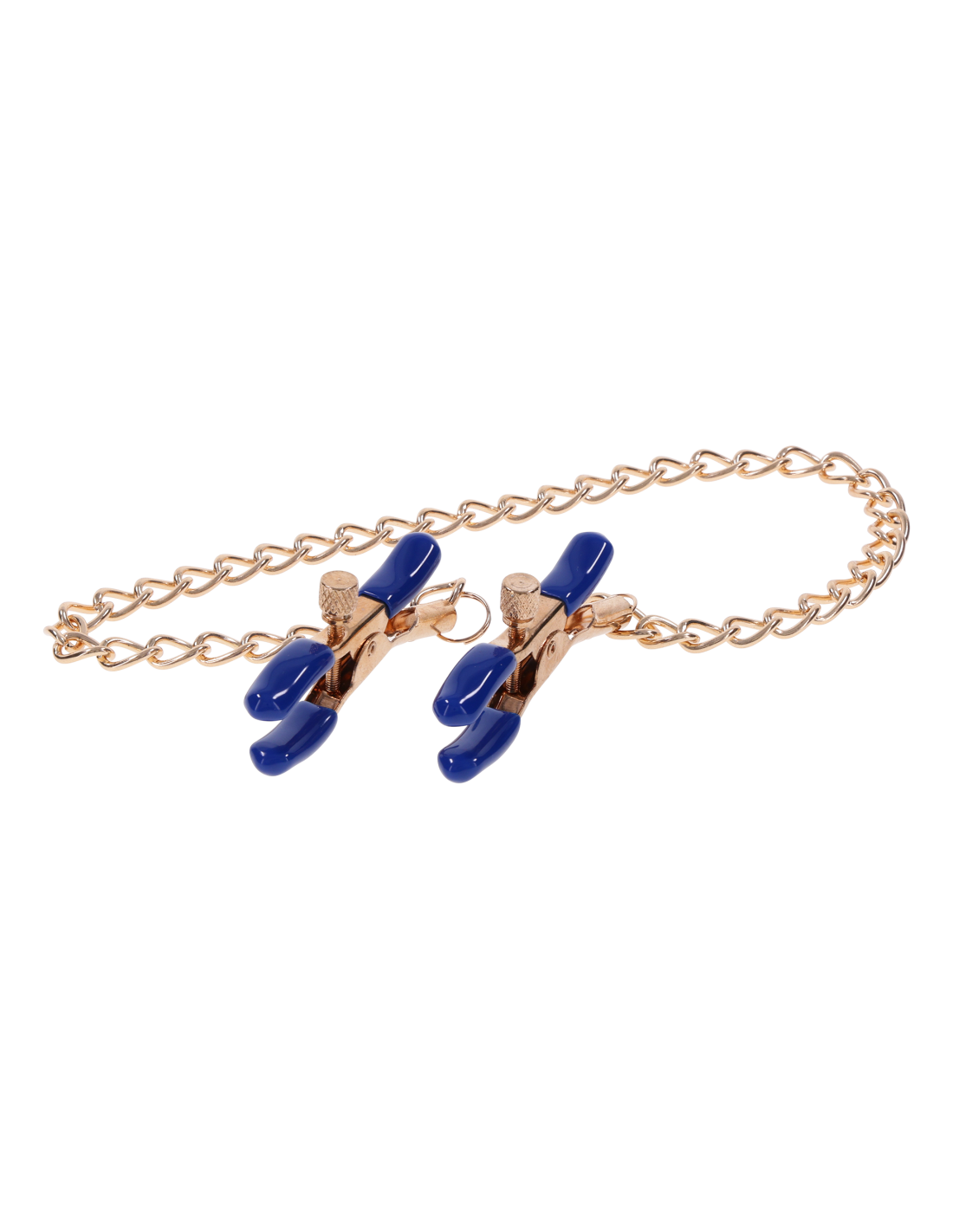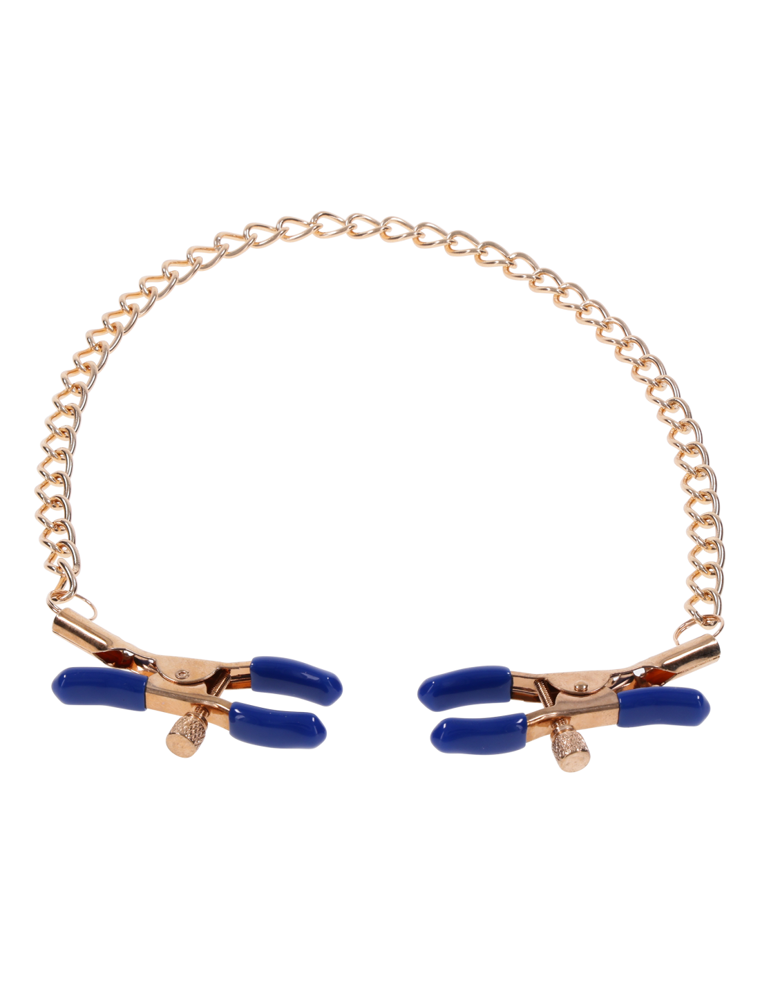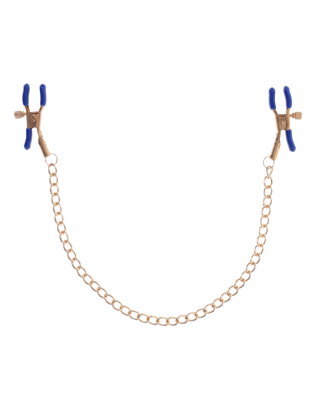 Estas exquisitas pinzas cuentan con una cadena dorada y llamativas puntas de plástico azul, que combinan elegancia con un toque de alegría salvaje. Perfect para aquellos nuevos en el BDSM o entusiastas experimentados, los tornillos de mariposa ajustables le permiten controlar la presión, lo que garantiza una experiencia personalizada. La cadena de oro brillante no solo agrega un toque sofisticado, sino que también ofrece una tentadora oportunidad para tirones suaves a medida que la pasión se intensifica. Deja volar tu imaginación y explora las tentadoras sensaciones que estas versátiles pinzas pueden aportar a varias partes de tu cuerpo.