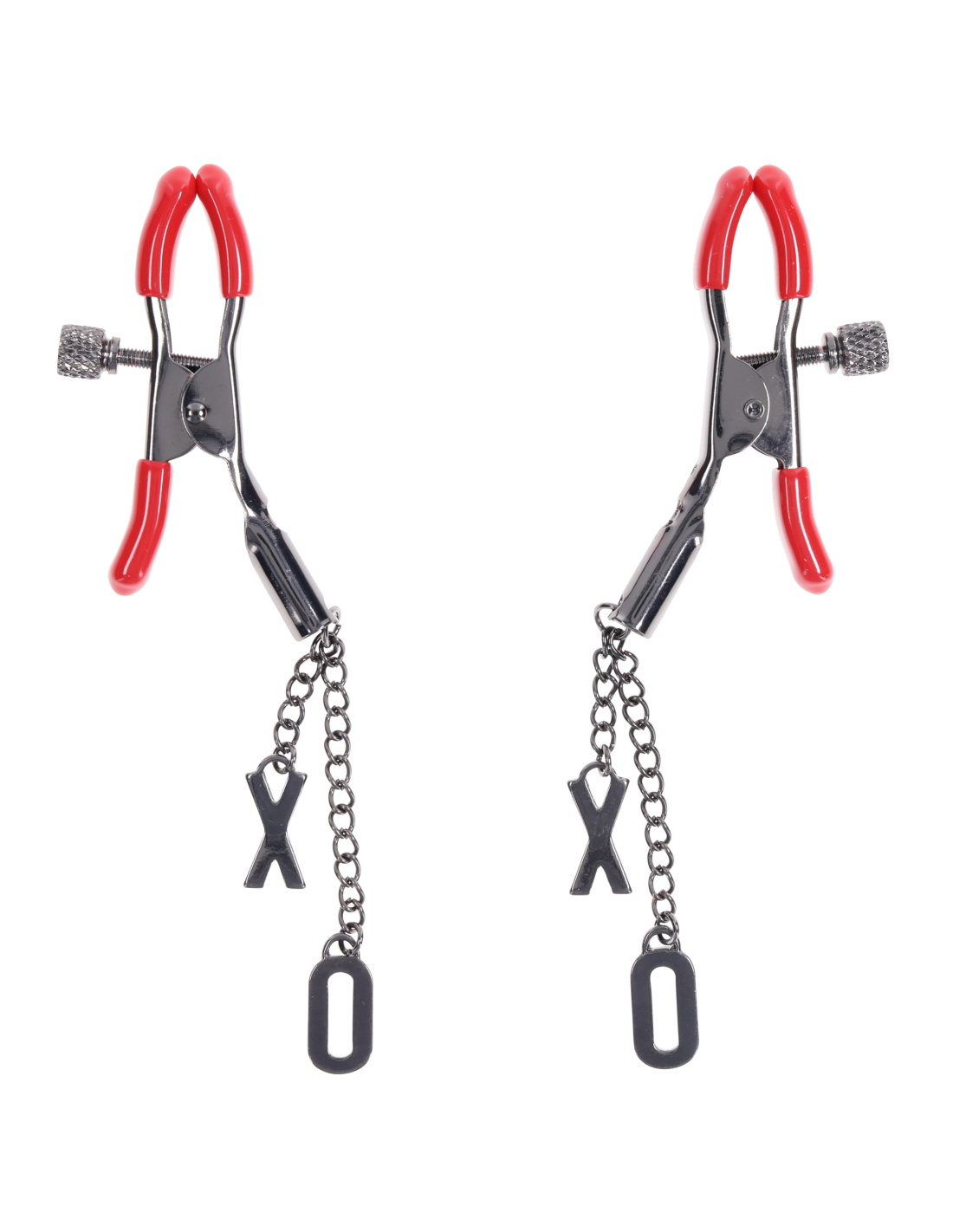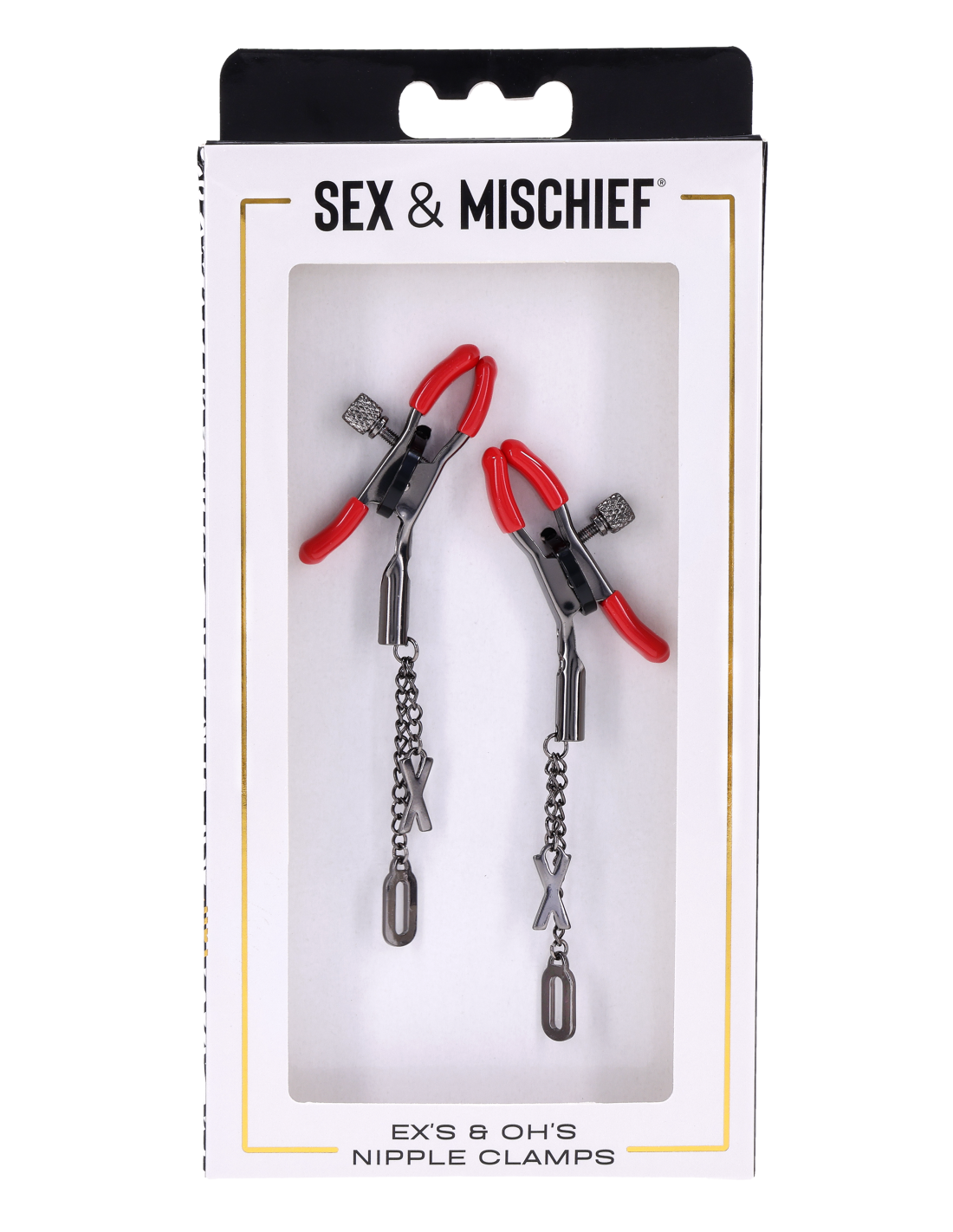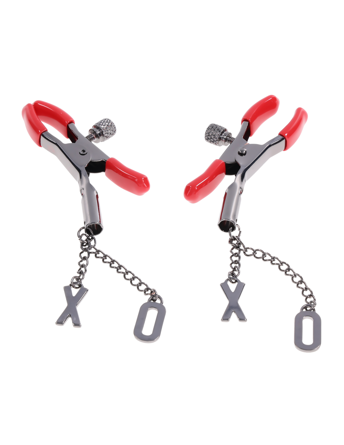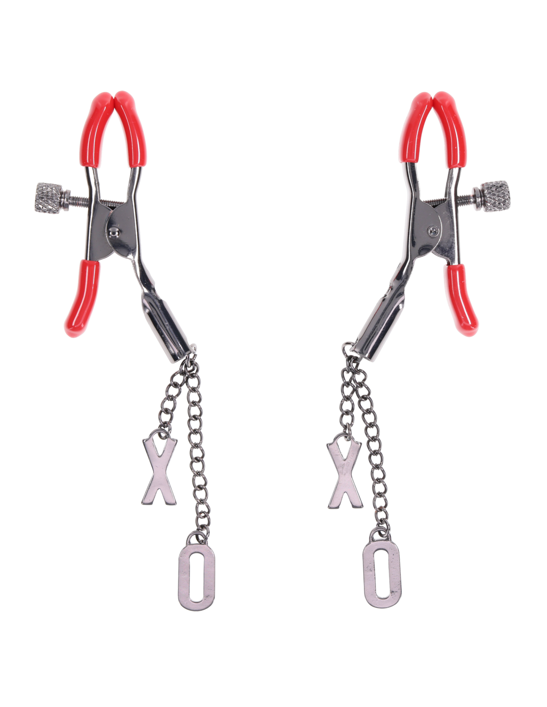 Deléitese con una mezcla de placer y estilo con las pinzas para pezones Ex's & Oh's. Estas elegantes abrazaderas de bronce cuentan con puntas de goma roja suave diseñadas para una experiencia cómoda pero tentadora. Perfect para principiantes y más allá, la tensión ajustable ofrece una presión personalizable, lo que garantiza un perfect fit para cualquier usuario. Los charms colgantes en forma de "X" y "O" añaden un toque lúdico a cada momento, combinando el atractivo estético con el encanto funcional. Ya sea para jugar en solitario o para una experiencia compartida, estas pinzas para pezones son la perfect adición a su colección íntima, aportando una chispa de emoción y sofisticación.