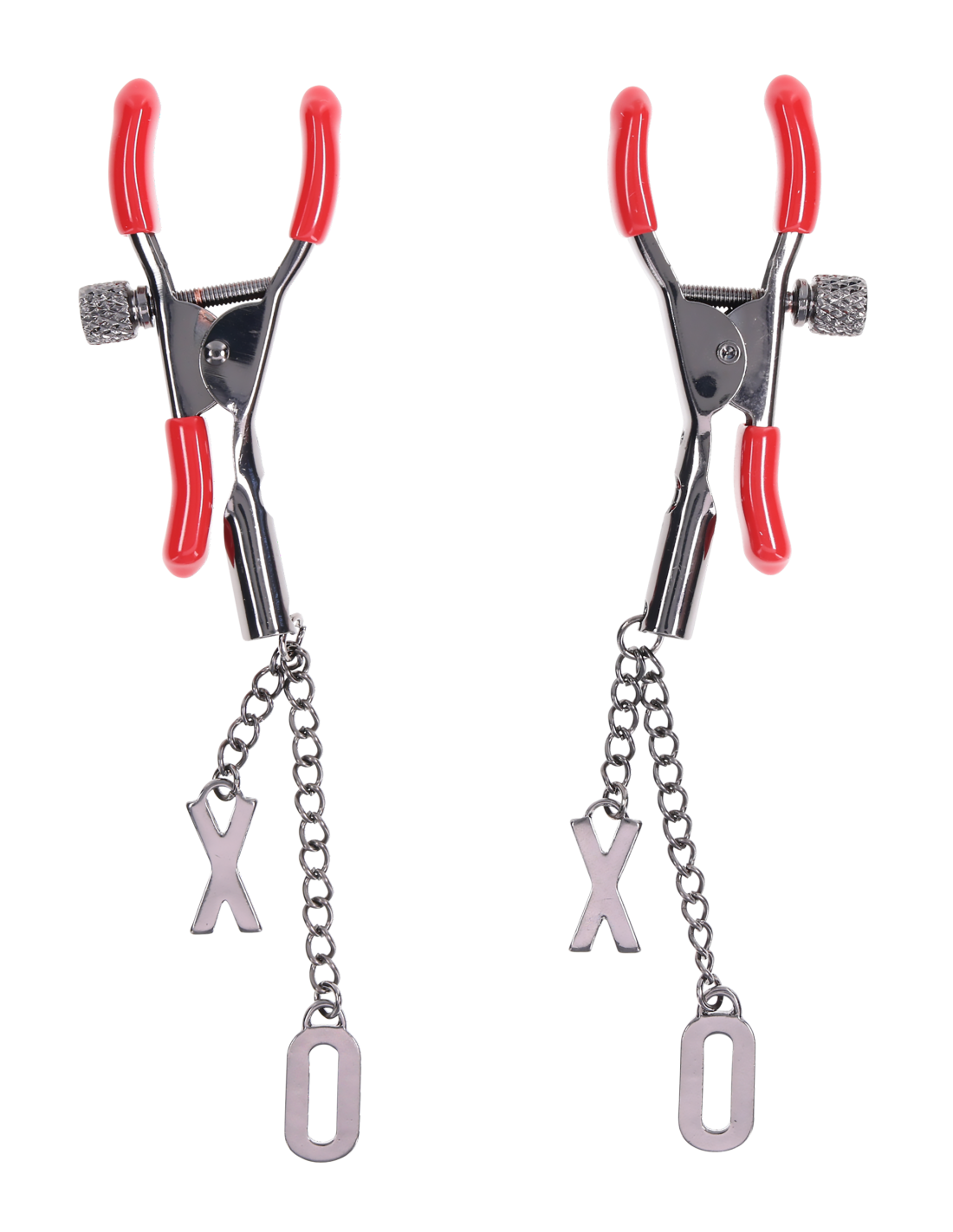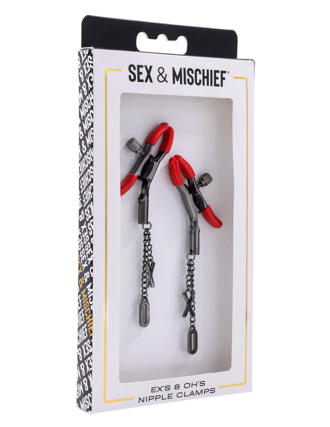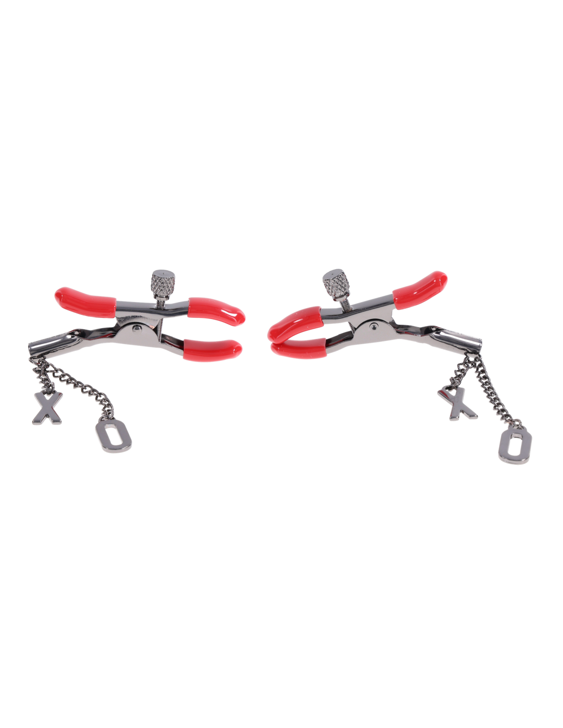 Deléitese con una mezcla de placer y estilo con las pinzas para pezones Ex's & Oh's. Estas elegantes abrazaderas de bronce cuentan con puntas de goma roja suave diseñadas para una experiencia cómoda pero tentadora. Perfect para principiantes y más allá, la tensión ajustable ofrece una presión personalizable, lo que garantiza un perfect fit para cualquier usuario. Los charms colgantes en forma de "X" y "O" añaden un toque lúdico a cada momento, combinando el atractivo estético con el encanto funcional. Ya sea para jugar en solitario o para una experiencia compartida, estas pinzas para pezones son la perfect adición a su colección íntima, aportando una chispa de emoción y sofisticación.