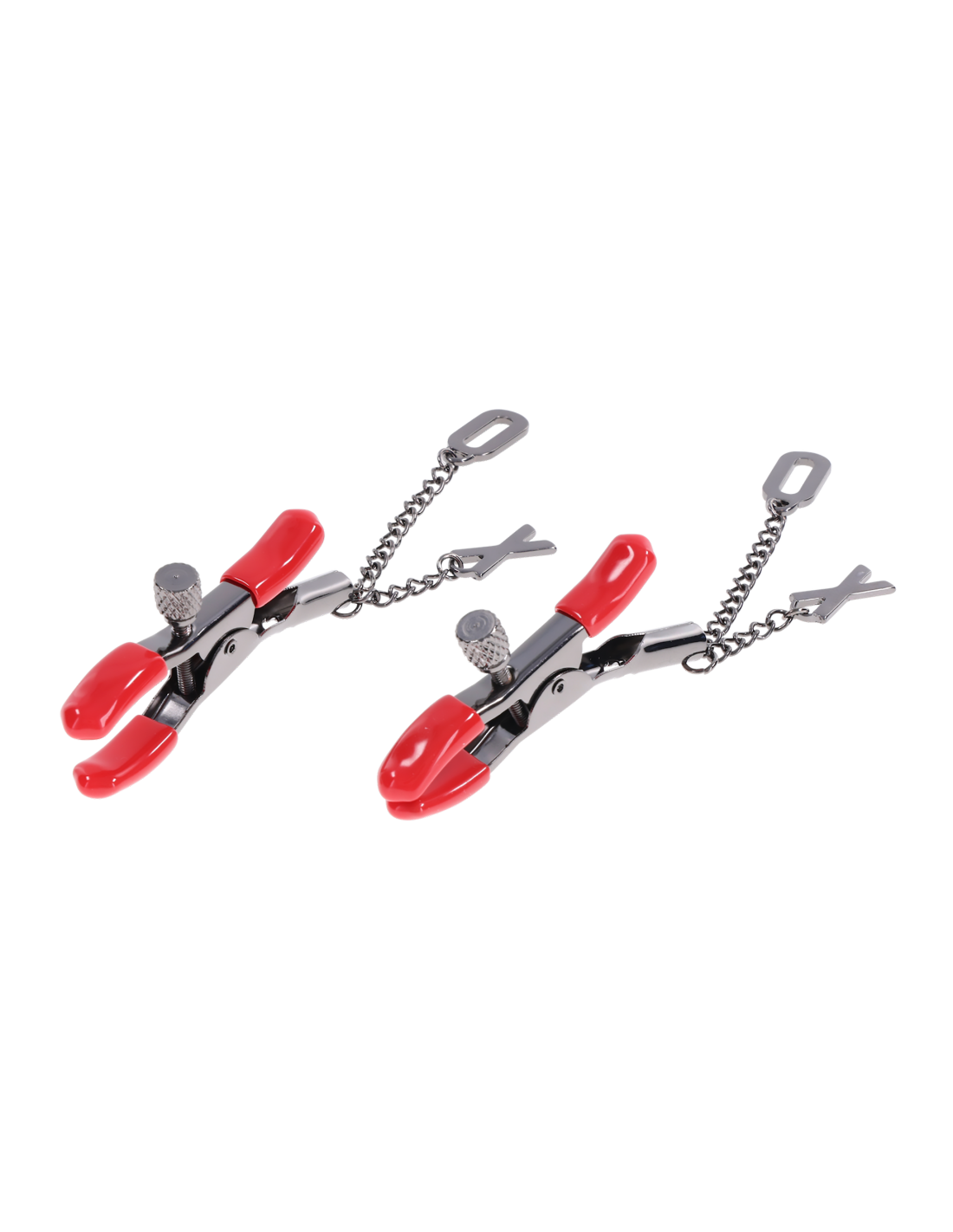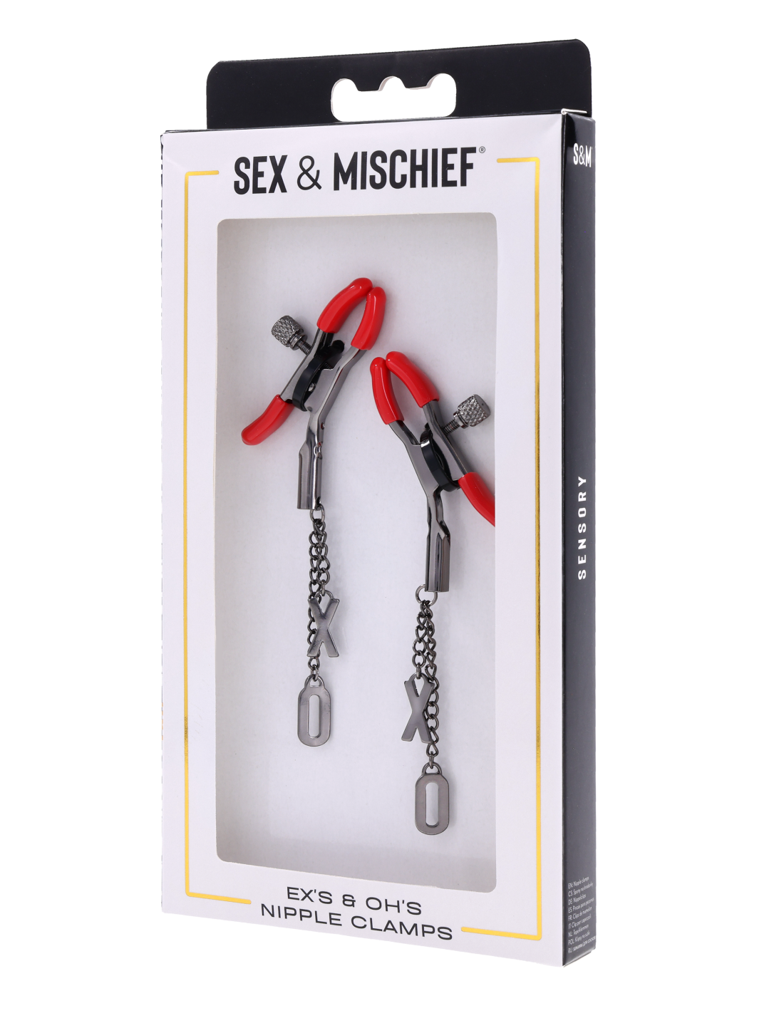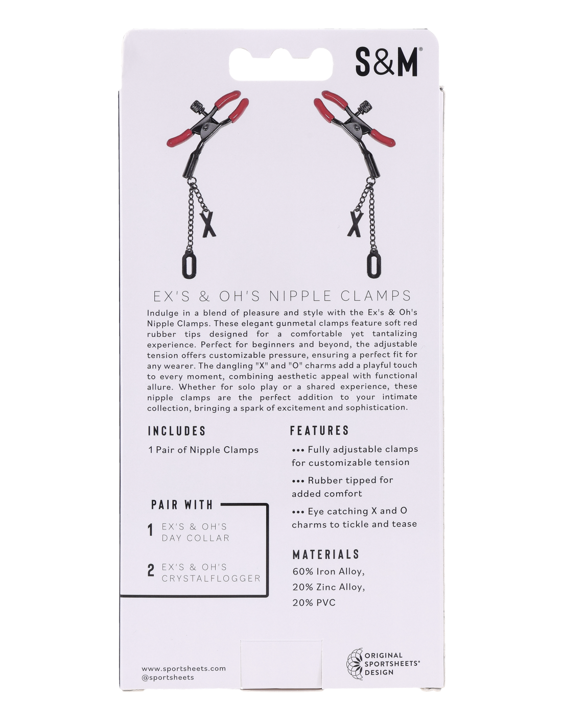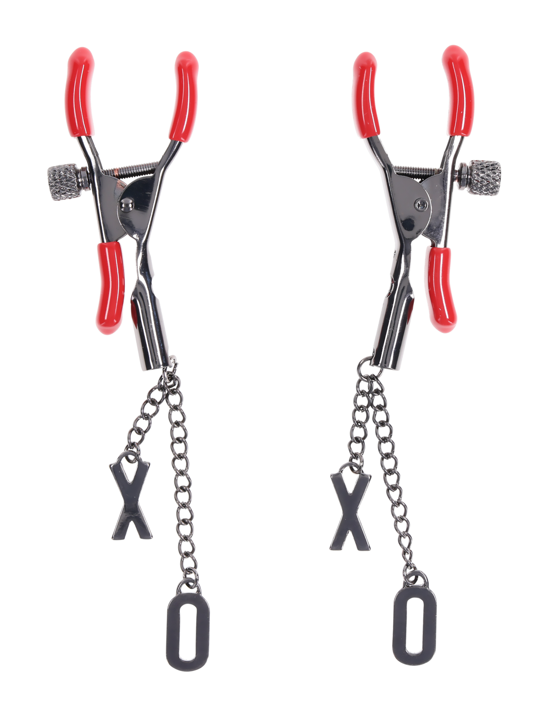 Deléitese con una mezcla de placer y estilo con las pinzas para pezones Ex's & Oh's. Estas elegantes abrazaderas de bronce cuentan con puntas de goma roja suave diseñadas para una experiencia cómoda pero tentadora. Perfect para principiantes y más allá, la tensión ajustable ofrece una presión personalizable, lo que garantiza un perfect fit para cualquier usuario. Los charms colgantes en forma de "X" y "O" añaden un toque lúdico a cada momento, combinando el atractivo estético con el encanto funcional. Ya sea para jugar en solitario o para una experiencia compartida, estas pinzas para pezones son la perfect adición a su colección íntima, aportando una chispa de emoción y sofisticación.