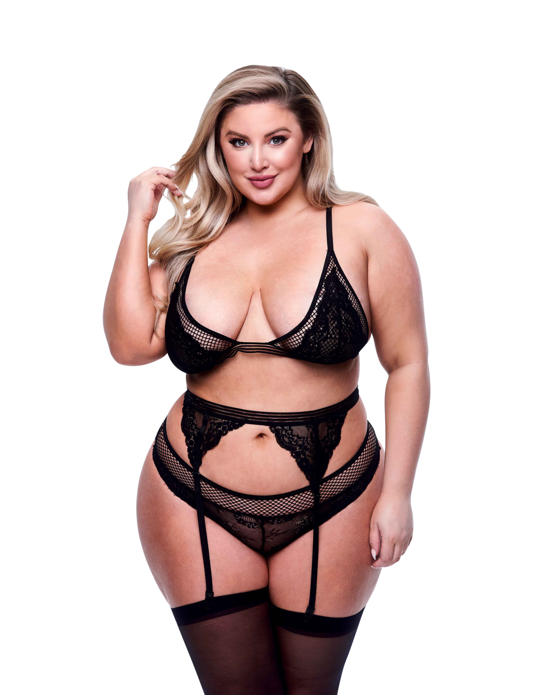 ¡Dondequiera que te lleve el día, deja que la lencería Baci comience tu look! El nuevo conjunto de tres piezas, disponible en negro medianoche o azul cerúleo, combina perfectamente con cualquier look (o mejor aún, ¡solo!). El sujetador de malla y encaje ofrece el soporte que deseas mientras te mantiene luciendo lo mejor posible, mientras que el liguero y la braga atrevida a juego completan el look. ¡Termina el look con tus medias favoritas y listo!