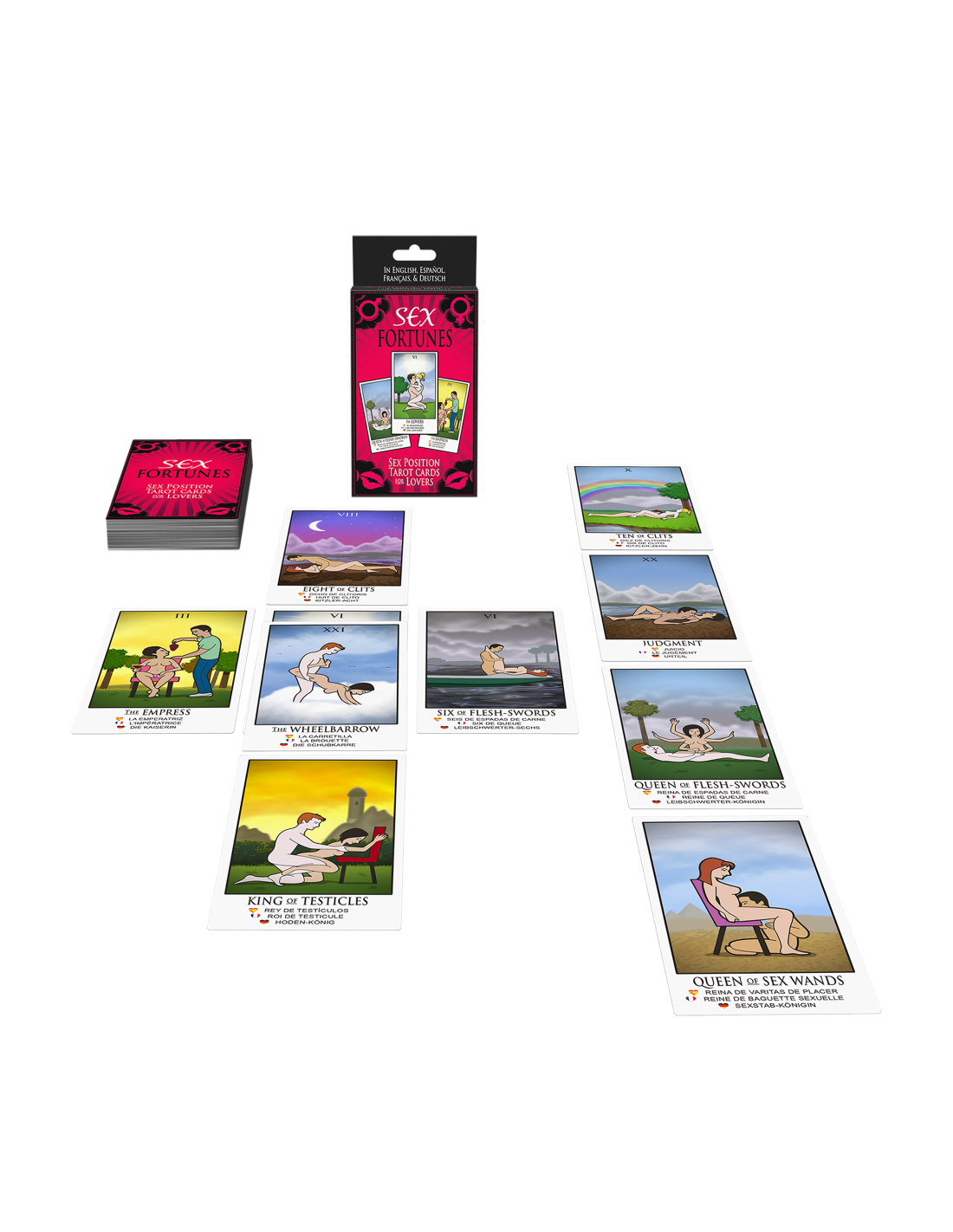 ¡Cartas del Tarot para los enamorados! Desconcierta a tu amante prediciendo con precisión el futuro sexual de esta noche con Sex Fortunes. Reparte las 10 cartas de la fortuna de tu amante como lo haría un adivino y luego representa las fortunas que él o ella quiere que se hagan realidad. Incluye 78 Sex Fortune Cards y un folleto de instrucciones ilustrado.
