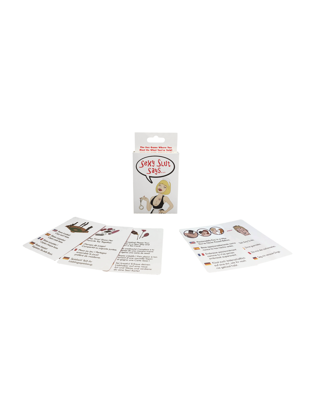 El juego de Sexy Slut Says... es muy simple. ¡Separas el sexo! Tarjetas de las tarjetas Sexy SlutSays.... Tú y tu amante se turnan para seleccionar y representar las tarjetas Sexy Slut Says.... ¡Algunas tarjetas te permiten ganar un Sexo! Card, y el primer jugador en ganar tres ¡Sexo! gana y puede seleccionar una posición sexual en una de estas tarjetas para que la pareja actúe.