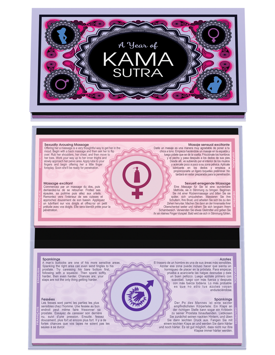 Karma Sutra: cada semana, selecciona una tarjeta de consejos para compartir con tu amante. Alternar técnicas "para él" y "para ella". Comience disfrutando de algunos juegos previos y técnicas sensuales y avance a lo largo del año hacia técnicas más creativas y desafiantes para hacer el amor. Los resultados son absolutamente orgásmicos. Incluye: 26 tarjetas de consejos sexuales reutilizables para él y 26 tarjetas de consejos sexuales reutilizables para ella.