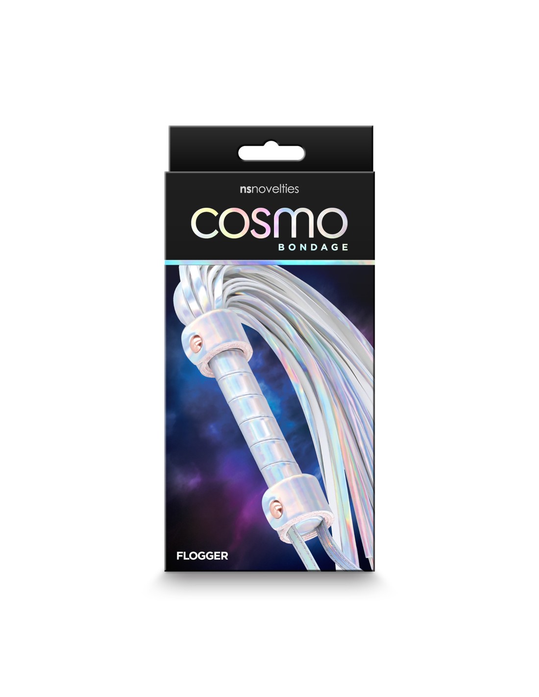 Ilumina la noche con el látigo holográfico de Cosmo. Acentuado con herrajes sin níquel en oro rosa. Fabricado en vinilo fácil de limpiar.