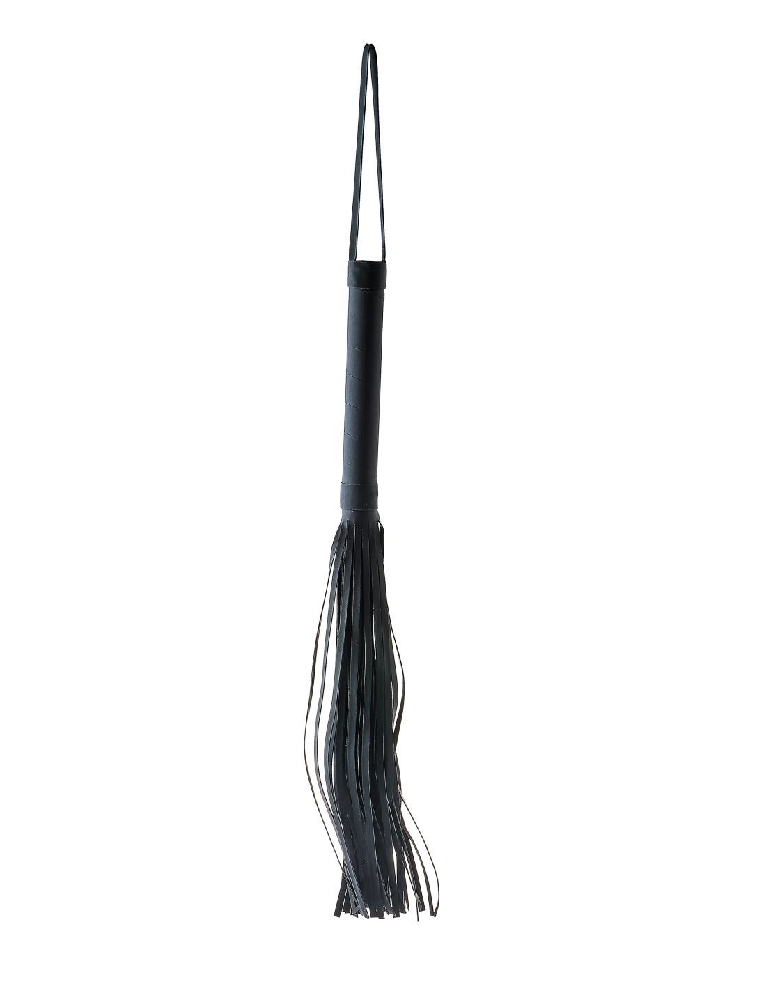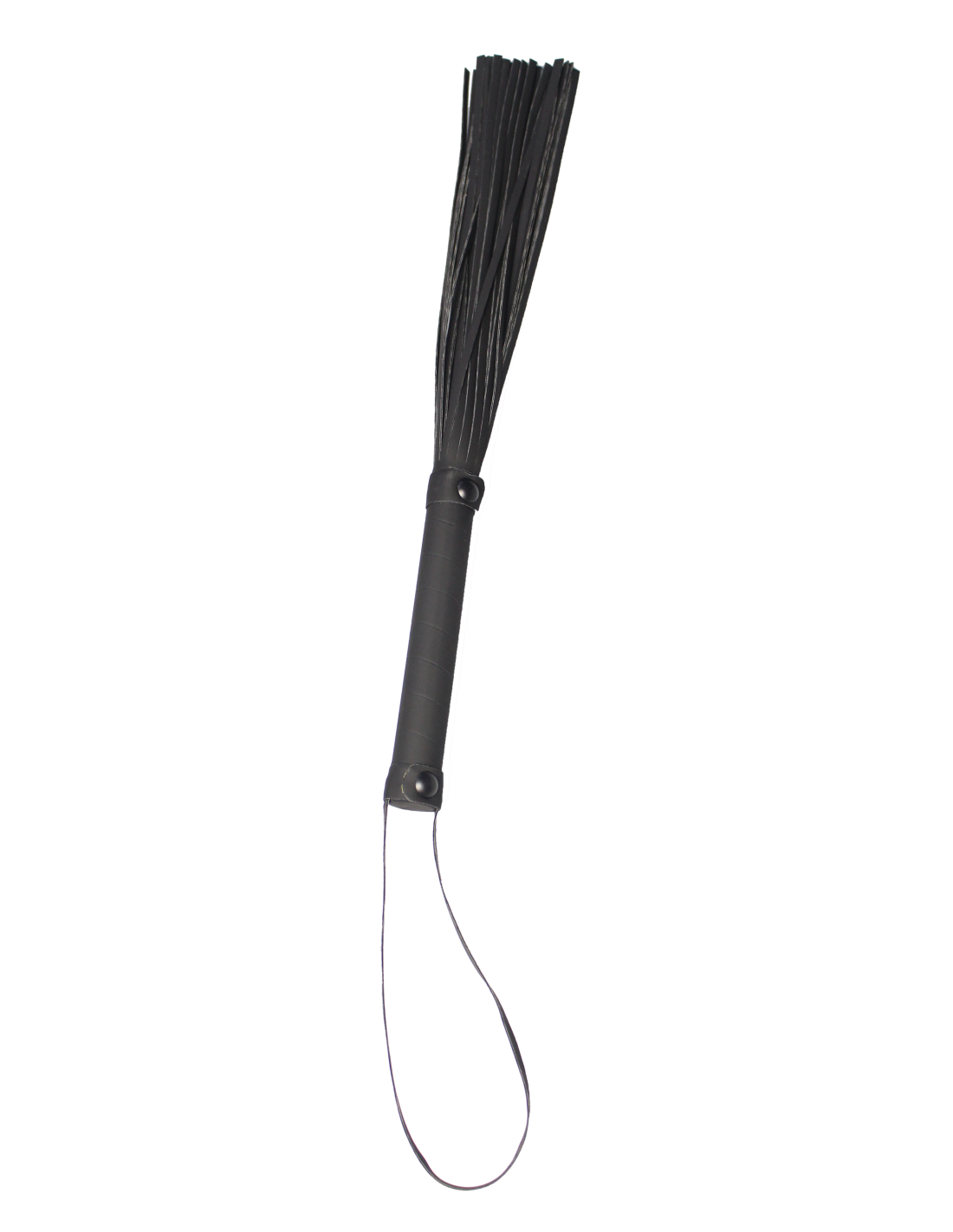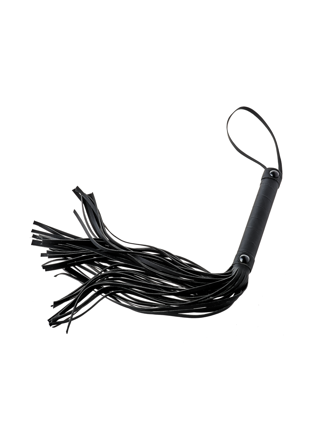 Flogger con cuerdas de aspecto cuero de 24 cm de largo. Mango de fácil agarre hecho del mismo material negro con un práctico cordón para la muñeca.