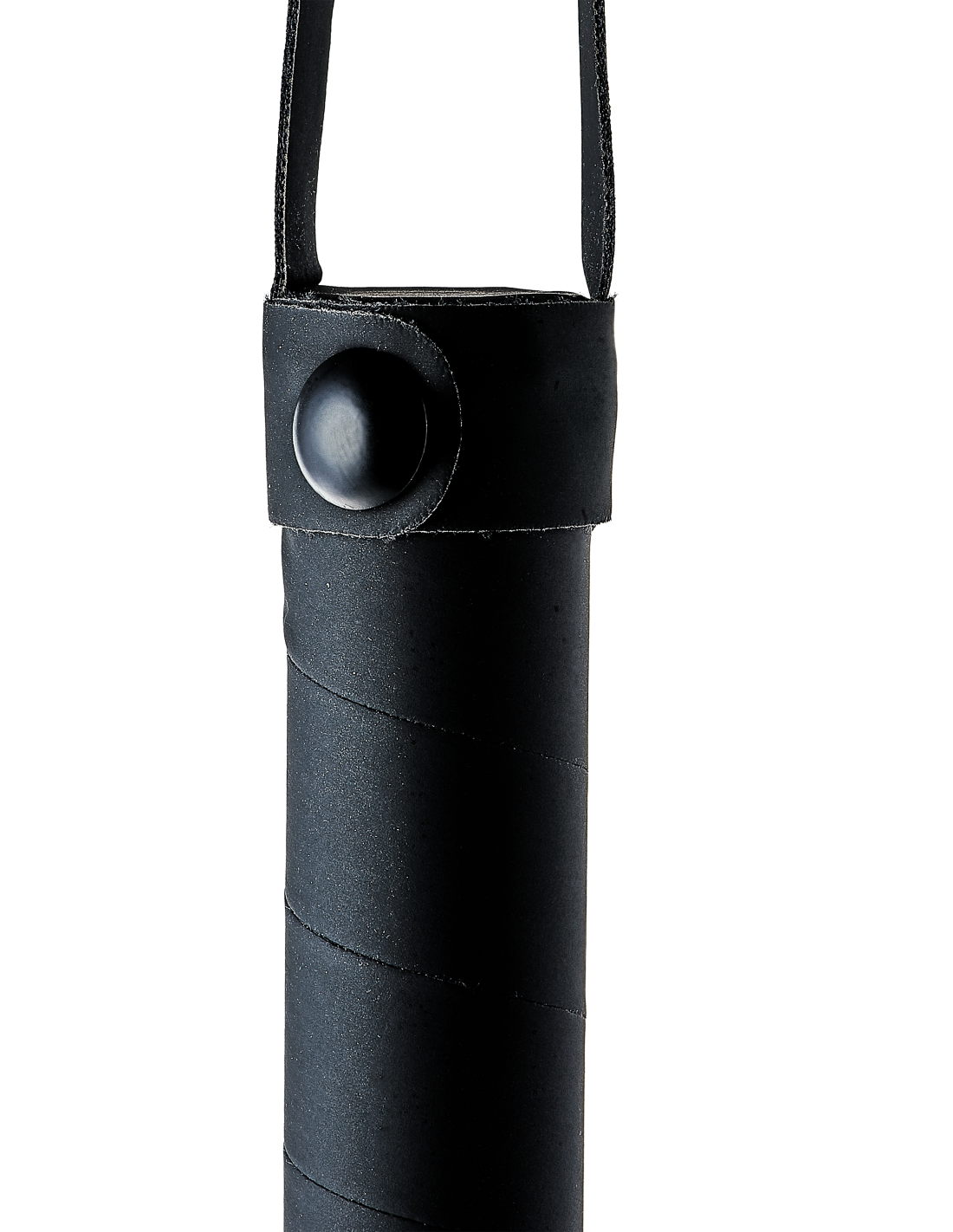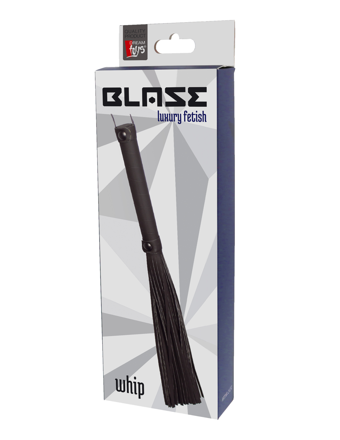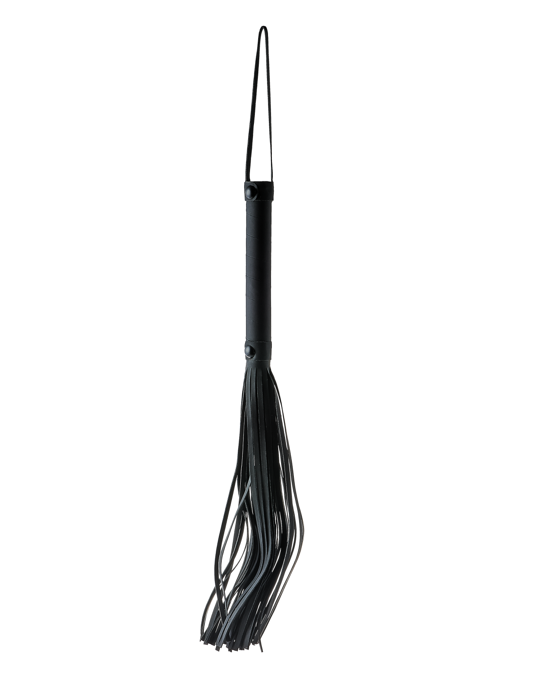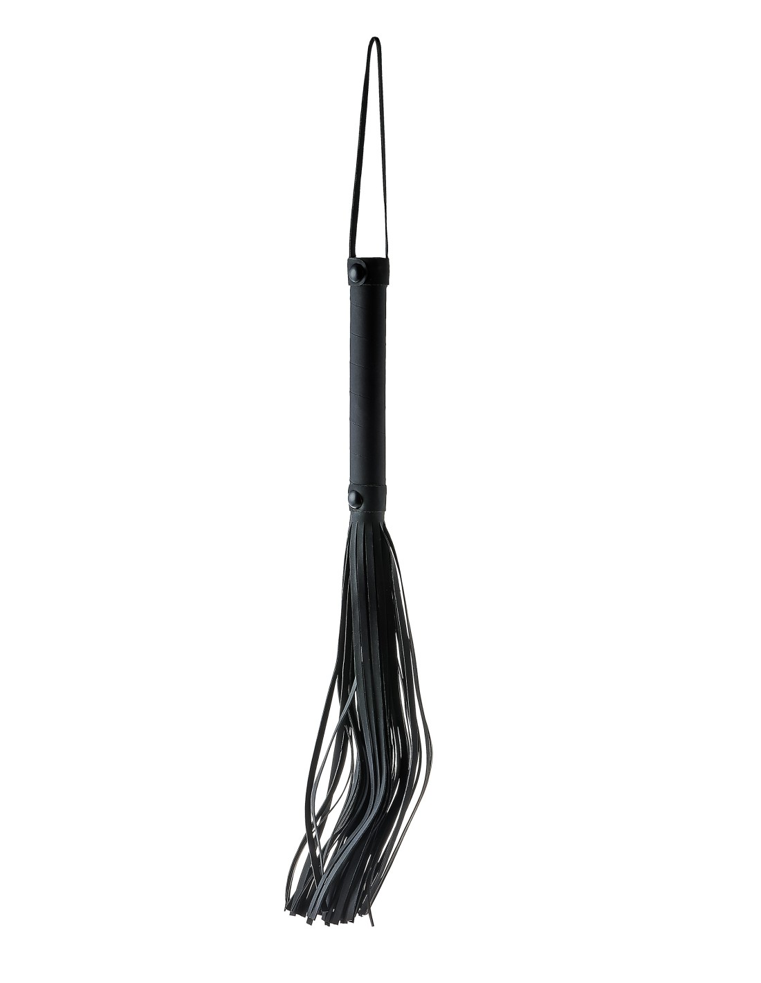 Flogger con cuerdas de aspecto cuero de 24 cm de largo. Mango de fácil agarre hecho del mismo material negro con un práctico cordón para la muñeca.