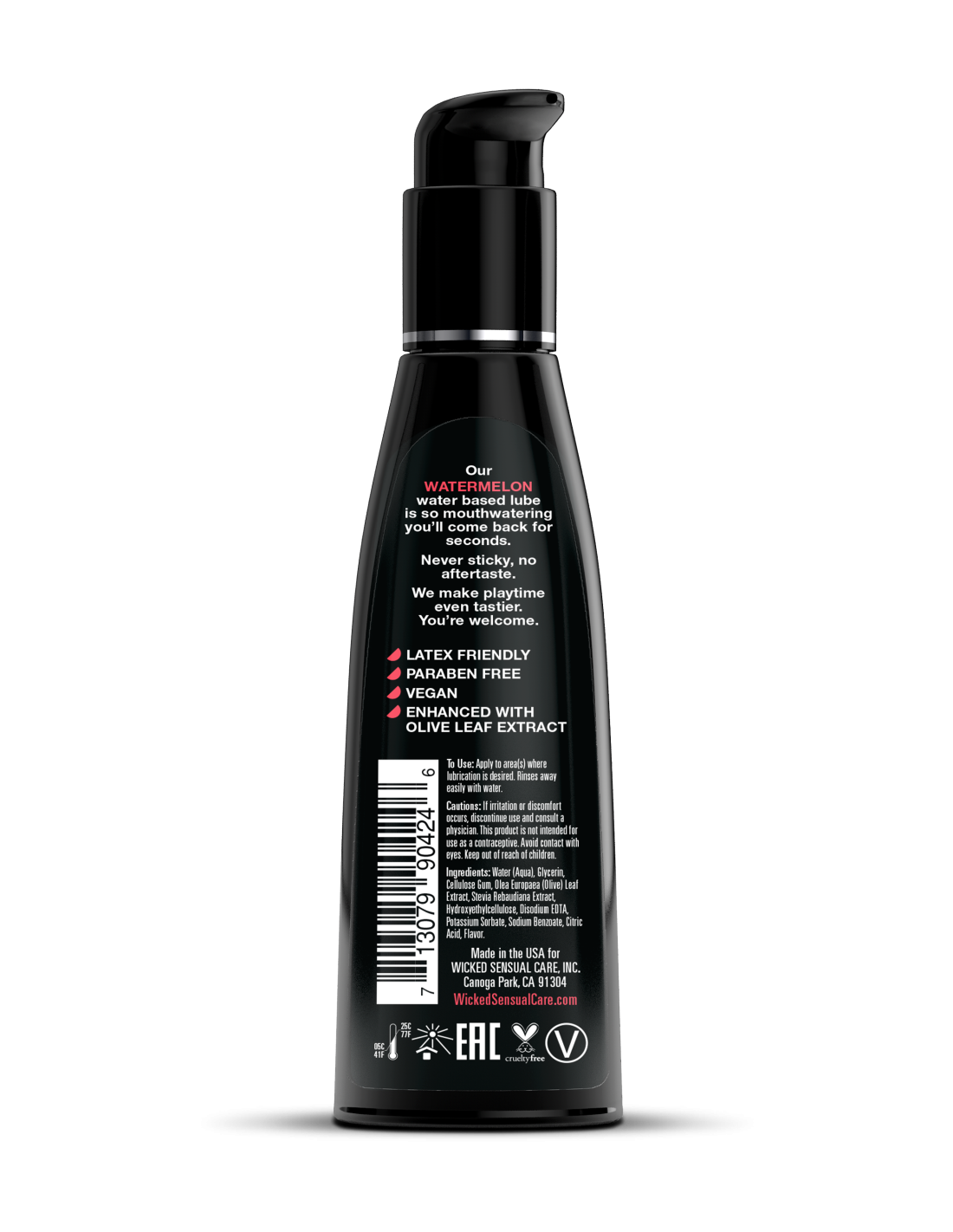 ¡Trae el verano a tu vida sexual! Besable, lamible y delicioso, el lubricante personal Wicked Aqua Watermelon agrega sabores naturales sutiles y deliciosos para mejorar los placeres orales. Ligera y sedosa, esta fórmula a base de agua es la combinación sensual perfecta de un lubricante elegante y una sensación de sabor. Nunca pegajoso y sin regusto, Wicked Aqua Watermelon satisface tu gusto por lo dulce y tus deseos íntimos, todo en un increíble producto de placer. El sexo oral nunca supo tan bien. Ya sea que estés dando o recibiendo, los sabores Wicked te darán una nueva confianza sexy. Los lubricantes con sabor Wicked están endulzados con Stevia, lo que los hace seguros para el juego oral, vaginal y anal.