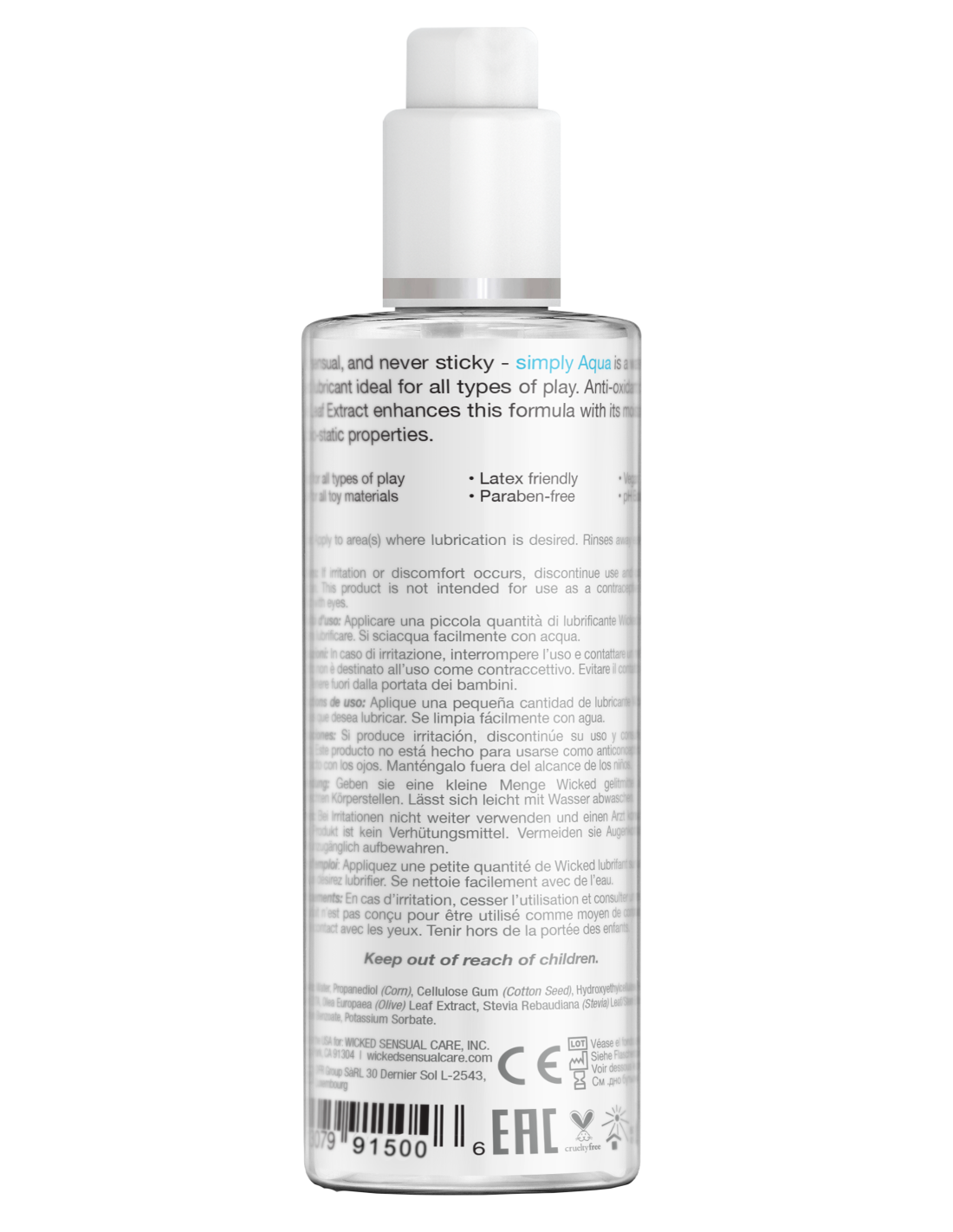 Wicked se trata de brindar opciones en sus fórmulas y la línea Simply realmente complementa la línea de productos Wicked Sensual Care, mientras atiende a las personas. que son particularmente exigentes con los ingredientes de su lubricante. La línea de productos Simply ofrece la calidad Wicked Sensual Care con algunos beneficios nuevos. Simply Aqua es un deslizamiento increíble que aporta un nuevo atributo: esta es una fórmula de reactivación, con Stevia agregada a su fórmula, por lo que es realmente excelente para todo tipo de juego y placentero para la boca.