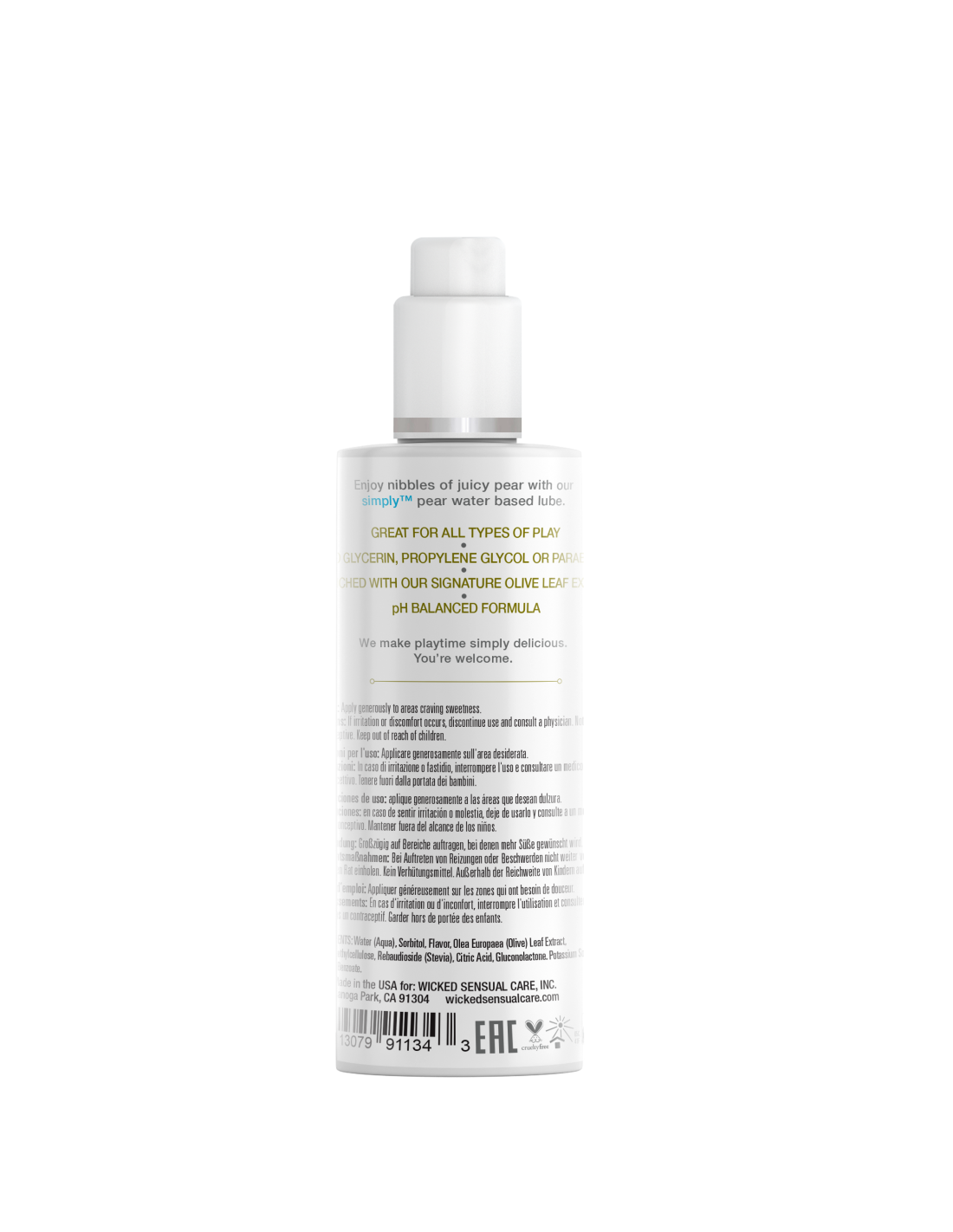 Disfrute de bocados de jugosa pera con el lubricante a base de agua Simply™. Wicked acaba de hacer que la hora de jugar sea simplemente deliciosa. Simply™ Pear es un lubricante con sabor limpio y sencillo.