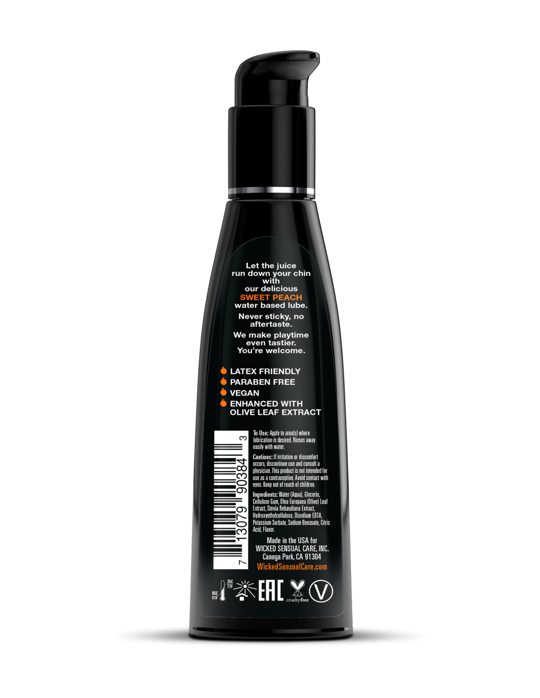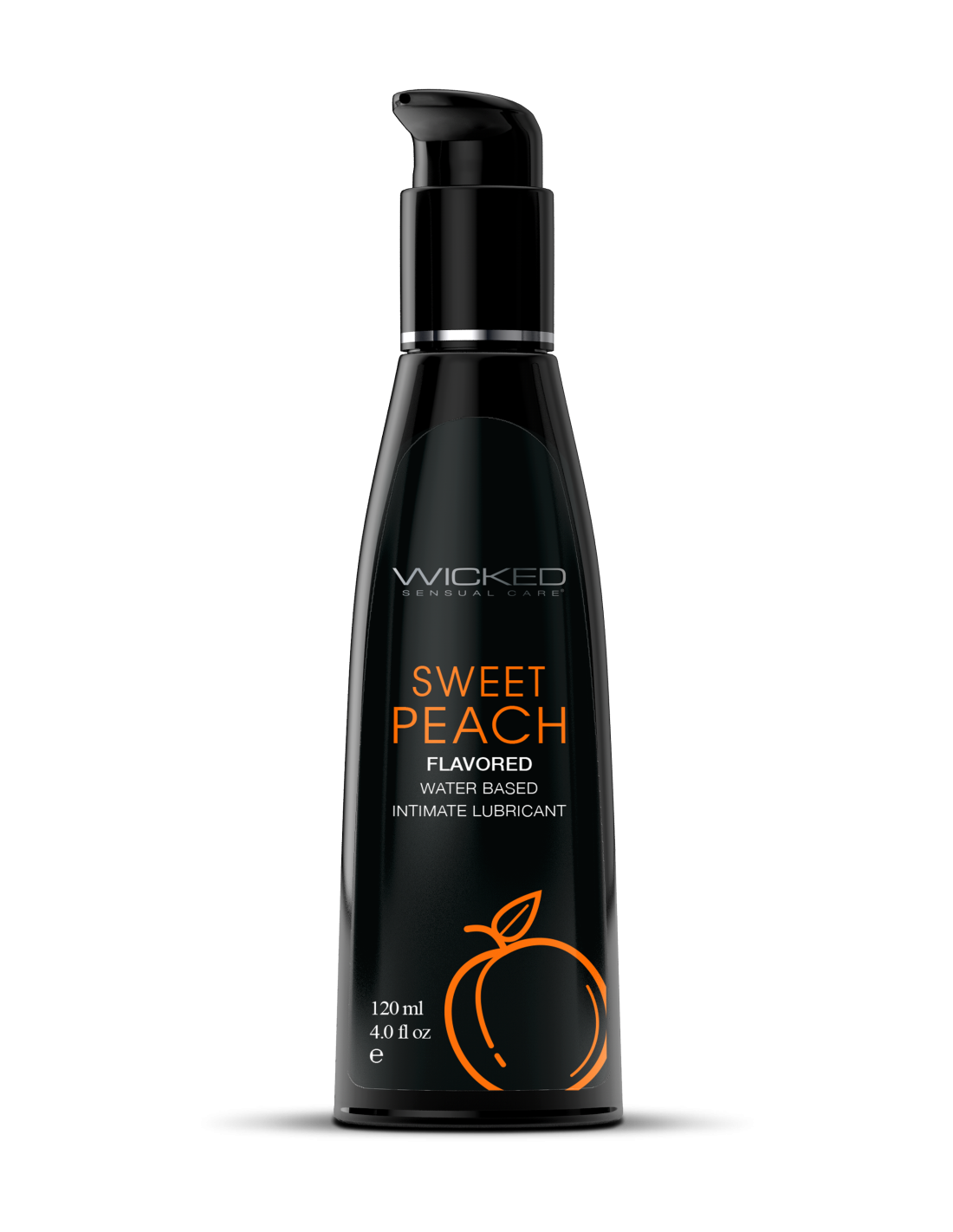 ¡Llamando a todos los amantes del melocotón! El lubricante personal Wicked Aqua Sweet Peach, besable, lamible y delicioso, agrega sabores naturales sutiles y deliciosos para mejorar los placeres orales. Ligera y sedosa, esta fórmula a base de agua es la combinación sensual perfecta de un lubricante elegante y una sensación de sabor. Nunca pegajoso y sin regusto, Wicked Aqua Sweet Peach satisface tu gusto por lo dulce y tus deseos íntimos, todo en un increíble producto de placer. El sexo oral nunca supo tan bien. Ya sea que estés dando o recibiendo, los sabores Wicked te darán una nueva confianza sexy. Los lubricantes con sabor Wicked están endulzados con Stevia, lo que los hace seguros para el juego oral, vaginal y anal.