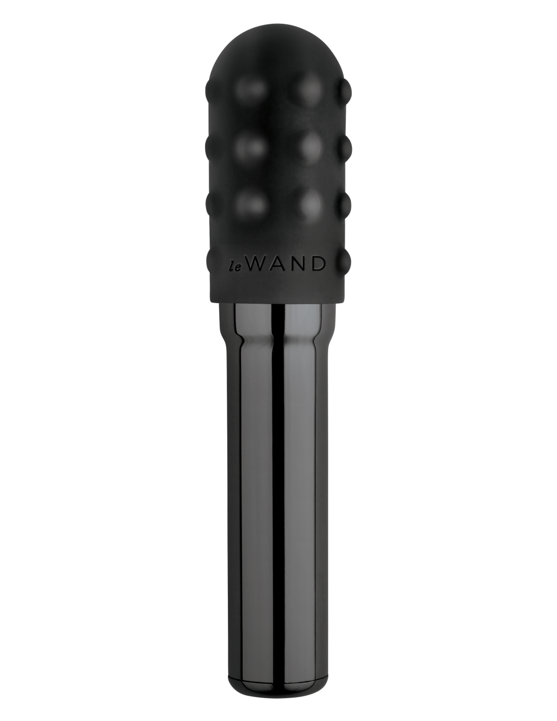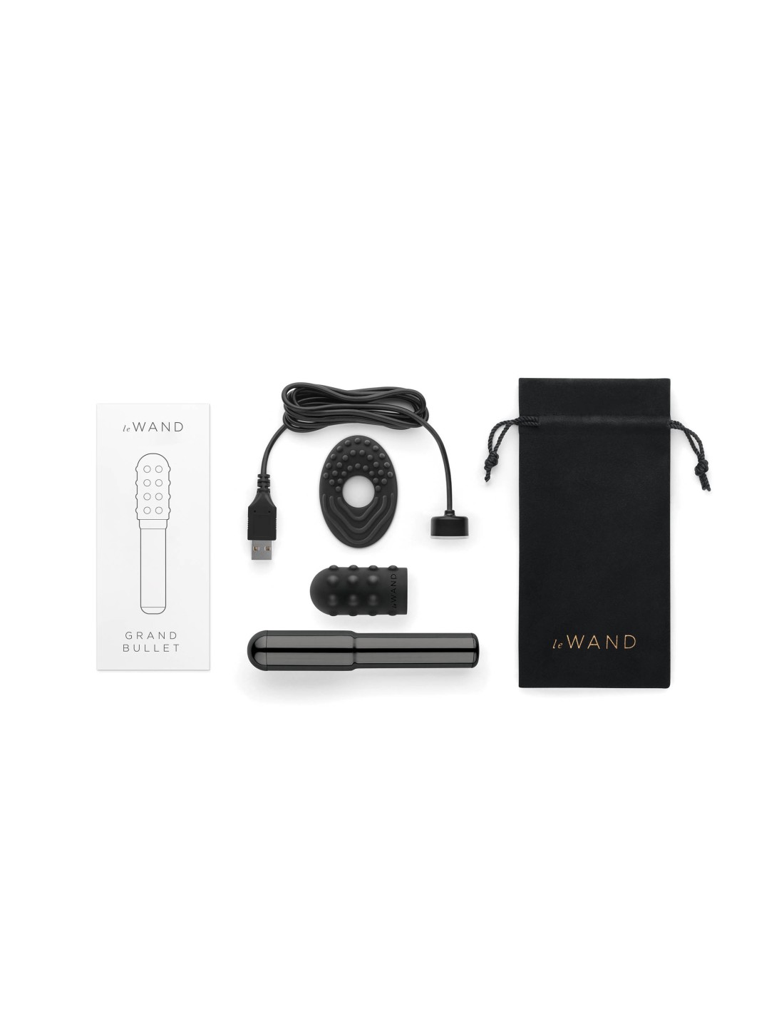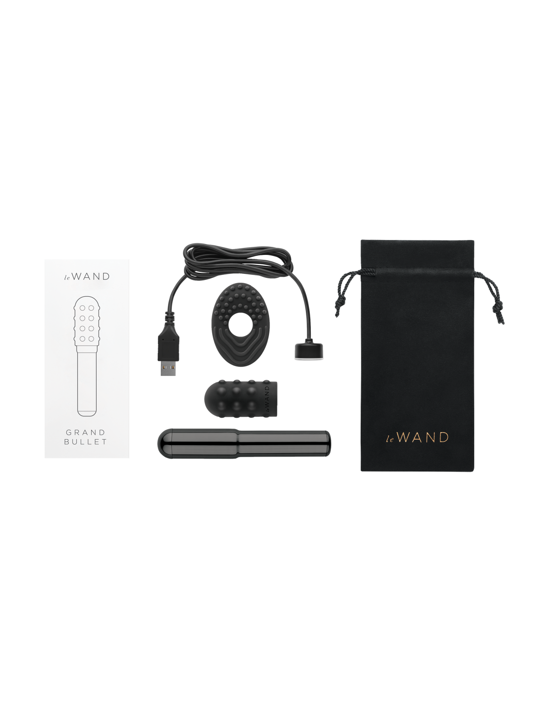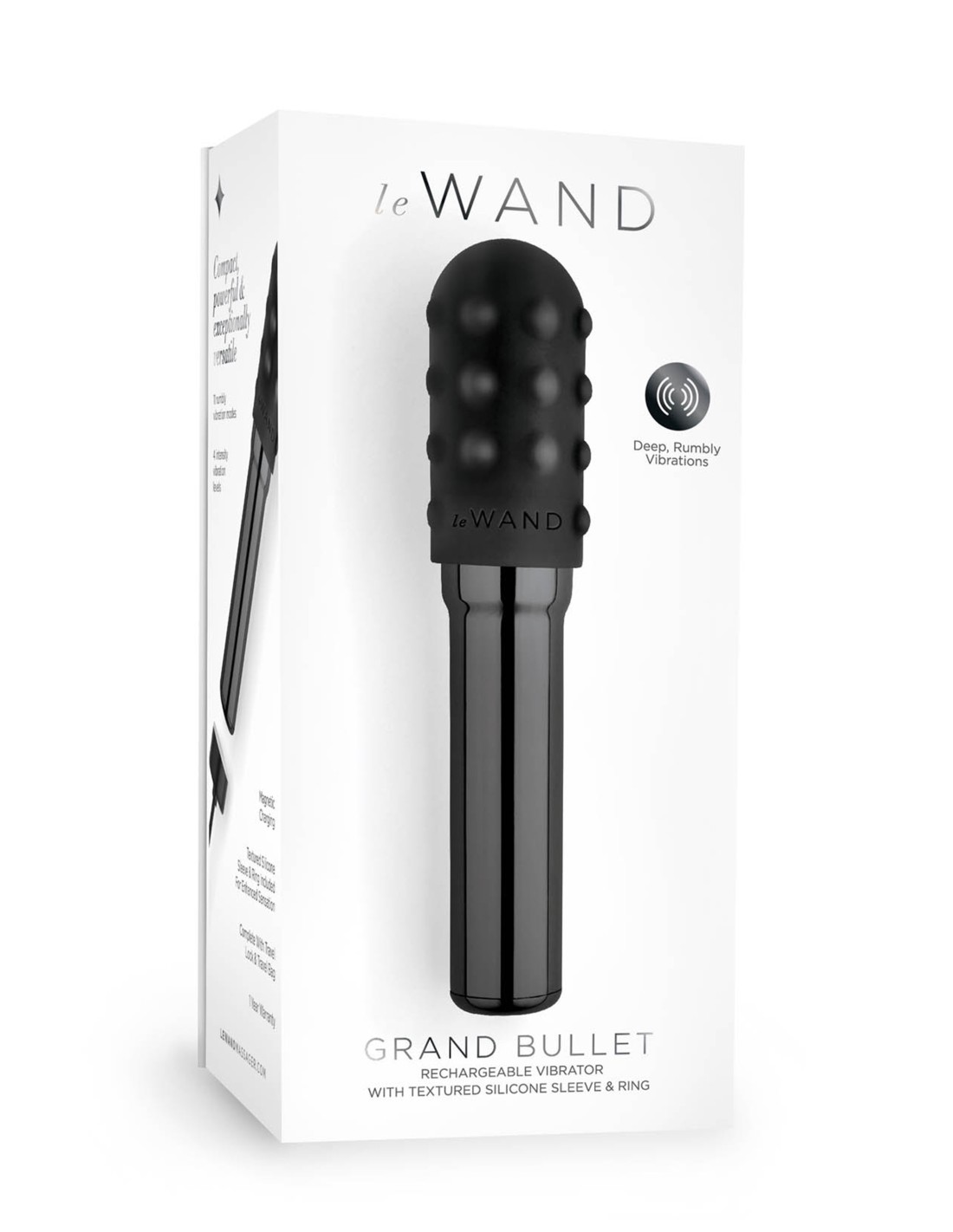 Le Wand Grand Bullet, vibrador recargable con anillo texturizado de silicona. LE WAND Grand Bullet es la versión más grande del vibrador de forma cónica que te guiará a lugares fantásticos después de tu viaje de masturbación. Lo que diferencia al Grand Bullet es su estructura en forma de tubo que se estrecha hacia afuera en la parte superior, lo que le da al juguete un asa para aquellos que necesitan un agarre más seguro. El Grand Bullet también tiene un 40 % más de potencia que su homólogo más pequeño para jugadores avanzados que quieren un toque más fuerte cuando llegan al clímax. El Grand Bullet es seguro para el cuerpo, recargable por USB y viene con una funda de silicona texturizada extraíble para mayor placer.El juego completo incluye: