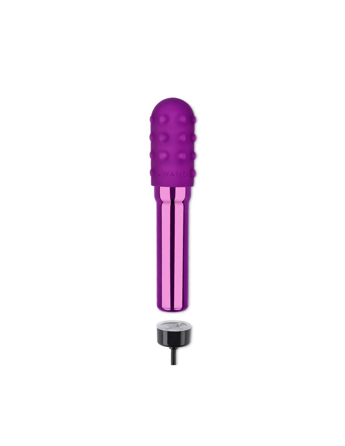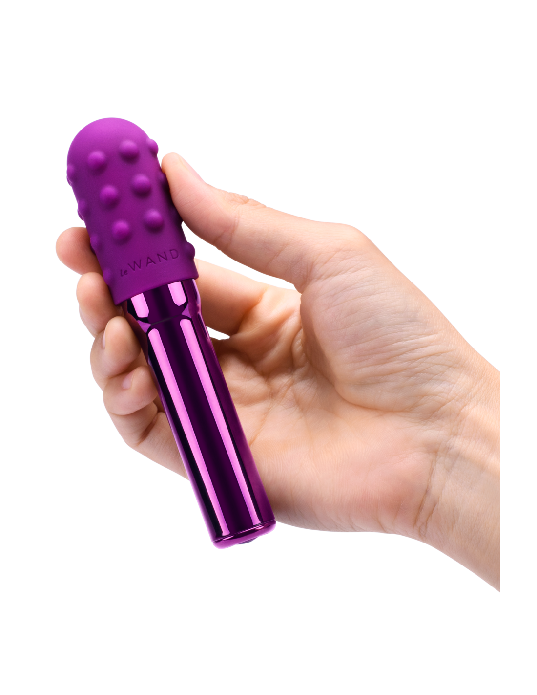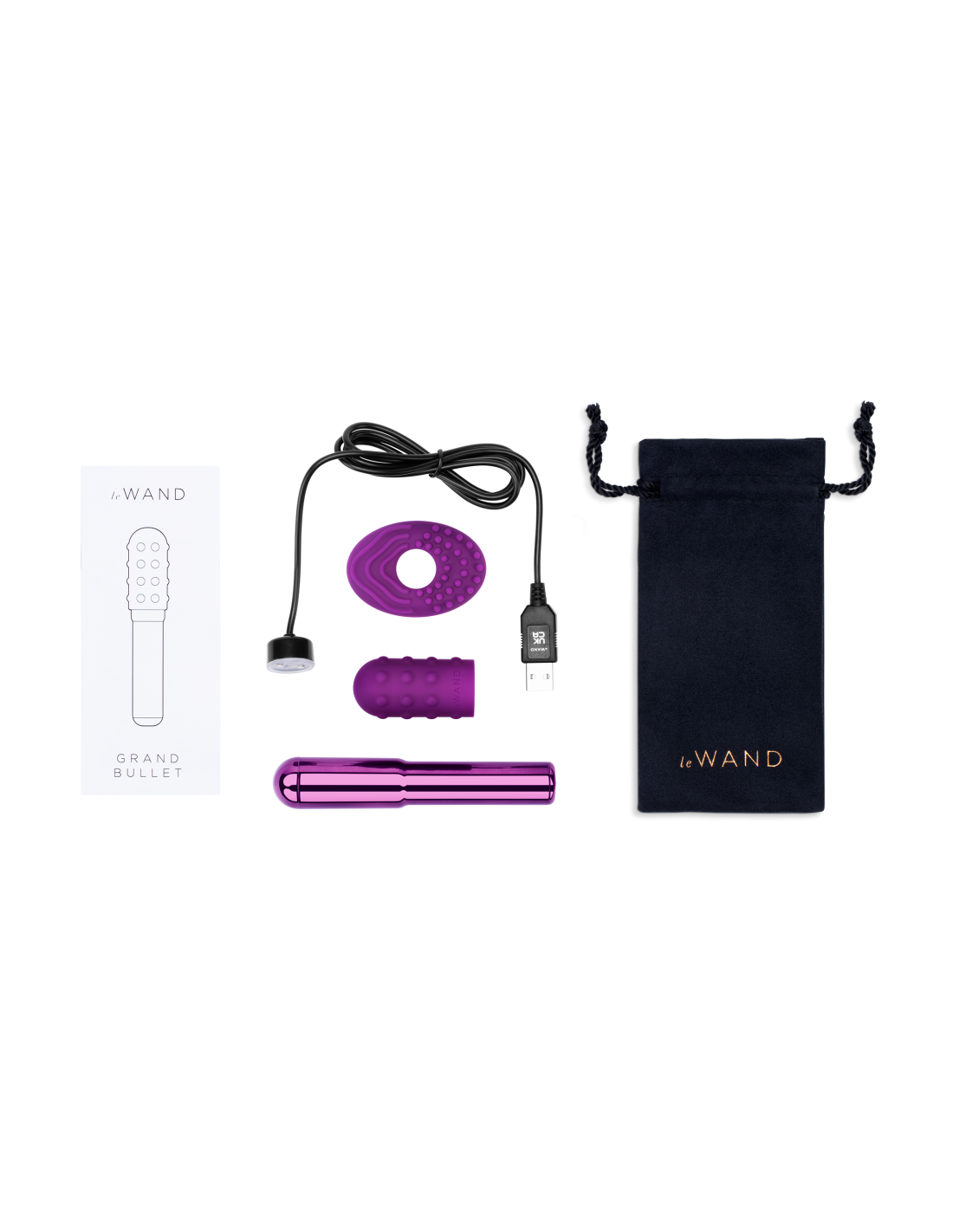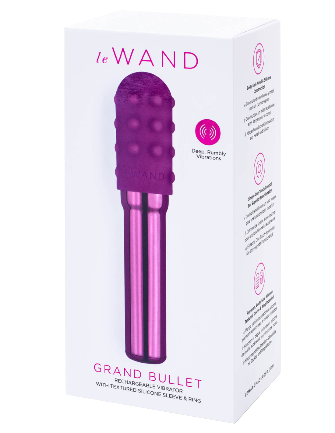 Le Wand Grand Bullet, vibrador recargable con anillo texturizado de silicona. LE WAND Grand Bullet es la versión más grande del vibrador de forma cónica que te guiará a lugares fantásticos después de tu viaje de masturbación. Lo que diferencia al Grand Bullet es su estructura en forma de tubo que se estrecha hacia afuera en la parte superior, lo que le da al juguete un asa para aquellos que necesitan un agarre más seguro. El Grand Bullet también tiene un 40 % más de potencia que su homólogo más pequeño para jugadores avanzados que quieren un toque más fuerte cuando llegan al clímax. El Grand Bullet es seguro para el cuerpo, recargable por USB y viene con una funda de silicona texturizada extraíble para mayor placer.El juego completo incluye: