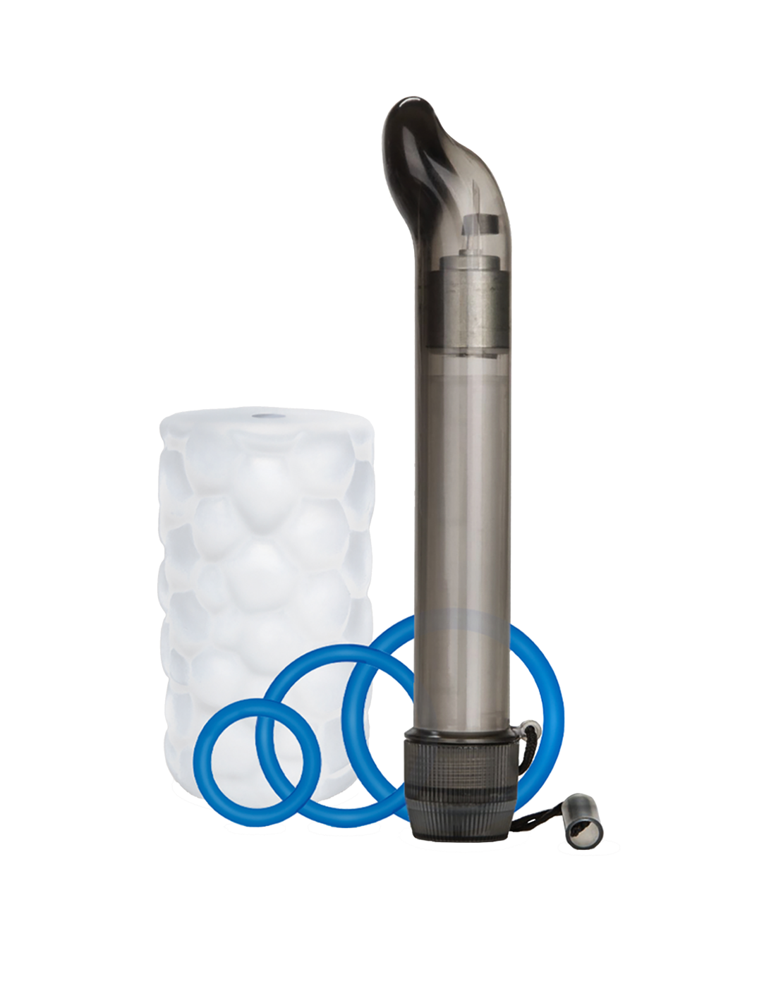 El kit de juguetes Daily Vibe™ de edición especial, debajo del cinturón, incluye un juego de 3 anillos de silicona, un masajeador de próstata de 5,5" (13,9 cm), un acariciador texturizado apretado y duradero y una bolsa para guardar juguetes con cordón.