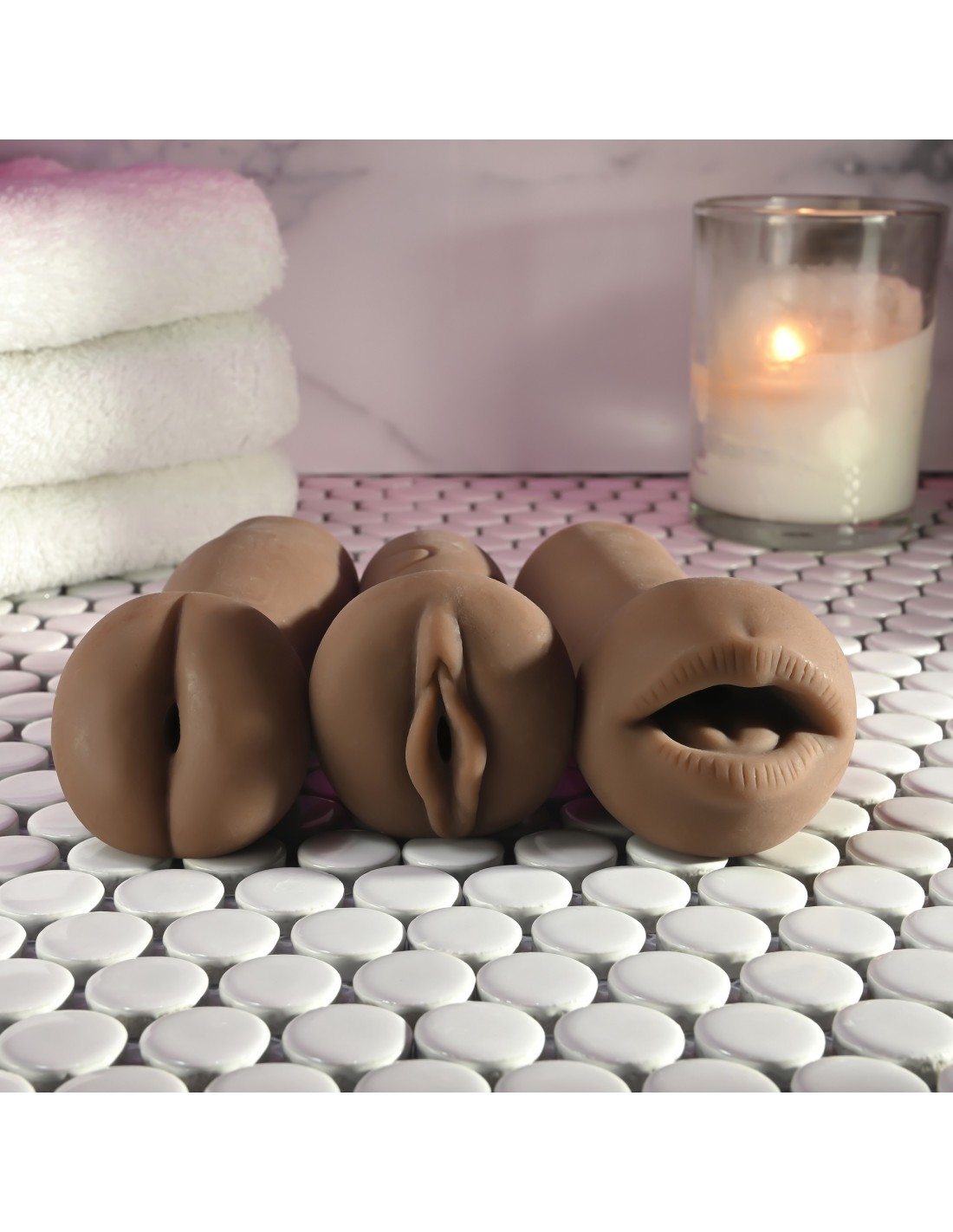 Cumple tus fantasías con estos 3 acariciadores realistas diseñados para combinar con tu estado de ánimo erótico. Cada acariciador presenta sus propias texturas de canal interno únicas para imitar el placer de las experiencias anales, vaginales y orales. Use lubricante para mejorar su placer de caricias.
