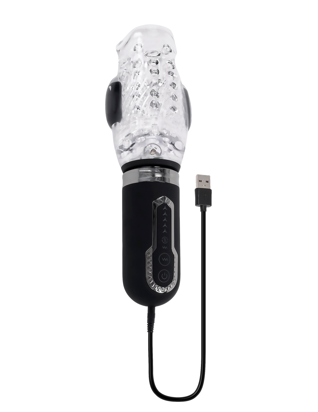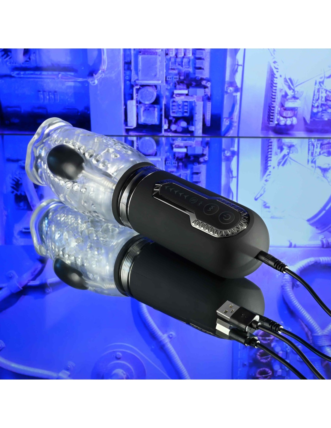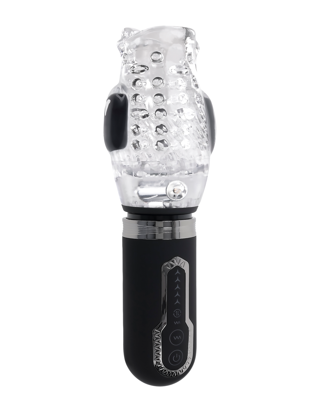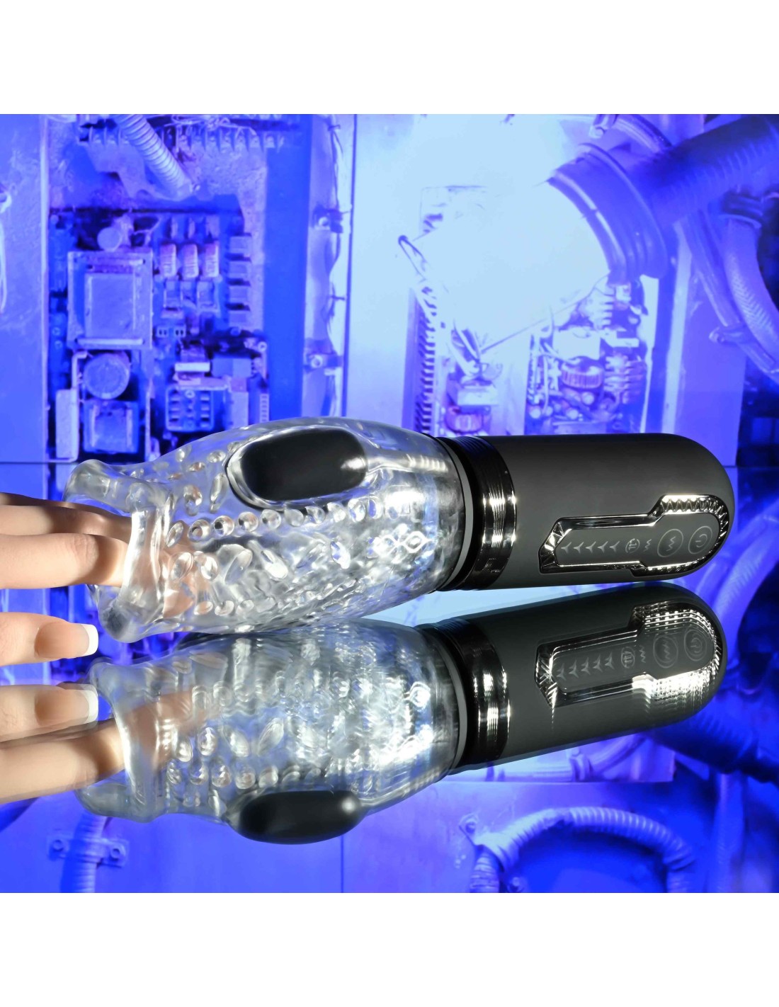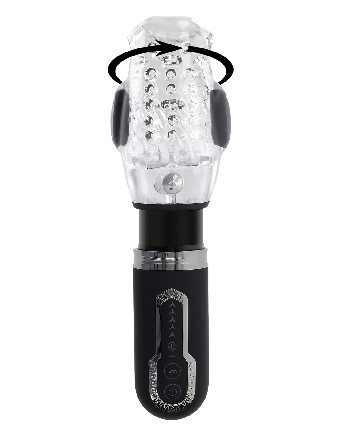 Experimente el triple éxtasis de un stroker que empuja, gira y vibra. Agarra el elegante mango mate y entra en la entrada en forma de boca que te envuelve rápidamente en un canal suave y elástico con protuberancias. Utilice el panel de control ergonómico para operar cada potente motor por separado, navegando entre la vibración, el empuje y el giro, o los tres a la vez para el máximo cumplimiento de fantasía.