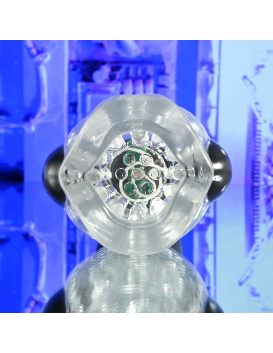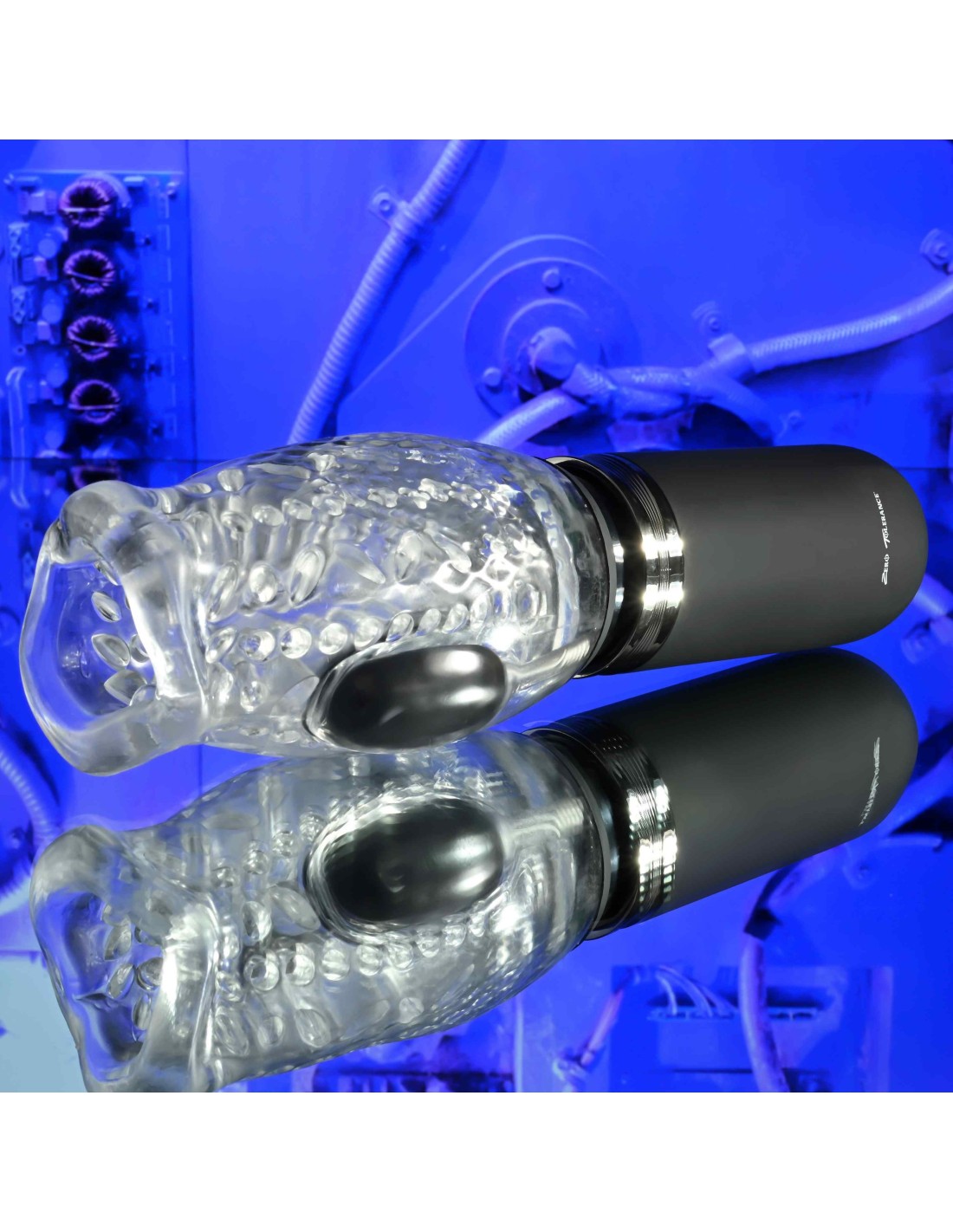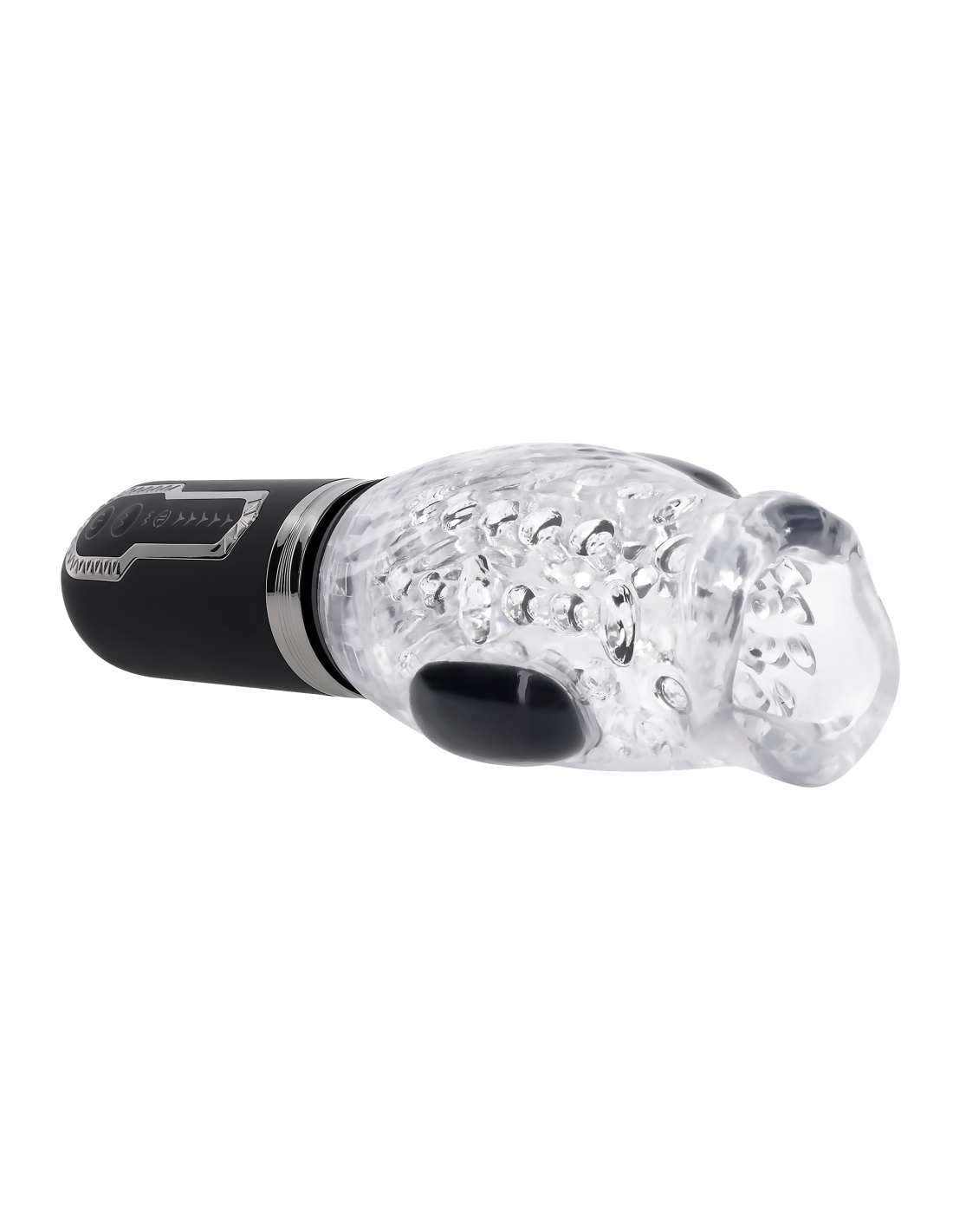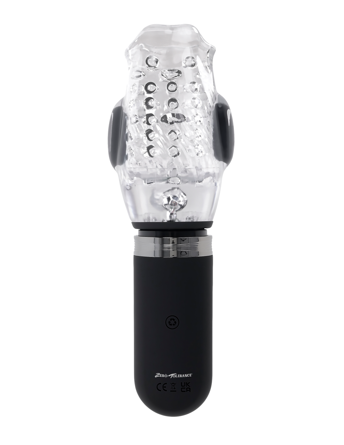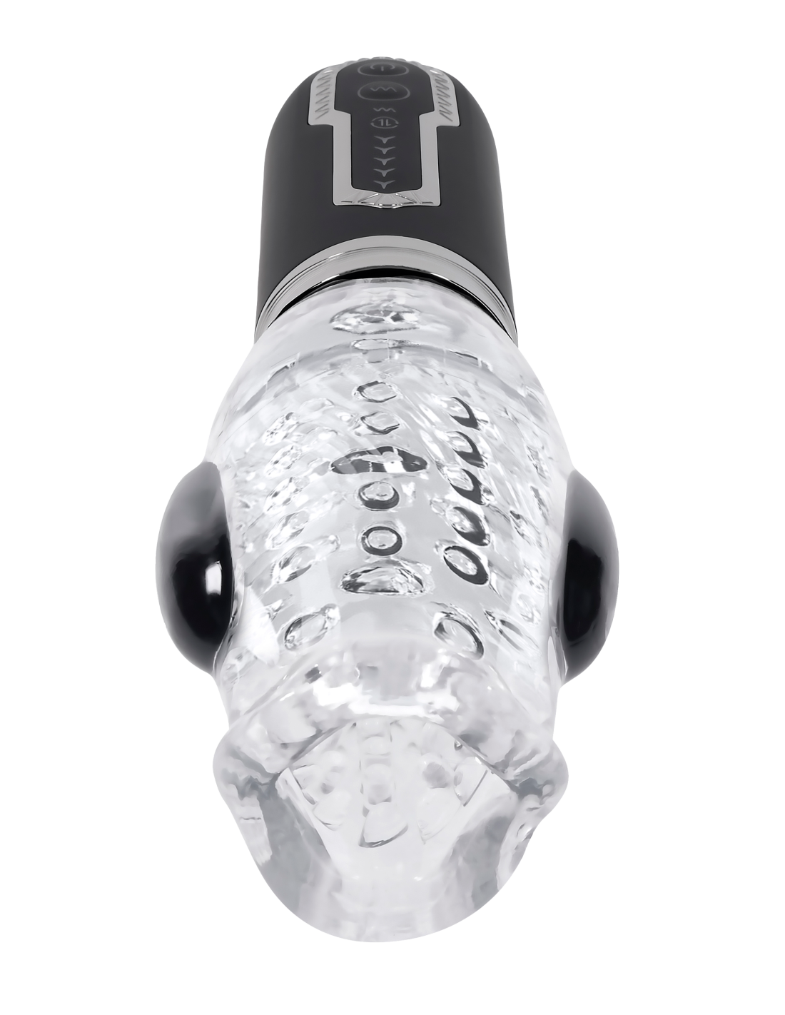 Experimente el triple éxtasis de un stroker que empuja, gira y vibra. Agarra el elegante mango mate y entra en la entrada en forma de boca que te envuelve rápidamente en un canal suave y elástico con protuberancias. Utilice el panel de control ergonómico para operar cada potente motor por separado, navegando entre la vibración, el empuje y el giro, o los tres a la vez para el máximo cumplimiento de fantasía.