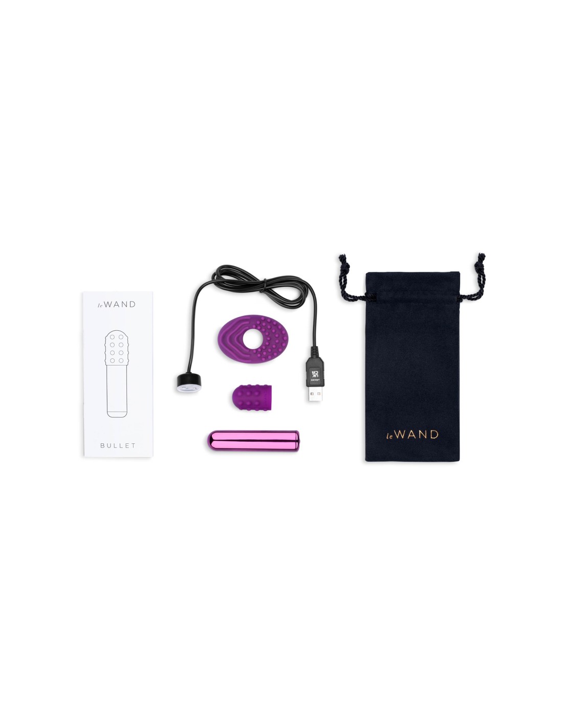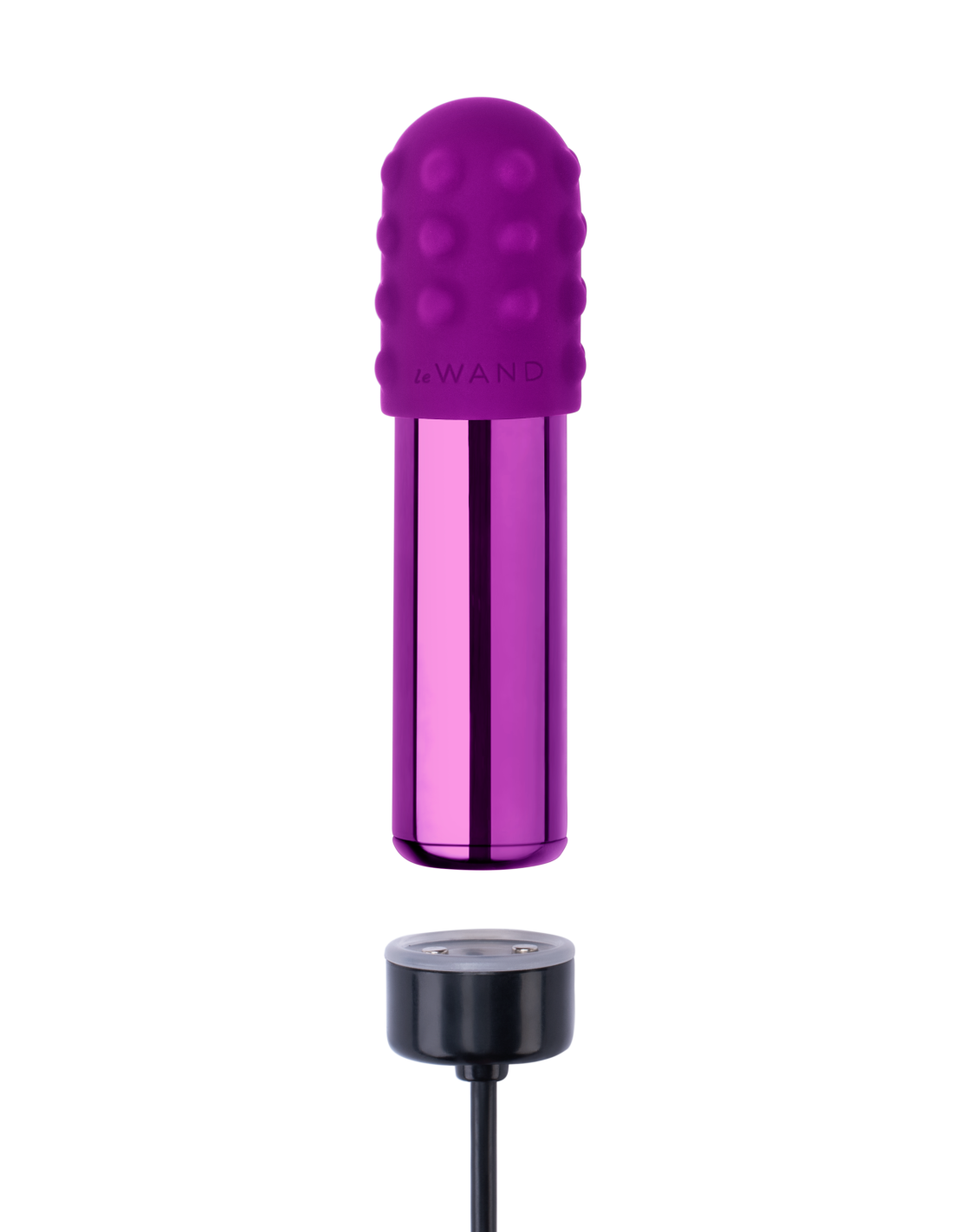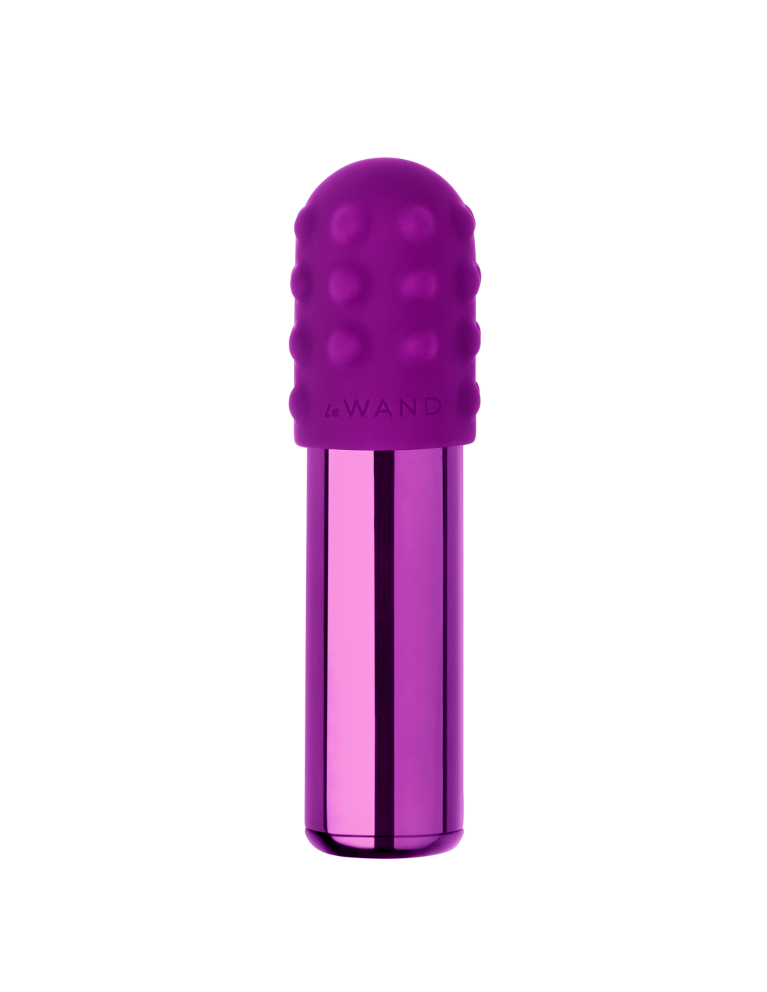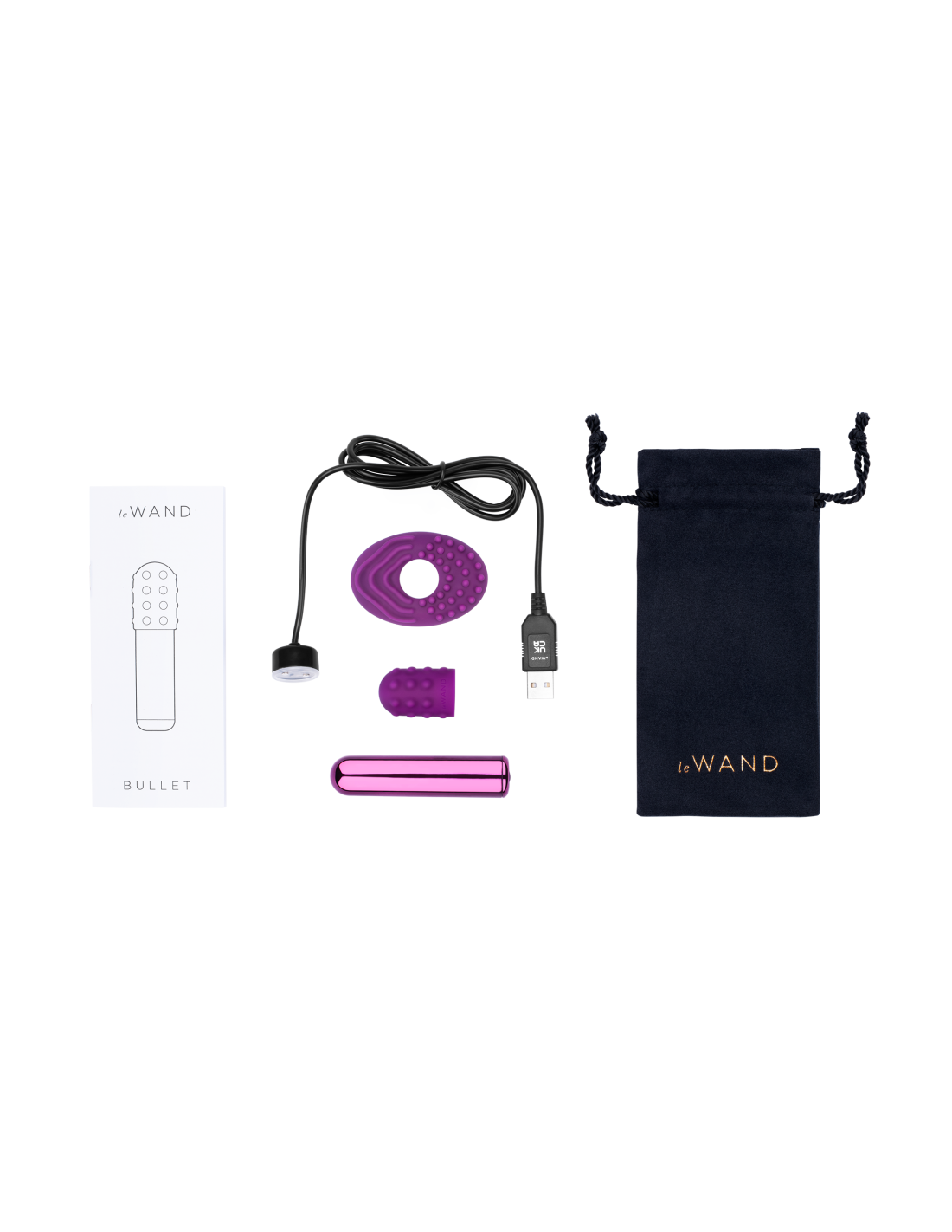 Le Wand Bullet, vibrador recargable con anillo texturizado de silicona. Perfecto para principiantes, LE WAND Bullet es un modelo lindo y divertido. Una pequeña vibración que es engañosa pero que tiene suficiente poder para llevarte al límite. Elegante y fácil de usar, Bullet tiene controles accesibles de un toque en la parte inferior de su marco redondeado y, al mismo tiempo, está completamente recubierto de metal seguro para el cuerpo. Este mini vibrador Bullet recargable viene con una funda de silicona texturizada extraíble para mayor placer. ¡Dicen que las cosas grandes vienen en paquetes pequeños!El juego completo incluye: