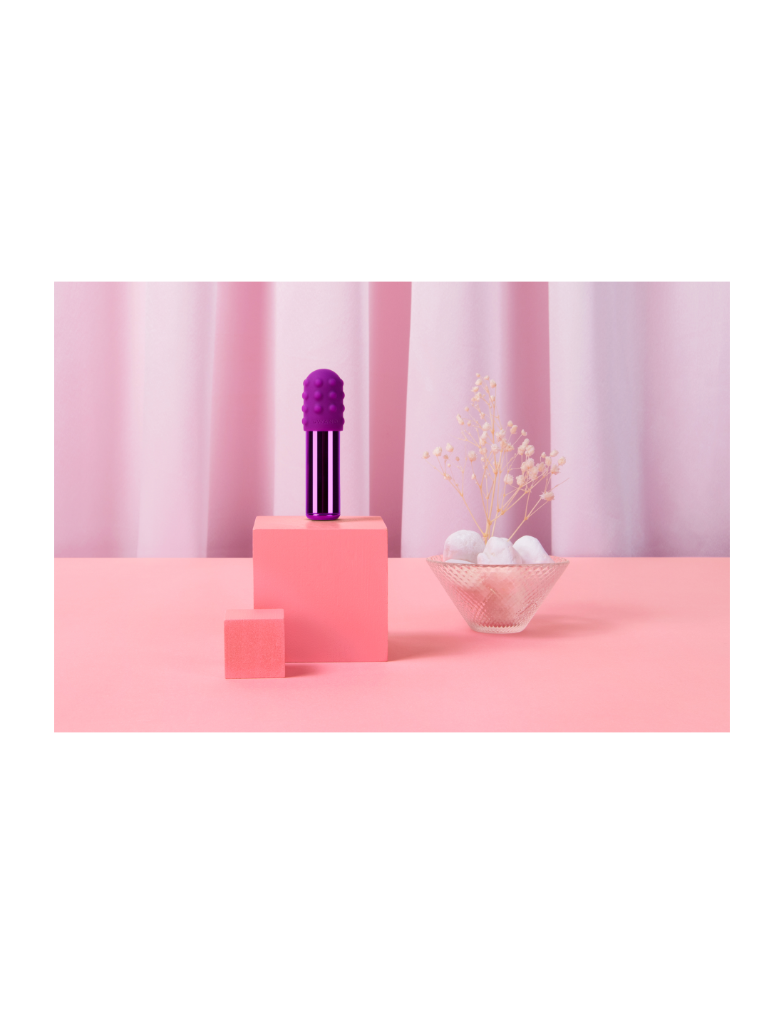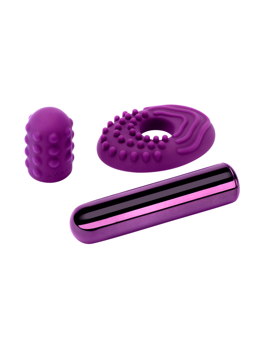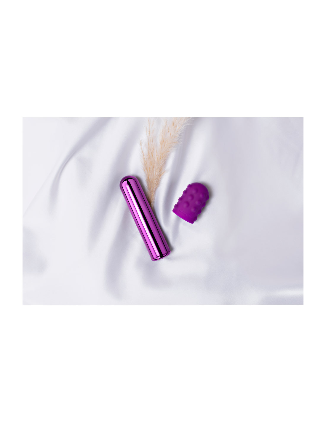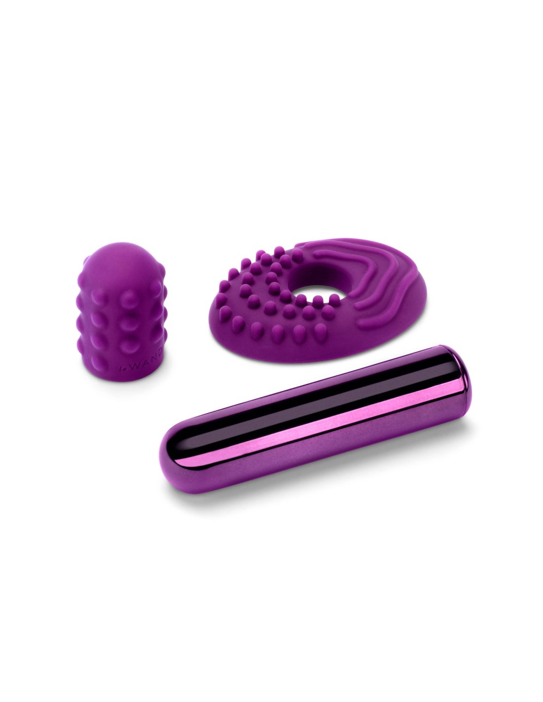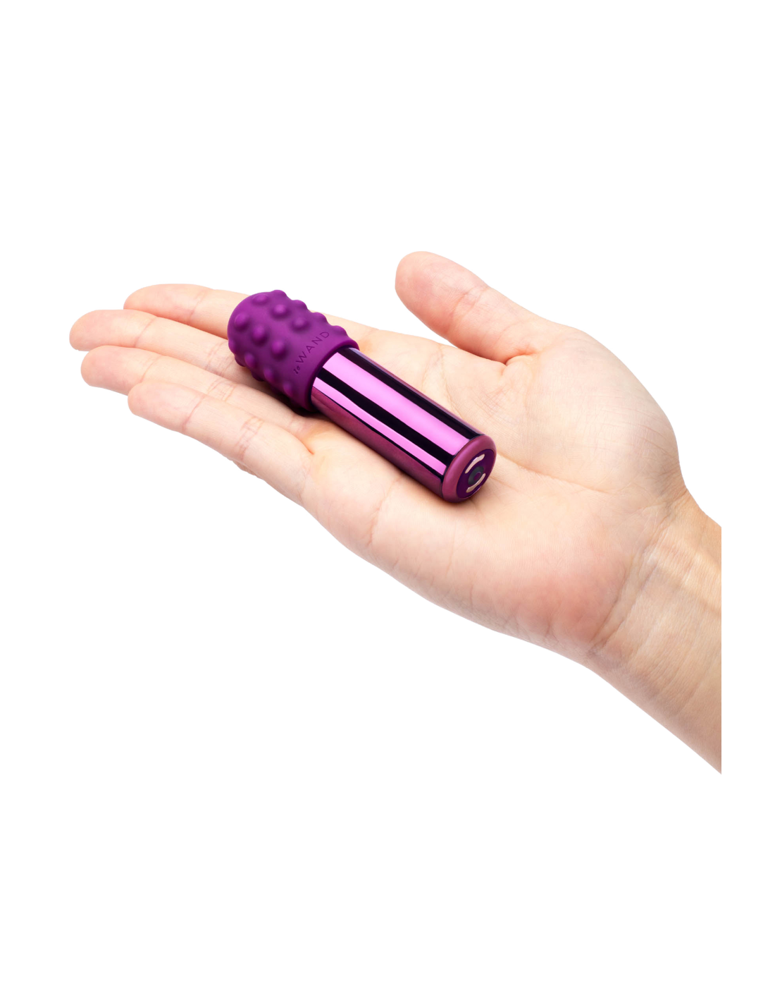 Le Wand Bullet, vibrador recargable con anillo texturizado de silicona. Perfecto para principiantes, LE WAND Bullet es un modelo lindo y divertido. Una pequeña vibración que es engañosa pero que tiene suficiente poder para llevarte al límite. Elegante y fácil de usar, Bullet tiene controles accesibles de un toque en la parte inferior de su marco redondeado y, al mismo tiempo, está completamente recubierto de metal seguro para el cuerpo. Este mini vibrador Bullet recargable viene con una funda de silicona texturizada extraíble para mayor placer. ¡Dicen que las cosas grandes vienen en paquetes pequeños!El juego completo incluye: