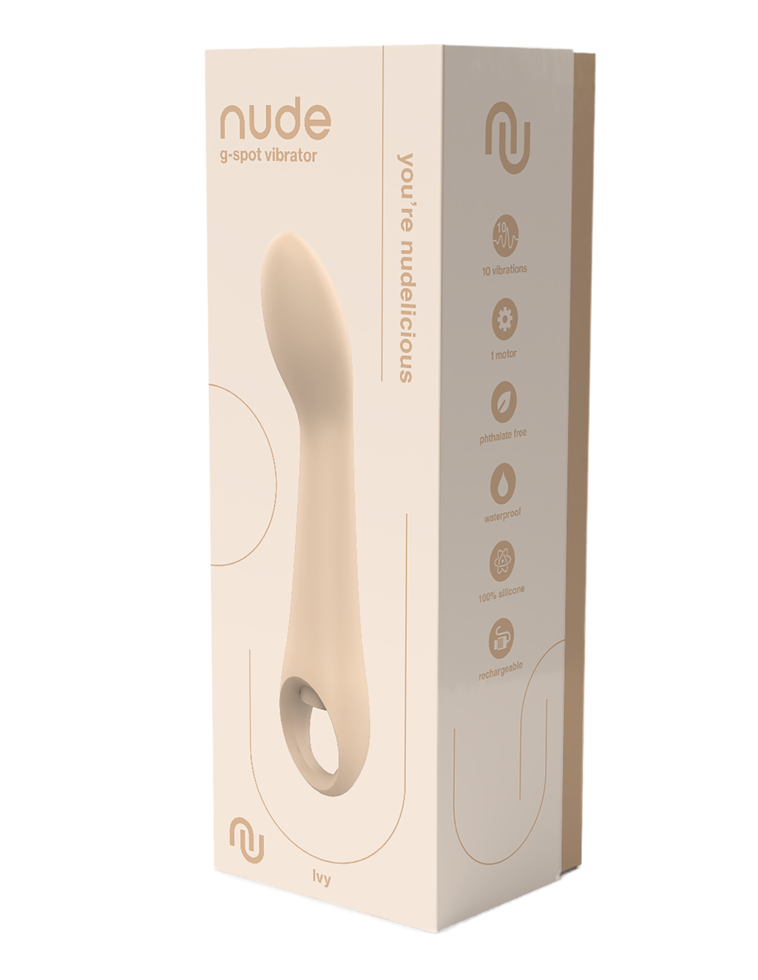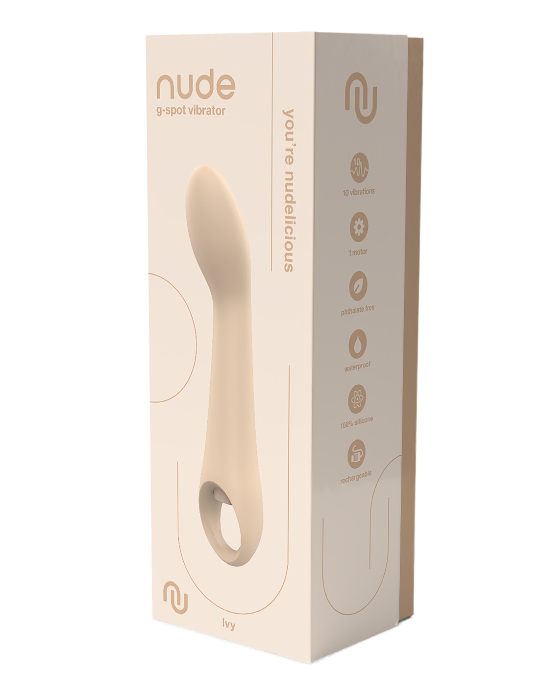 Este vibrador de punto G Nude Ivy es fácil de usar gracias al botón único para recorrer las 10 vibraciones fuertes. Tiene 7 ritmos y 3 velocidades. Este vibrador Nude está hecho de silicona suave y ABS, libre de ftalatos y seguro para el cuerpo. Ivy tiene una clasificación IPX6 de resistencia al agua. Para cargar después de su uso, el vibrador tiene un orificio de carga impermeable. Se incluye un cable con clavija USB. Después de una carga completa, tu vibración Nude estará lista para 90 minutos de deleite nudelico. Largo 20,1 cm, diámetro 3,8 cm.