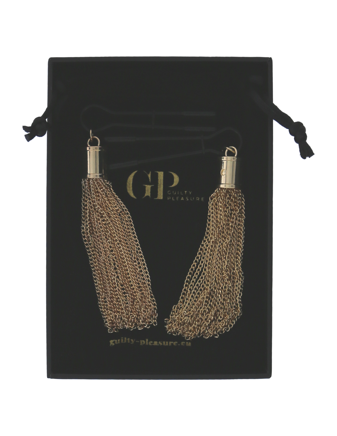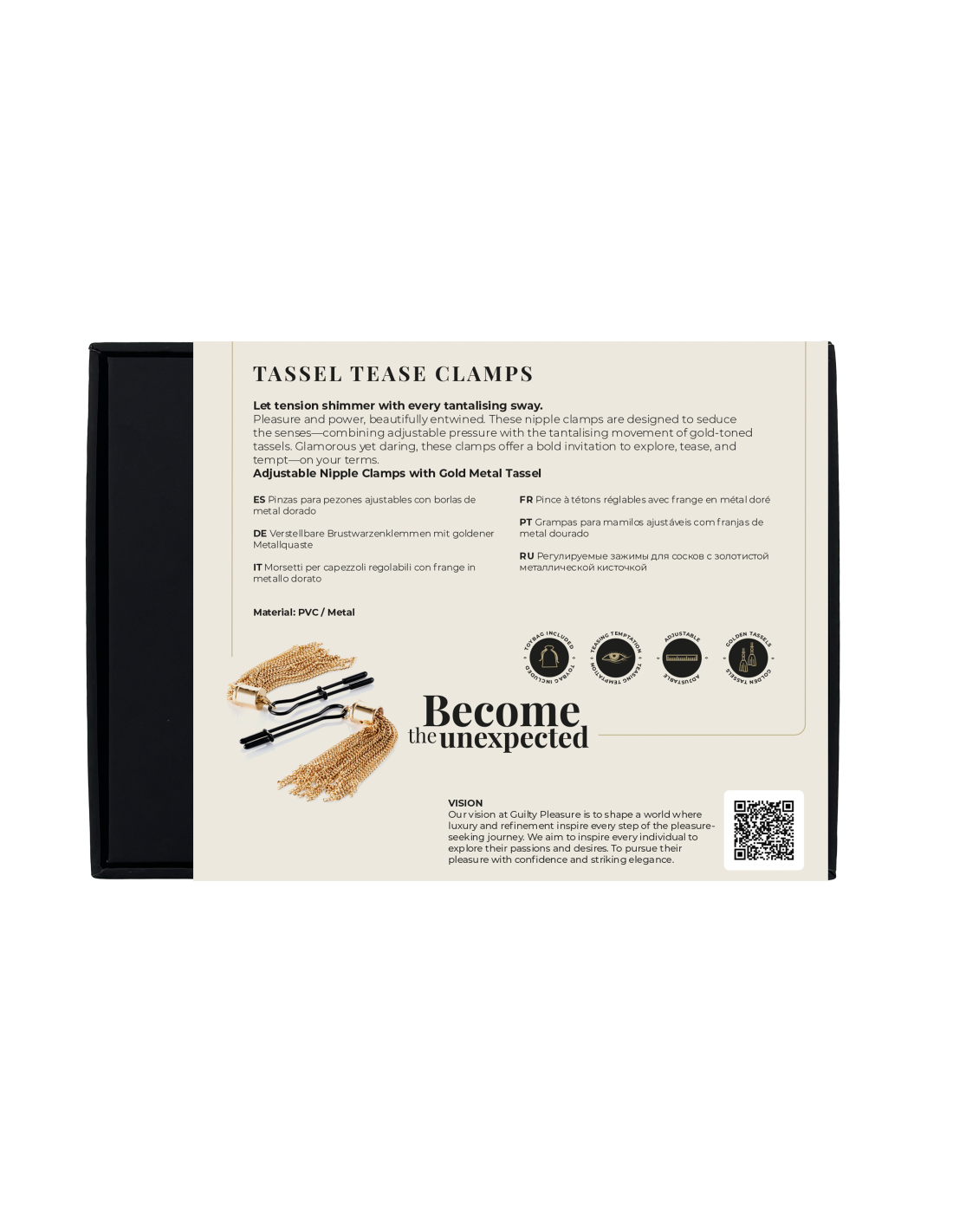 Las pinzas Tassel Tease son una declaración de control, seducción y provocación visual, perfect para elevar el juego íntimo con elegancia y vanguardia. Diseñadas con elegantes herrajes dorados y terminadas con borlas de cadena brillantes, estas pinzas ajustables para pezones logran el equilibrio entre belleza y mordida.