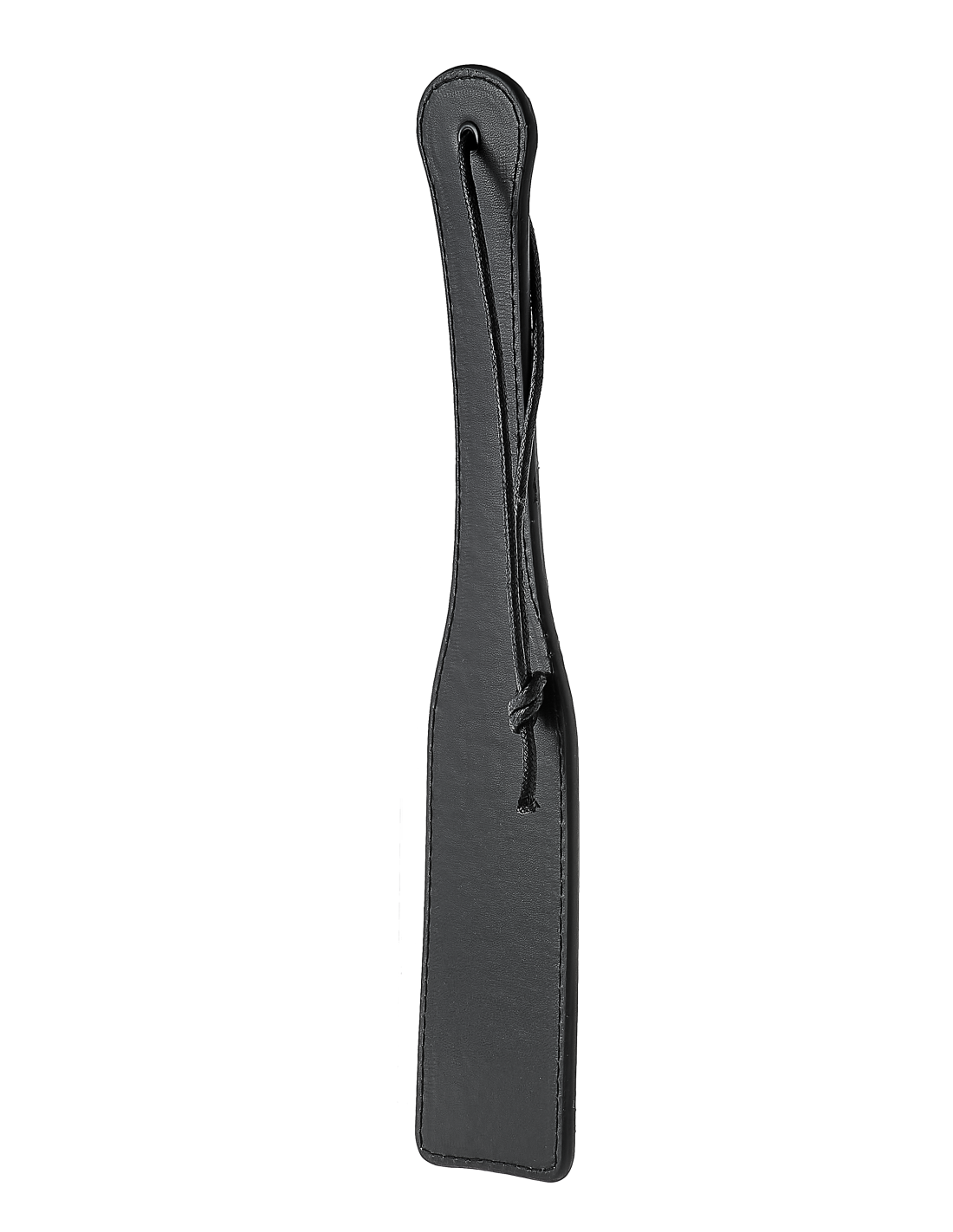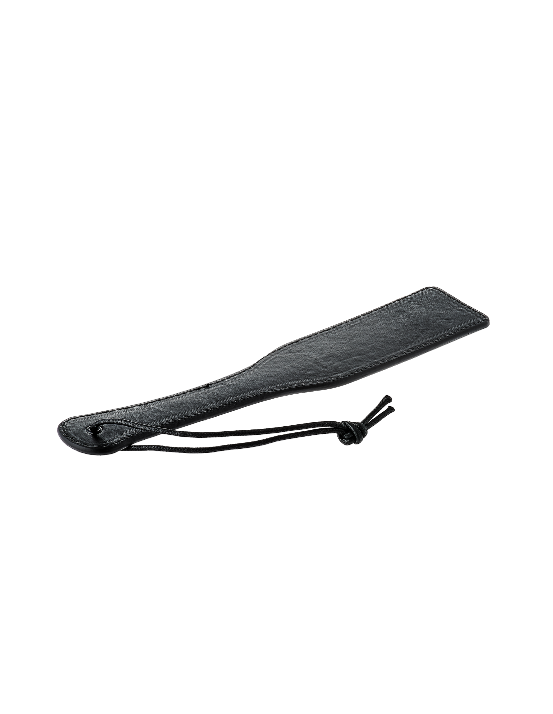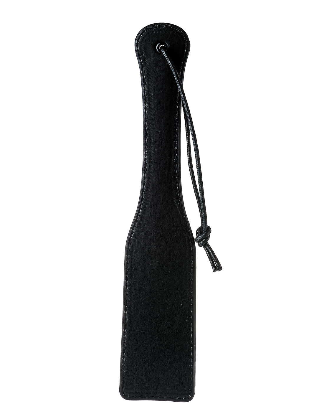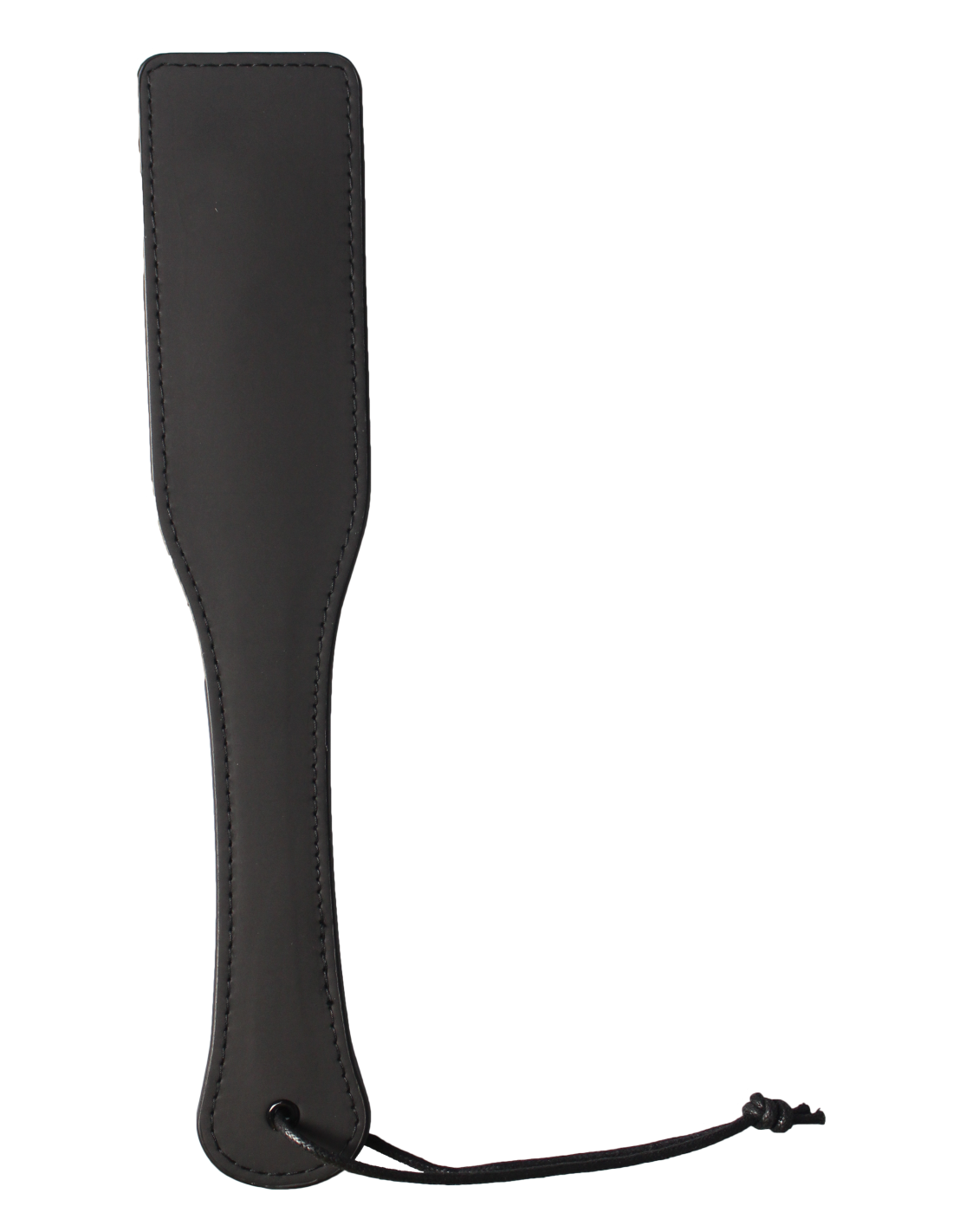 Esta paleta para jugar BDSM está hecha de material con apariencia de cuero negro en la parte delantera y una parte trasera lisa. Las diferentes texturas provocarán diferentes sensaciones. Tiene una cómoda correa para la muñeca. La paleta es ligeramente flexible para azotes suaves o firmes, úsela con cuidado.