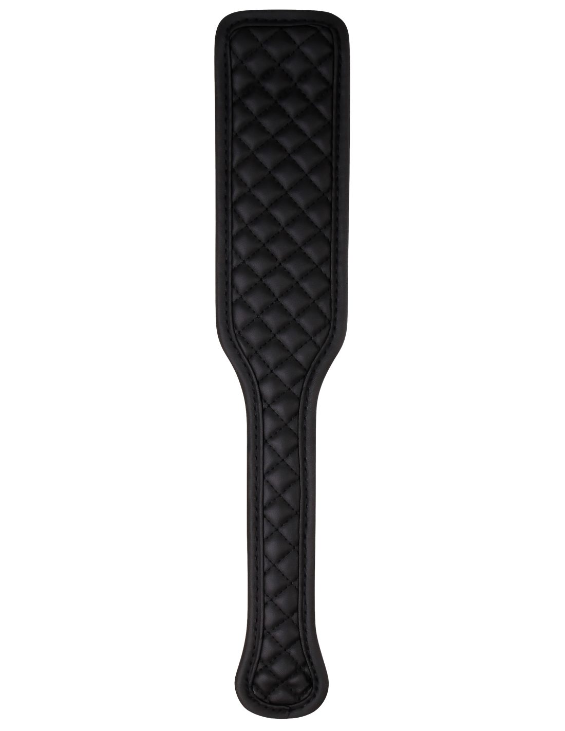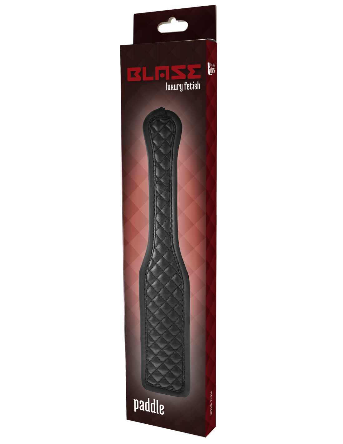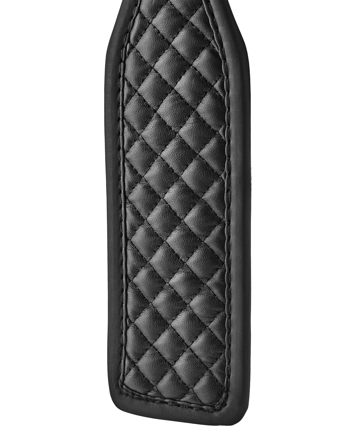 Esta paleta de la colección Blaze de productos bondage tiene un diseño acolchado con puntadas de diamantes negros en cuero vegano. Una paleta es imprescindible para todo amante del BDSM al que le gusten los azotes. La paleta es ligeramente flexible para azotes suaves o firmes, úsela con cuidado.