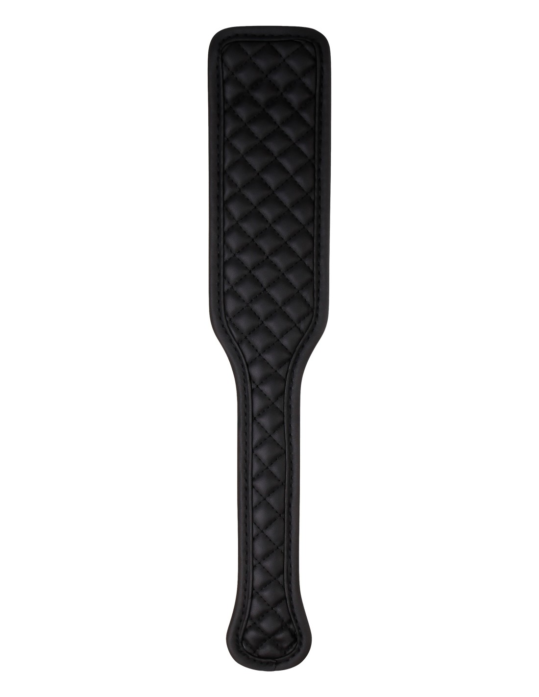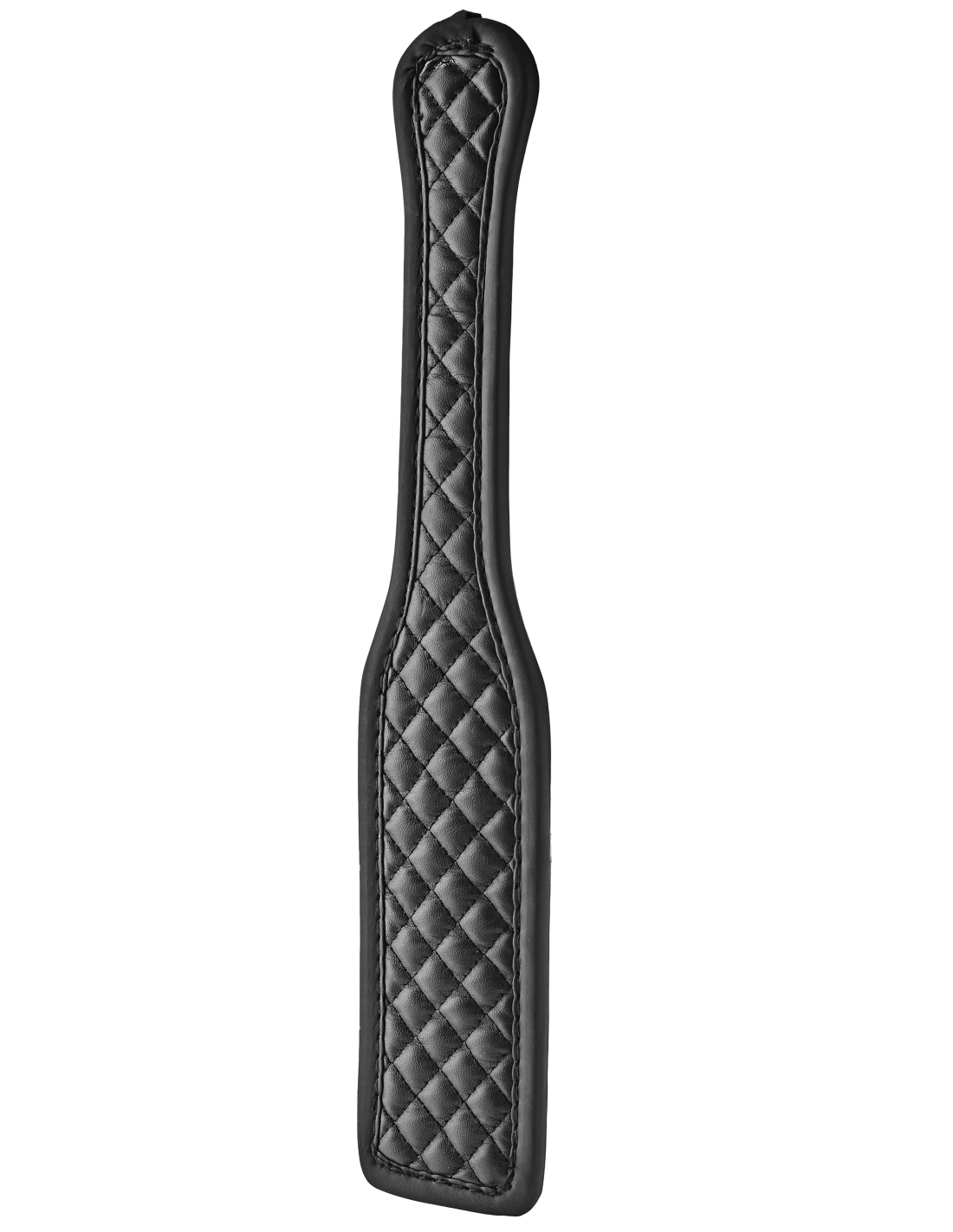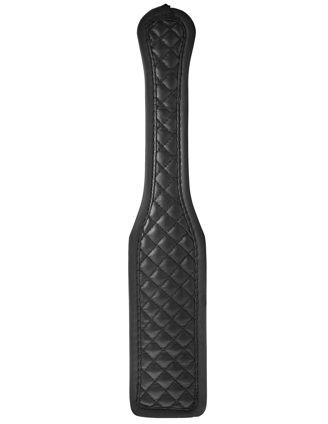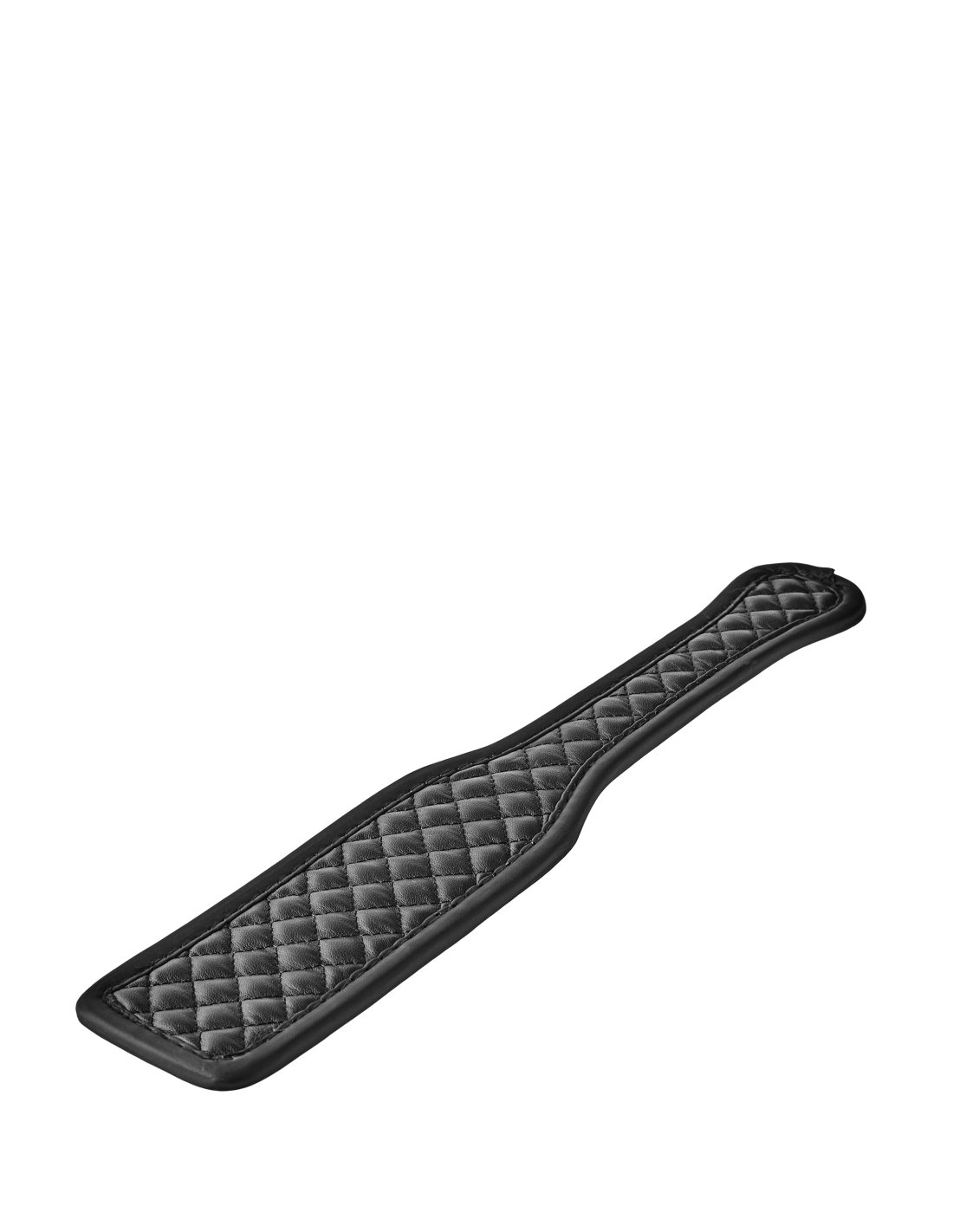 Esta paleta de la colección Blaze de productos bondage tiene un diseño acolchado con puntadas de diamantes negros en cuero vegano. Una paleta es imprescindible para todo amante del BDSM al que le gusten los azotes. La paleta es ligeramente flexible para azotes suaves o firmes, úsela con cuidado.