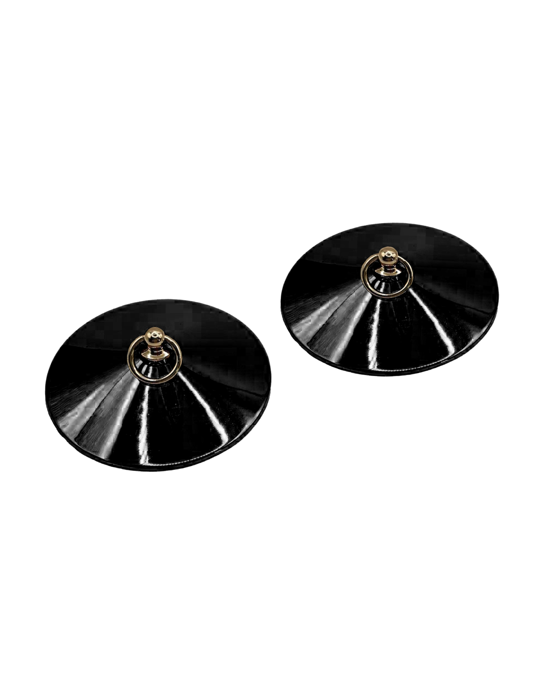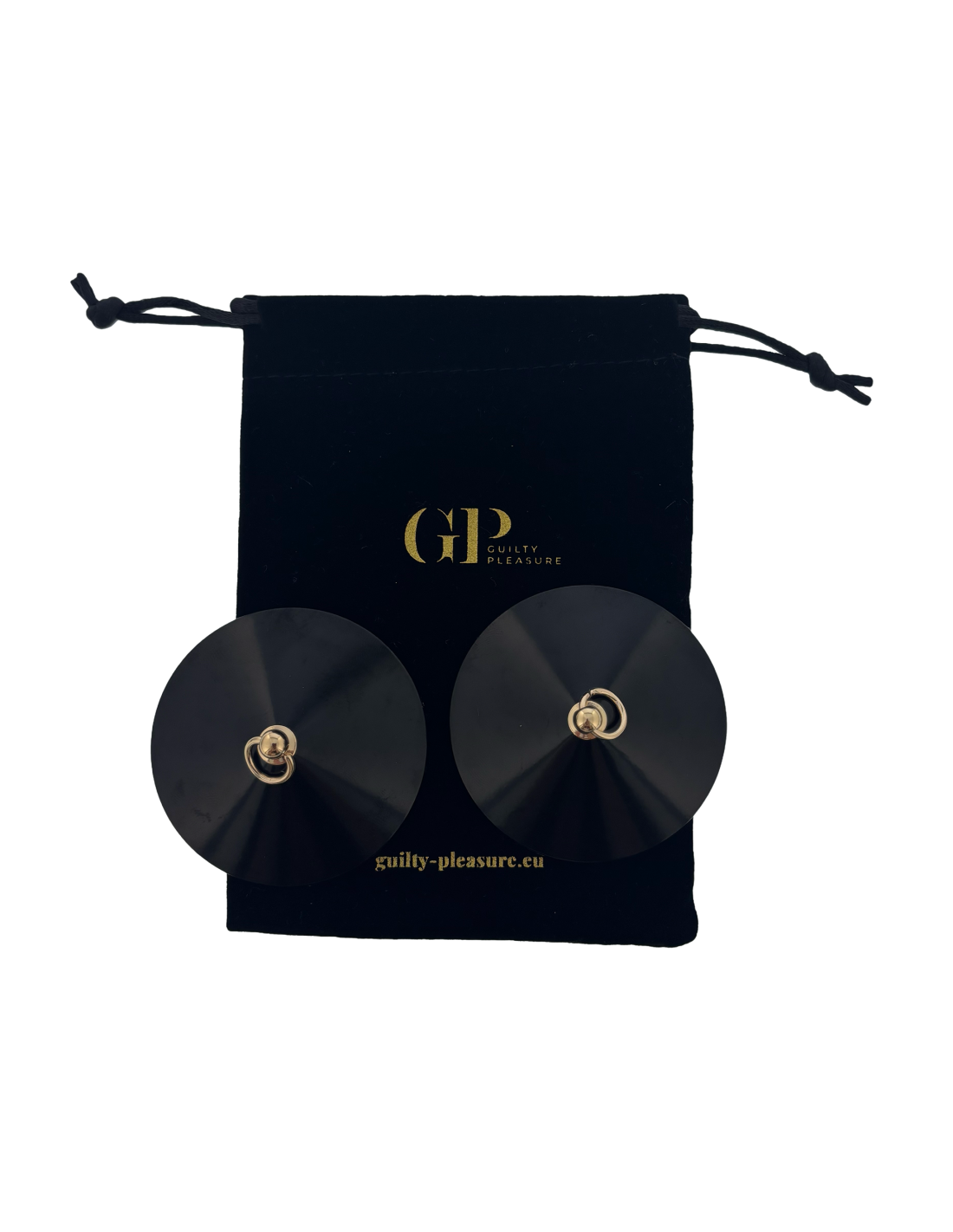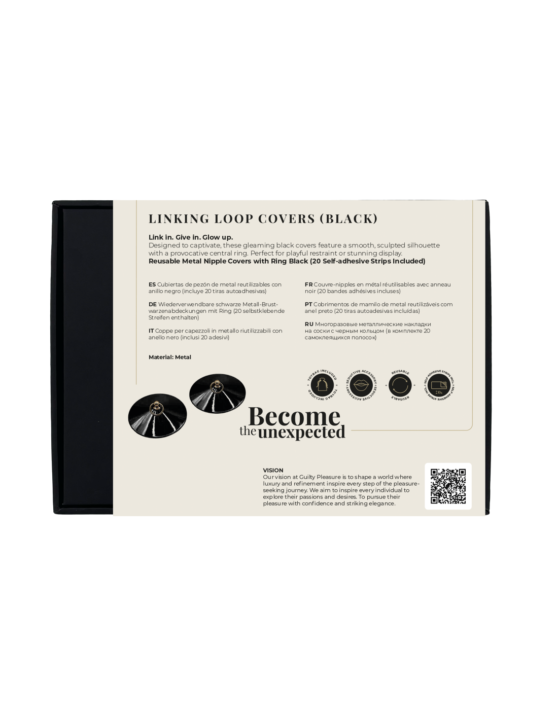Tentación dorada con un toque noir. Las fundas negras Linking Loop fusionan una elegancia audaz con una intención lúdica. Esculpidas en metal pulido en tonos negros y acabadas con un anillo central de color dorado, estas cubiertas de pezones reutilizables hacen una declaración dominante de contraste y control. Su silueta suave refleja la luz, mientras que el anillo ofrece un punto focal provocativo, que invita al estilo creativo o a la exploración táctil.