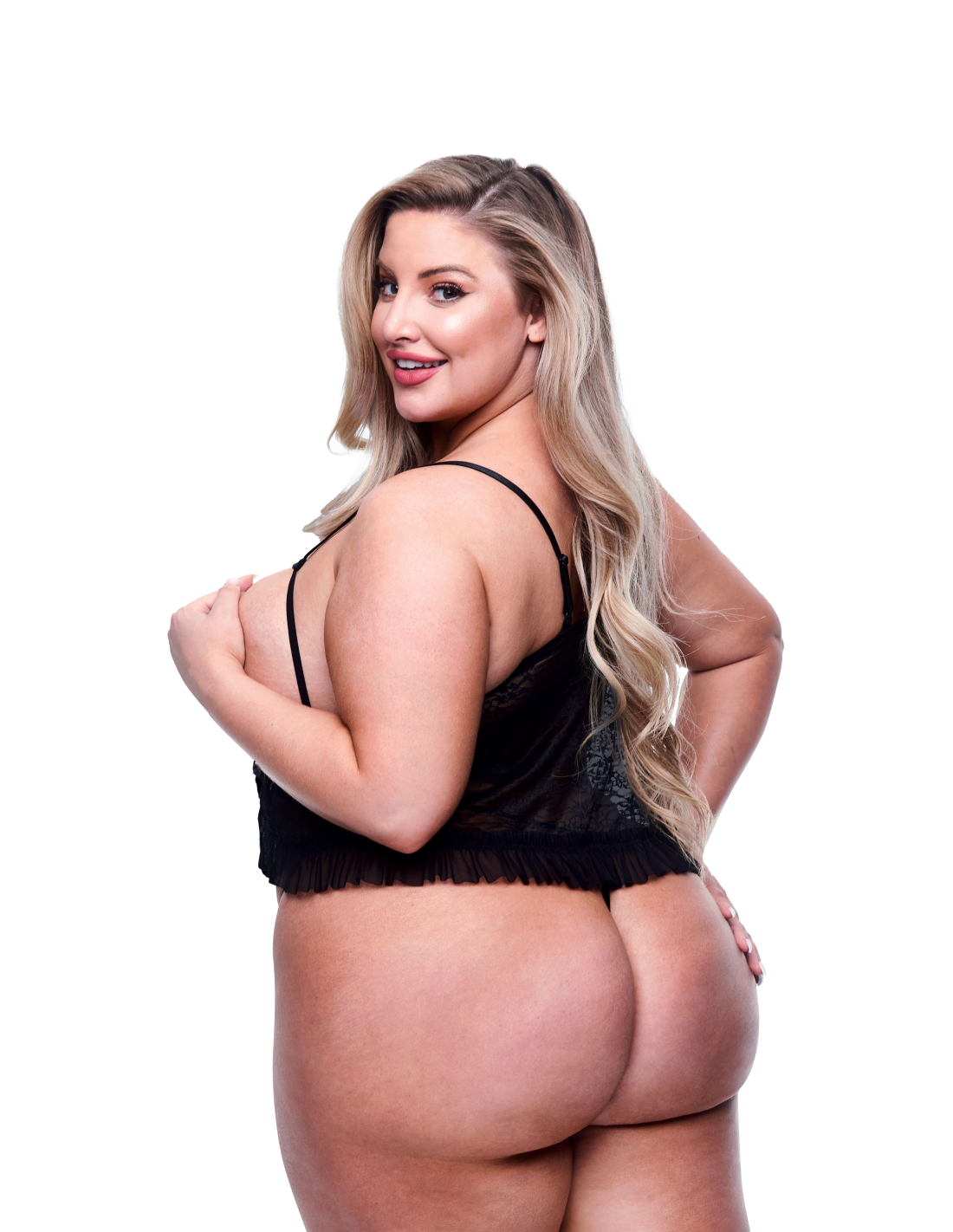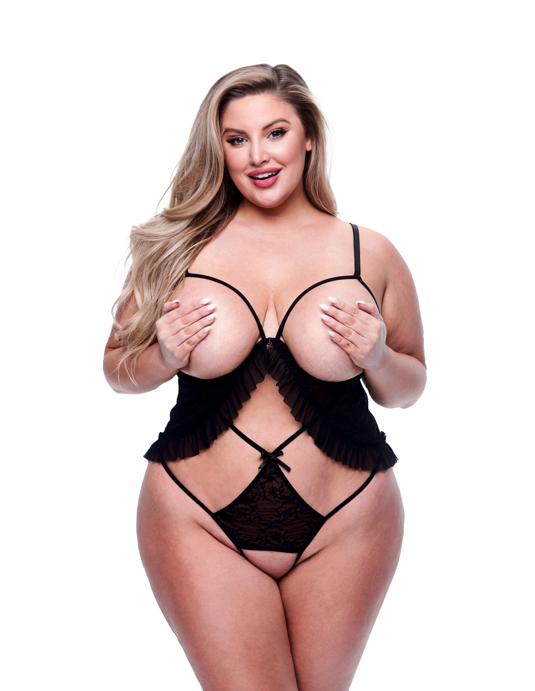 Disfrazado o informal: como elijas, ¡vístete TÚ con Baci! Pareja coqueta y luchadora junto con este peluche de tiras. El osito de peluche entrecruzado presenta copas abiertas tipo peek-a-boo con un corpiño ondulado diseñado en elegante encaje transparente con dobladillo con volantes, mientras que la braga sin entrepierna adjunta presenta dos tiras: una baja en las caderas y otra alta a lo largo del torso.