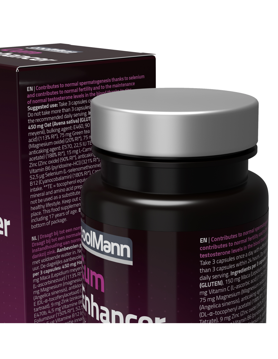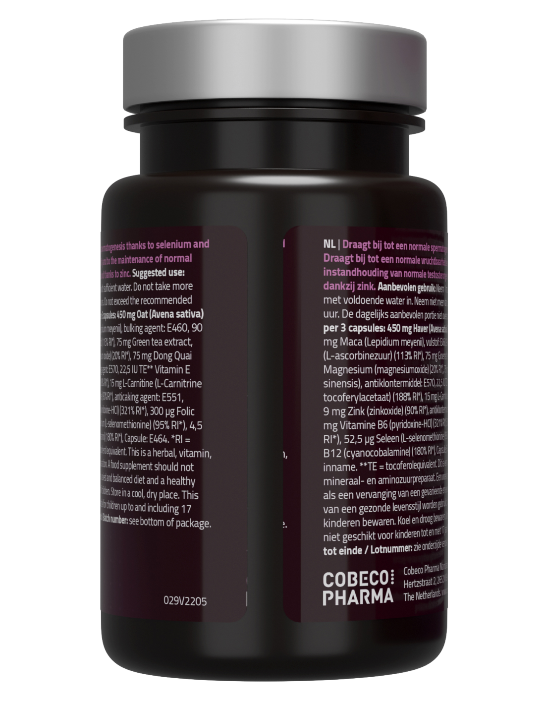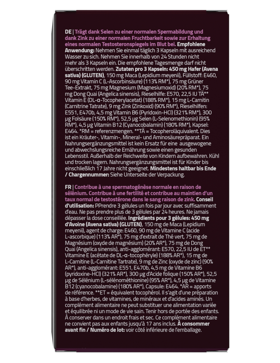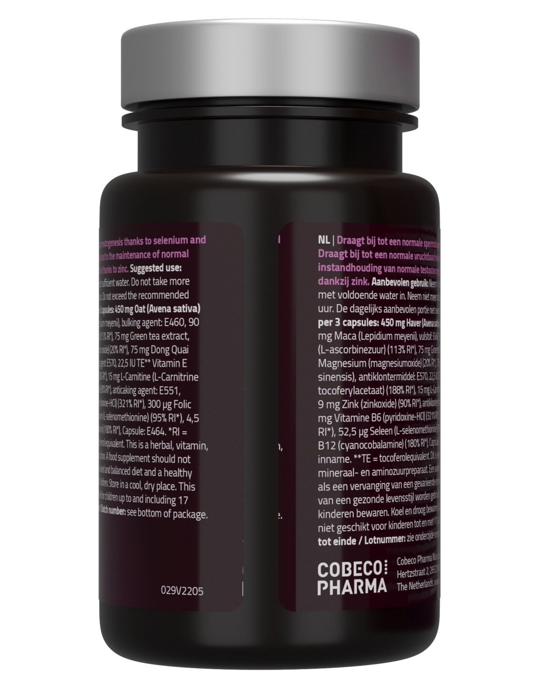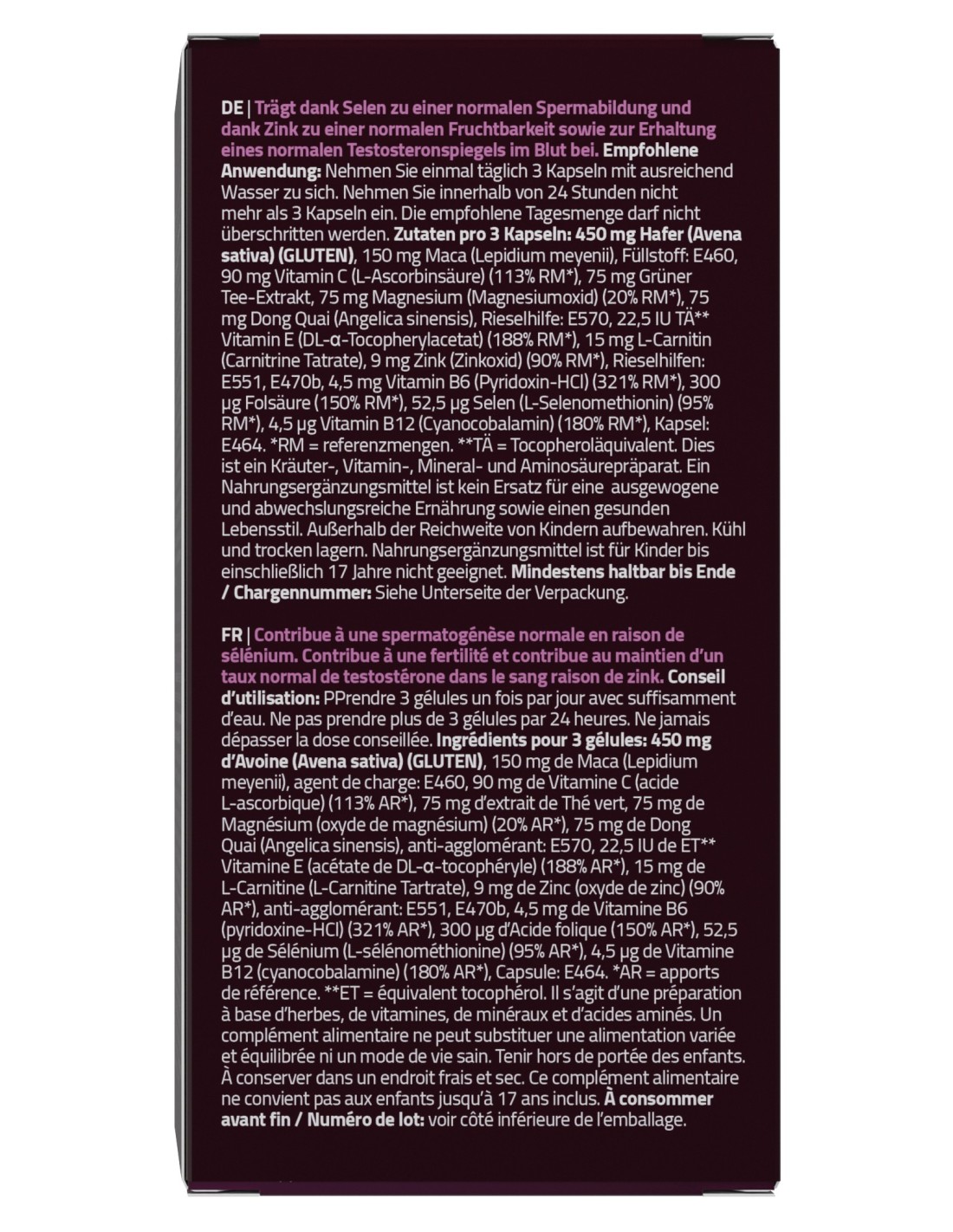 Las cápsulas, basadas en ingredientes naturales, apoyan la fertilidad, los órganos y el bienestar físico general del hombre. La fórmula equilibrada hace uso de las propiedades de los ingredientes Selenio, Zinc, Vitamina E, Maca y Dong Quai. El selenio contribuye a la espermatogénesis normal, la formación de espermatozoides. El selenio contiene antioxidantes y ayuda a proteger los componentes de las células del cuerpo, incluidos los espermatozoides, del daño oxidativo. No solo el selenio, sino también el zinc, la vitamina C y la vitamina E contribuyen a la protección de los componentes celulares contra el daño oxidativo. Además, el zinc contribuye a la fertilidad y reproducción normales en los hombres y también contribuye a un metabolismo normal de los ácidos grasos, para un equilibrio hormonal normal. El ácido fólico interviene en la producción de nuevas células corporales y contribuye a la división celular. El magnesio, la vitamina B6 y B12 y la vitamina C añadidos contribuyen a un metabolismo energético normal. El magnesio, la vitamina B6 y la vitamina C también contribuyen al funcionamiento normal del sistema nervioso y, por lo tanto, pueden contribuir a una sensación energética y vital.