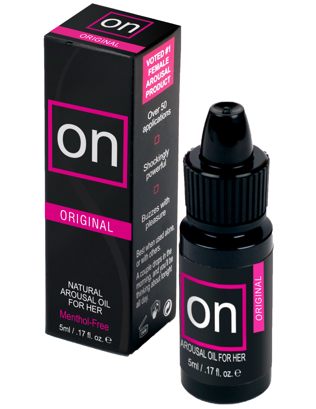 On™ Original Arousal Oil crea una sensación excitante que palpita y hace vibrar el clítoris. Sorprendentemente poderoso. Zumba de placer. Diseñado para mejorar la intimidad, On Original™ aumenta la intensidad del orgasmo, mejora la sensibilidad del clítoris, alarga la duración y la frecuencia del placer. On™ está hecho con una mezcla botánica natural de aceites esenciales para crear sensaciones de excitación natural y puede aumentar la autolubricación en la mayoría de los usuarios.