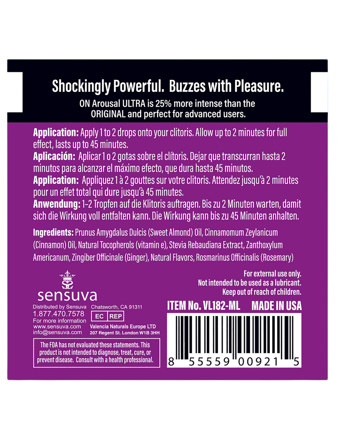 On™ Ultra Arousal Oil crea una sensación excitante que palpita y hace vibrar el clítoris. Sorprendentemente poderoso. Zumba de placer. On™ Ultra es un 25% más intenso que el ORIGINAL. On™ está hecho con una mezcla botánica natural de aceites esenciales para crear sensaciones de excitación natural y puede aumentar la autolubricación en la mayoría de los usuarios.