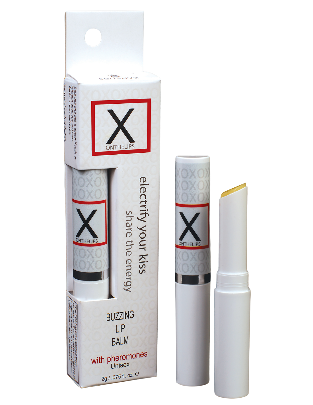 Aplícalo en tus labios y disfruta del zumbido cálido y electrizante que sientes. Las feromonas están diseñadas para hacerte sentir atractivo y excitado (¡además de atraer a otra persona!). Acércate a tu pareja y dale un beso en los labios. En cuestión de segundos, comenzarán a sentir una sensación de zumbido y hormigueo en los labios. ¡Será el beso más memorable de su vida! CÓMO USARLO Aplícalo en tus labios y disfruta del zumbido cálido y electrizante que sientes. Las feromonas están diseñadas para hacerte sentir atractivo y excitado (¡además de atraer a otra persona!). Acércate a tu pareja y dale un beso en los labios. En cuestión de segundos, comenzarán a sentir una sensación de zumbido y hormigueo en los labios. ¡Será el beso más memorable de su vida! BUENO SABER -Está hecho con ingredientes botánicos y aceites esenciales 100% naturales. Ha sido infundido con feromonas para hacer que la persona que lo usa se sienta sexy y ayudar a atraer a alguien para besarlo. -¡Es amigable con el género! La mezcla de feromonas atrae tanto a hombres como a mujeres, por lo que funciona tanto para parejas homosexuales como heterosexuales. -Se puede utilizar para primeros besos, ocasiones especiales e incluso para uso diario! -Es seguro y placentero usarlo durante el sexo oral. -Es un excelente humectante labial diario. -No contiene mentol, L-Arginina, glicerina ni parabenos.