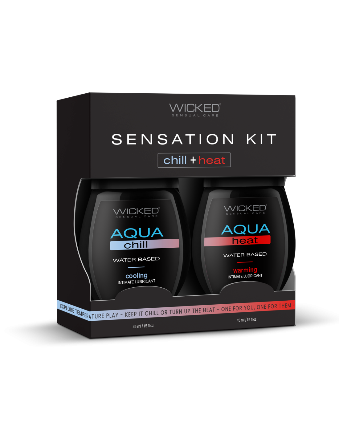 Mantenlo relajado Y sube la temperatura con nuestro sensual Kit de Sensaciones.La combinación de lubricantes a base de agua Aqua Heat y Aqua Chill es una nueva y excelente forma de explorar la intimidad con tu pareja.