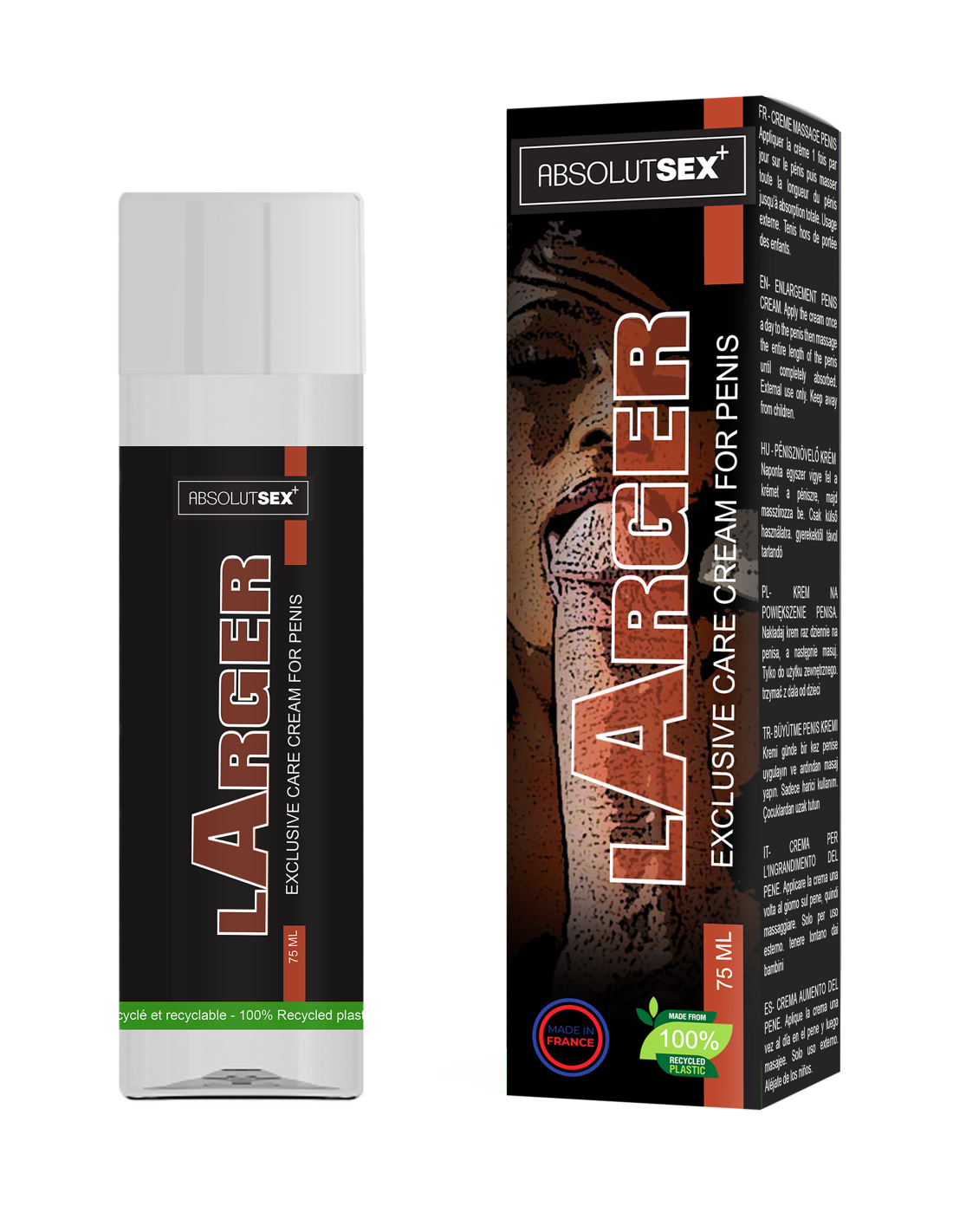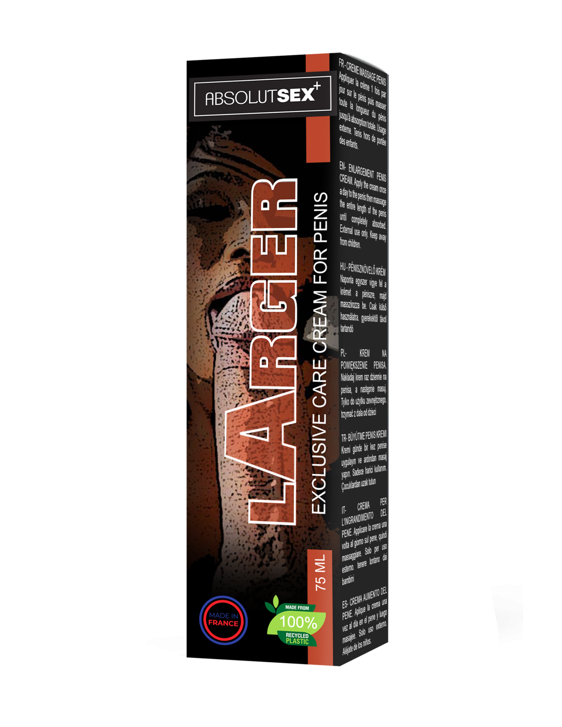 Larger es una crema para agrandar con olor agradable de la marca absolutsex de Ruf. Compuesto principalmente por Jengibre por su efecto afrodisíaco y fenogreco para potenciar el bienestar sexual. La alholva es una de las mejores hierbas naturales para las cuestiones eréctiles y la libido. Algunos consideran que tiene la capacidad de favorecer los niveles naturales de testosterona (saponinas y sapogeninas).
